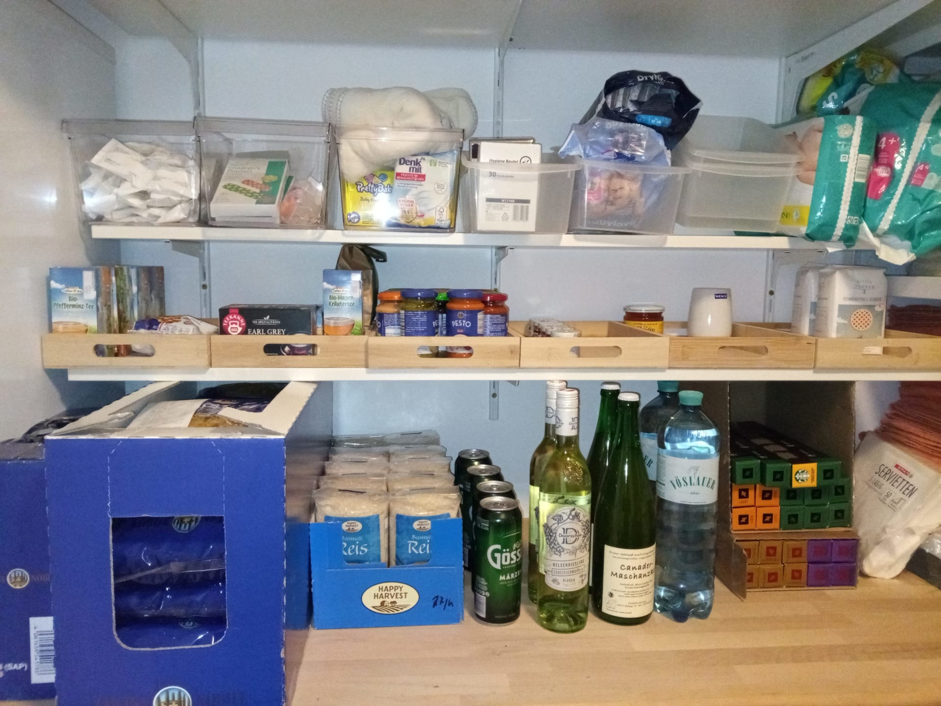 Butter, Marmelade, Honig, Löskaffee, Nespressokapseln, Tee, Milch, Eier,