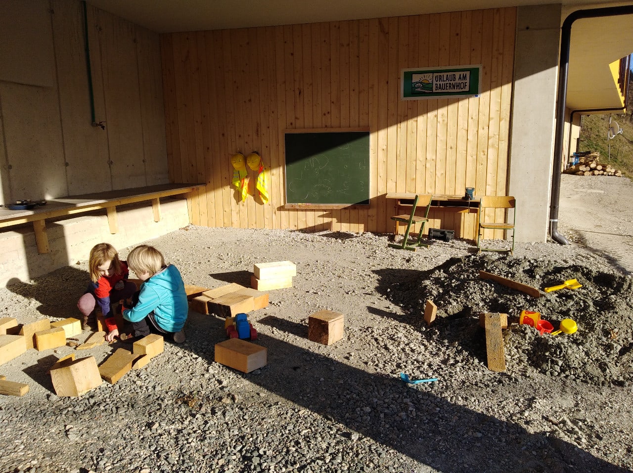 Überdachte Kinderbaustelle wo Kinder graben und mit Holz spielen können und zusätzlich ein kleiner Spielplatz.