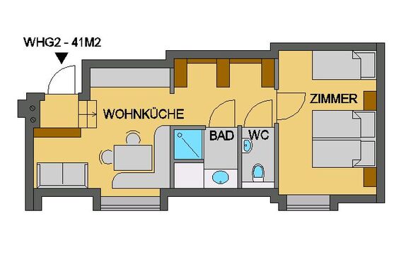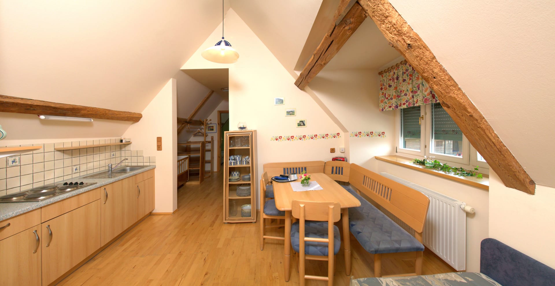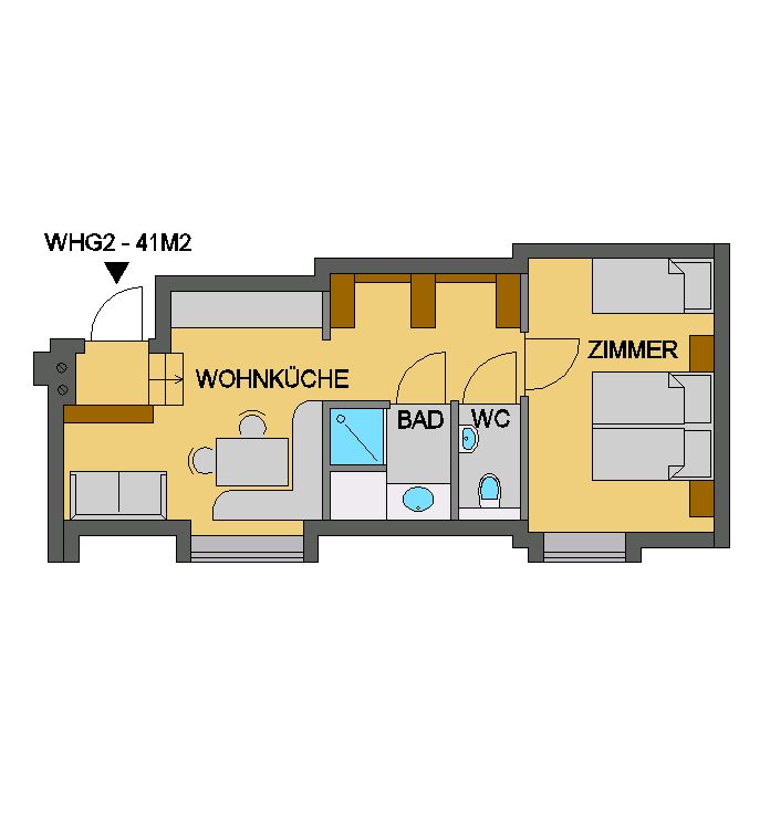 Sonnenseitige Wohnung, ca. 50m², 2 getrennte Schlafzimmer, Vollholzmöbel, Kuschelecke, volleingerichtete Küche mit Essbereich, begehbarer Kleiderschrank, Dusche und WC getrennt