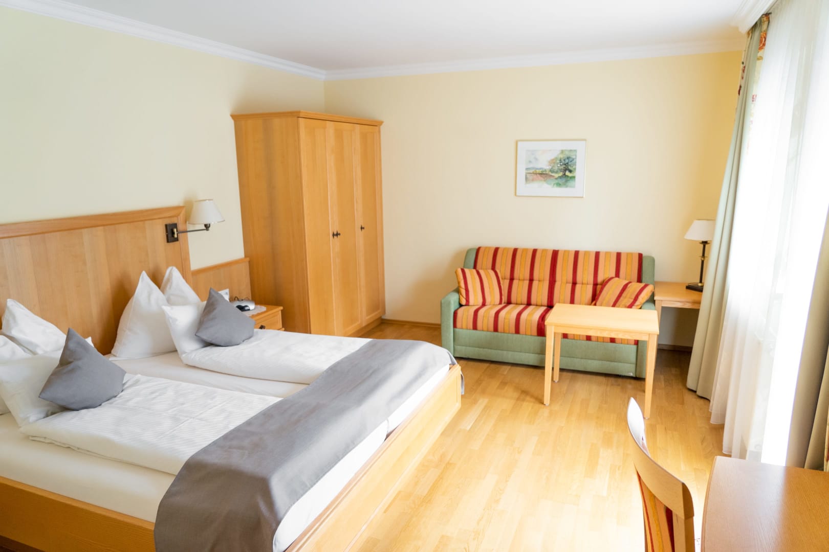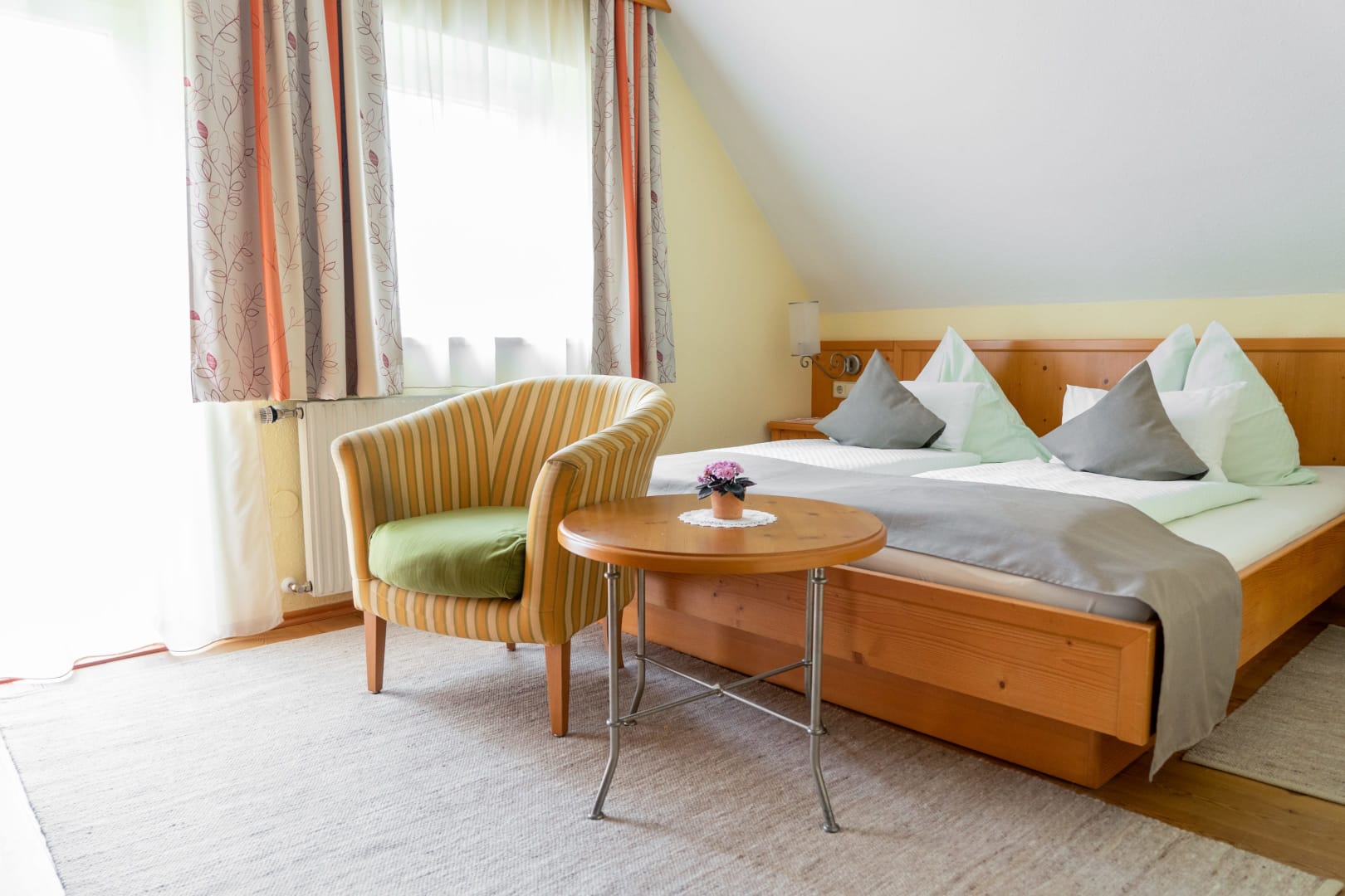 Unsere gemütlichen Zimmern im Haupthaus und im Gästehaus bieten Ihnen allen Komfort. Durch die liebevolle Ausstattung mit Holzmöbeln und Parkettböden entsteht eine heimelige Atmosphäre. Neben Du/WC stehen Ihnen Sat-TV, Radio, Telefon und W-Lan zur Verfügung.