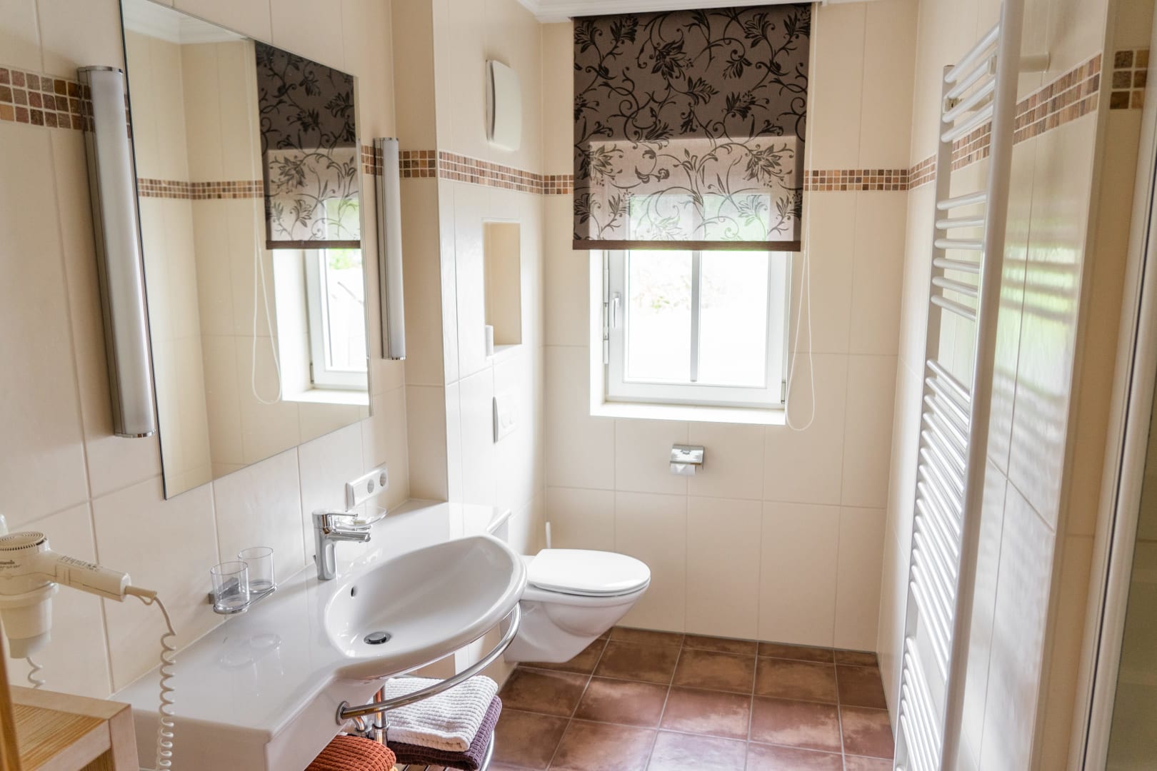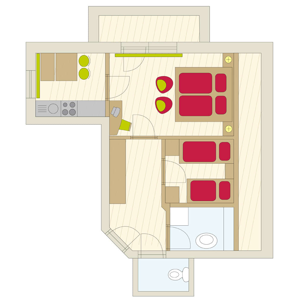 Unsere Ferienwohnung im 2. Stock im Haupthaus hat 50m² und besteht aus folgenden Räumlichkeiten: Schlafzimmer, Kinderzimmer, Küche, Bad, WC, Vorraum, Balkon. Neben der gediegenen Einrichtung ist vor allem die Lage (nach Südwesten in den Obstgarten) etwas besonderes.