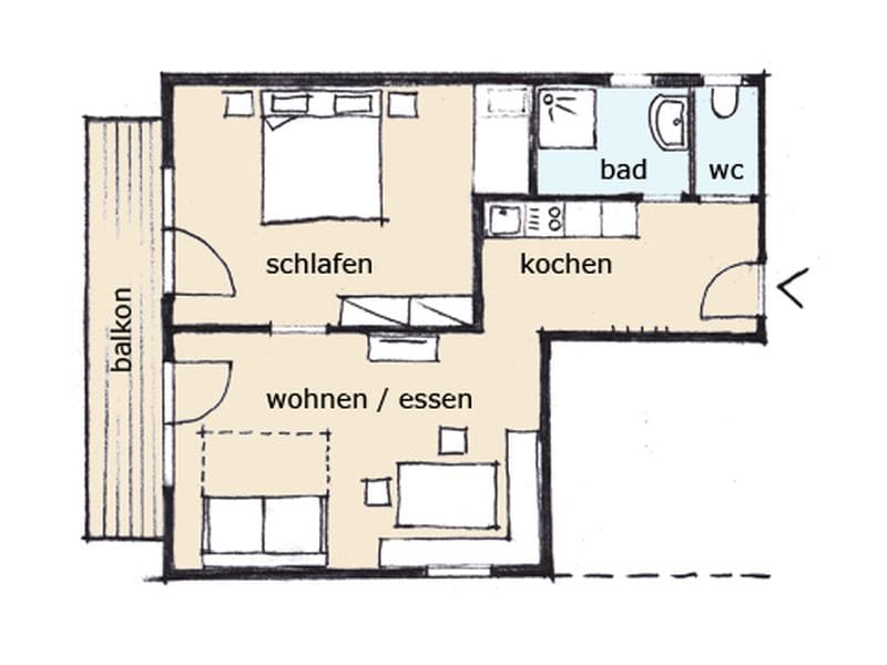 Für kleine junge Familien oder Paare ist die Wohnung ideal. Ein Schlafzimmer mit Doppelbett und ein integriertes Gitterbett, sowie einem gemütlichen Klappbett-Sofa bieten fürs Schlafen genug Platz.