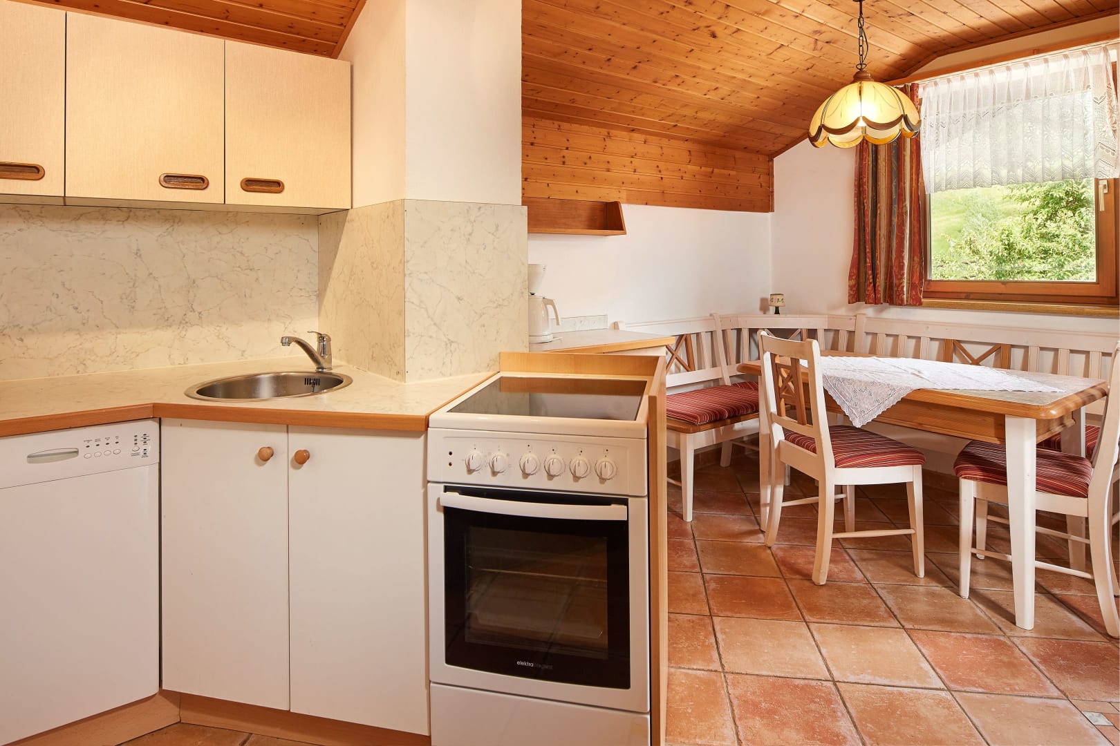 Appartement Stoder im Bauernhaus, ca. 75 m² für 4 Personen; Vorhaus, Dusche, WC, 2 Schlafzimmer mit Doppelbett - Südbalkon, nette Wohnküche mit 4-Plattenherd und Backrohr, Geschirrspüler, Kühlschrank mit Gefrierteil, Kaffeemaschine und Wasserkocher. Sofa und Kabel-TV, Wlan; herrlich freie Aussicht auf die Schladminger Tauern Bergwelt
