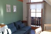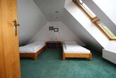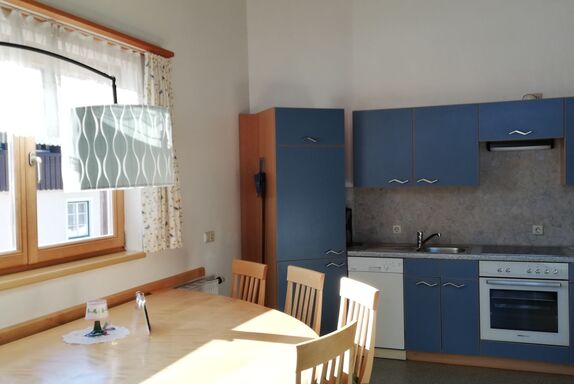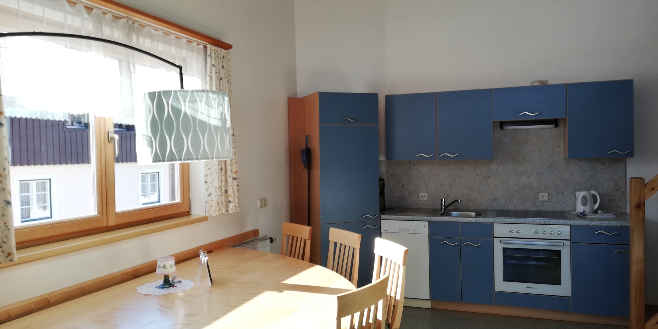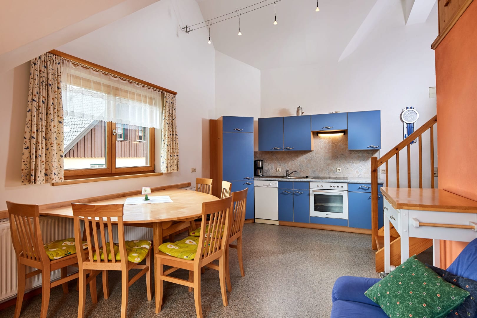 Appartement Kreuzgiebel im Abenteuerhaus, ca. 80m² für 6 Personen; Diele, Dusche, WC, 3 Schlafzimmer mit je 2 Betten. Der Kreuzgiebel-Dachstuhl schafft eine besondere Atmosphäre in der Wohnküche mit den Spielhäusern. 4-Plattenherd mit Backrohr, Geschirrspüler, Kühlschrank mit Gefrierteil, Kaffeemaschine, Wasserkocher, Sofa, Kabel-TV und Wlan tragen zu Ihrem Wohlbefinden bei.