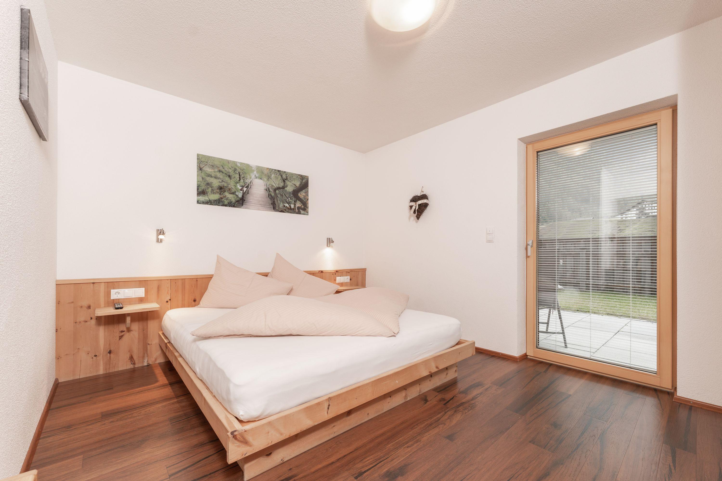 Wohlfühlplatz auf 25 m². Die Einraumsuite verfügt über 1 Schlafraum mit Zirbenholz-Doppelbett, Badezimmer mit DU/WC, Schreibtisch mit Sitzgelegenheit, Kitchenette und direktem Zugang zur Garten-Terrasse.