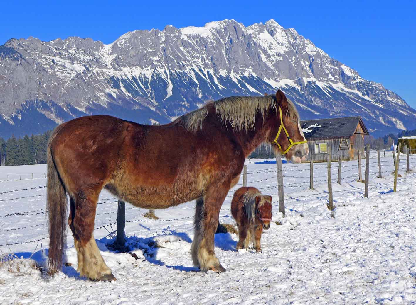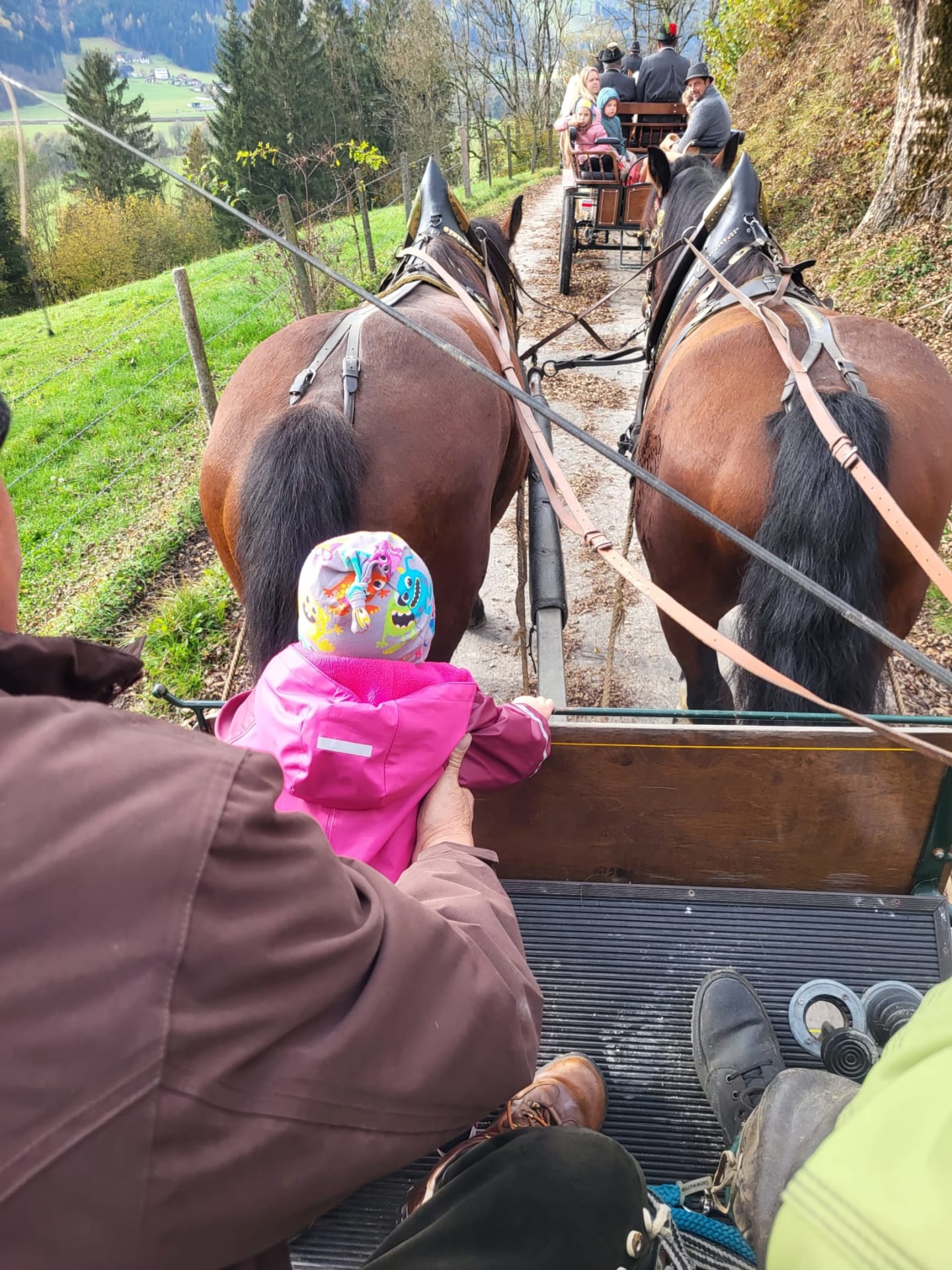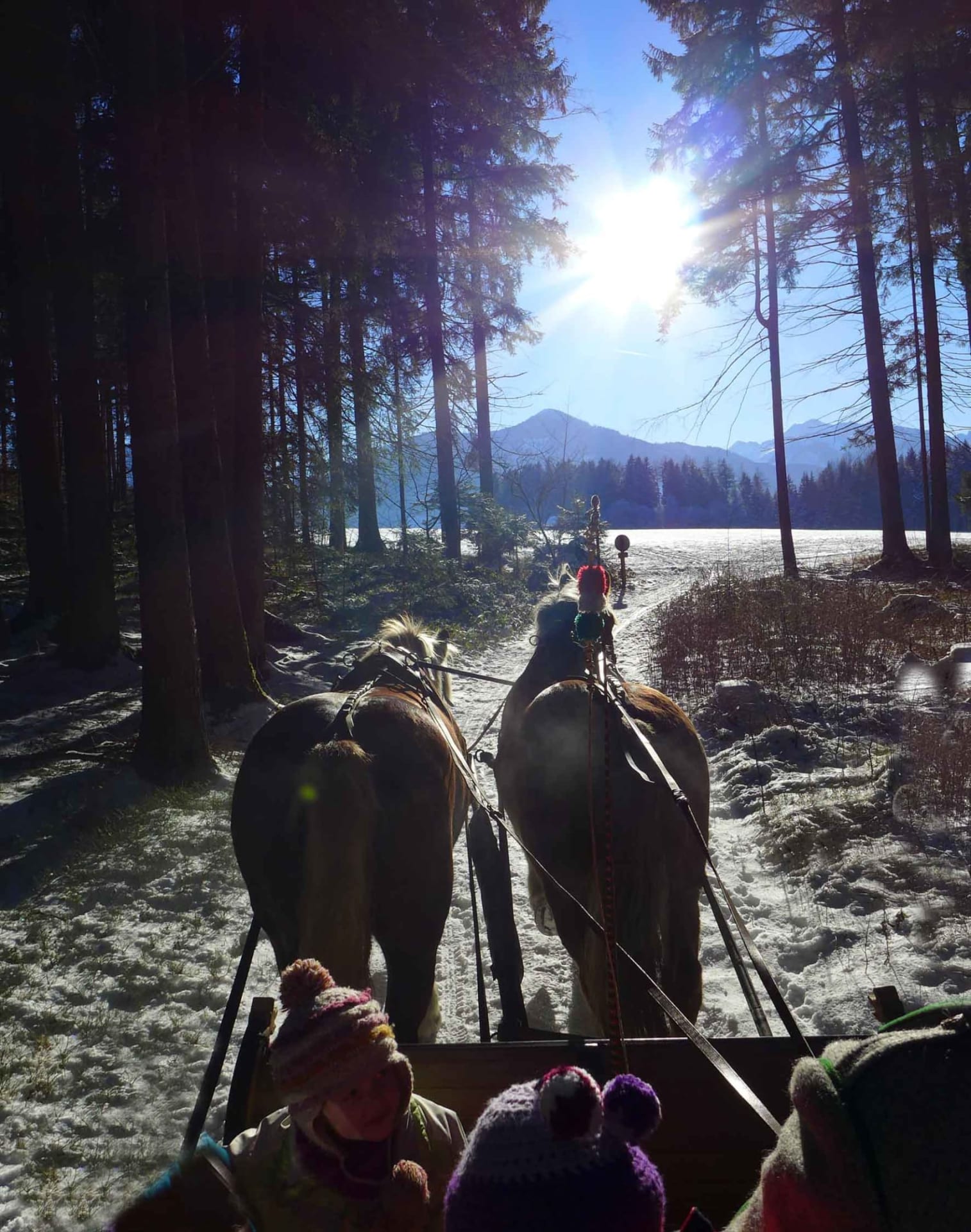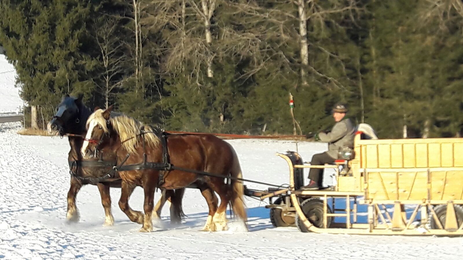 Mit unseren Norikern Belli und Lora kutschieren wir Sie gerne mit dem Pferdeschlitten durch unsere romantische Winterlandschaft.