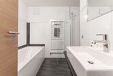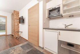 Wohlfühlplatz auf 78 m²: 2 getrennte Schlafräumen mit Zirbenholz-Doppelbetten, einem Sofa als Zusatzbett (2 Pers.), 2 getrennte Bäder mit DU/WC, Bad mit Badewanne, großer Wohnraum mit Sitzecke, Schreibtisch und Sitzgelegenheit, 2 getrennte Kitchenetten, Garten-Terrasse, im Erdgeschoß mit direktem Zugang zum Parkplatz.