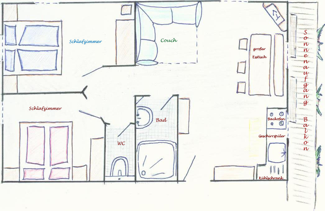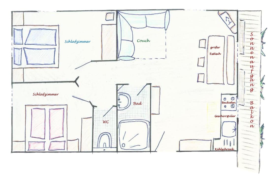 Gemütliche Wohnküche mit Essgruppe, Polstersitzecke mit Schlafmöglichkeit, Kochnische mit E-Herd und Backrohr, Geschirrspüler, Kühlschrank, Kaffeemaschine u. Cafissimoautomat, Kabel-TV und Internetzugang, WLAN, WC und Dusche, 2 Doppelzimmer und Balkon. Inklusive Bettwäsche, Hand- und Badetücher, Strom, Heizung.