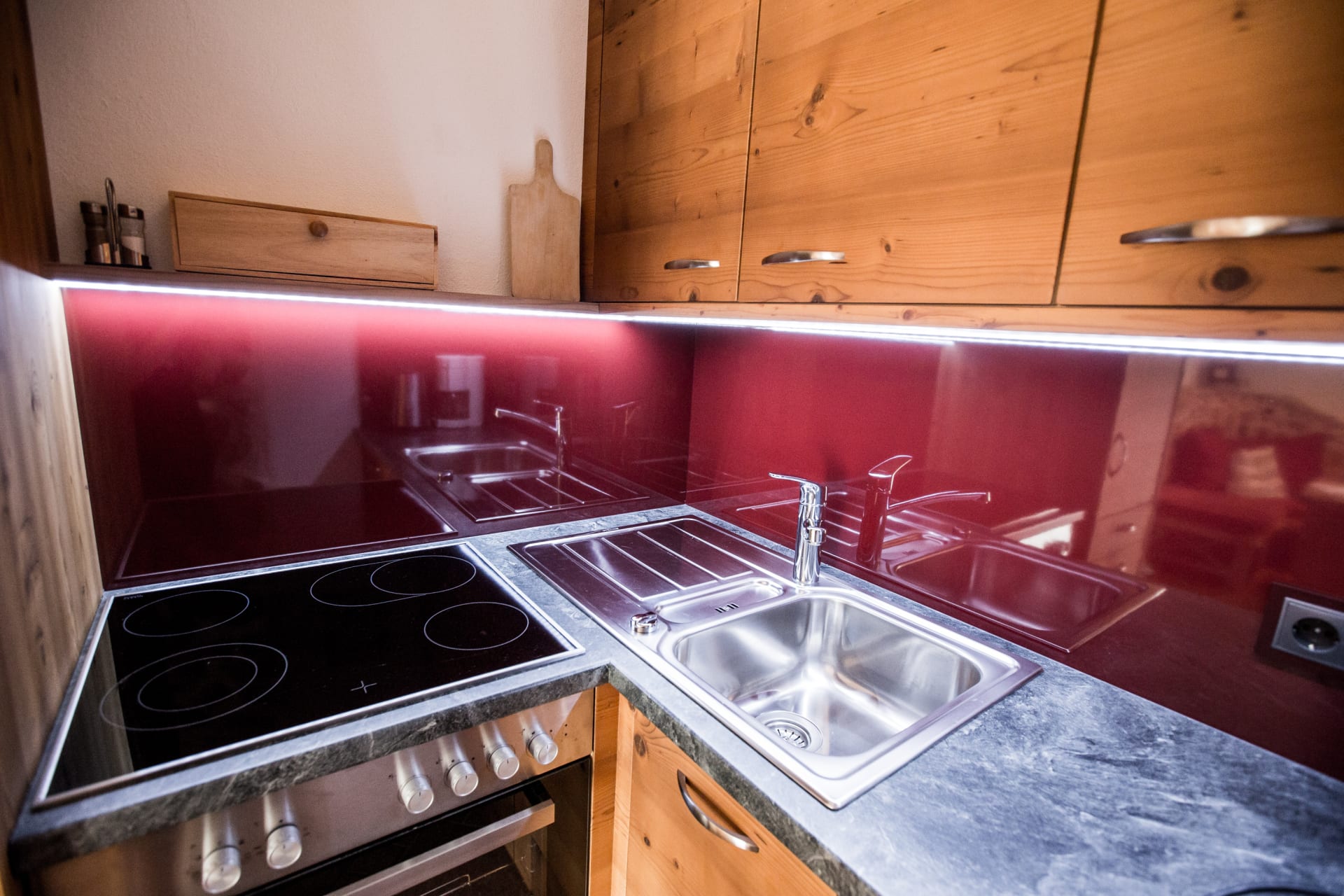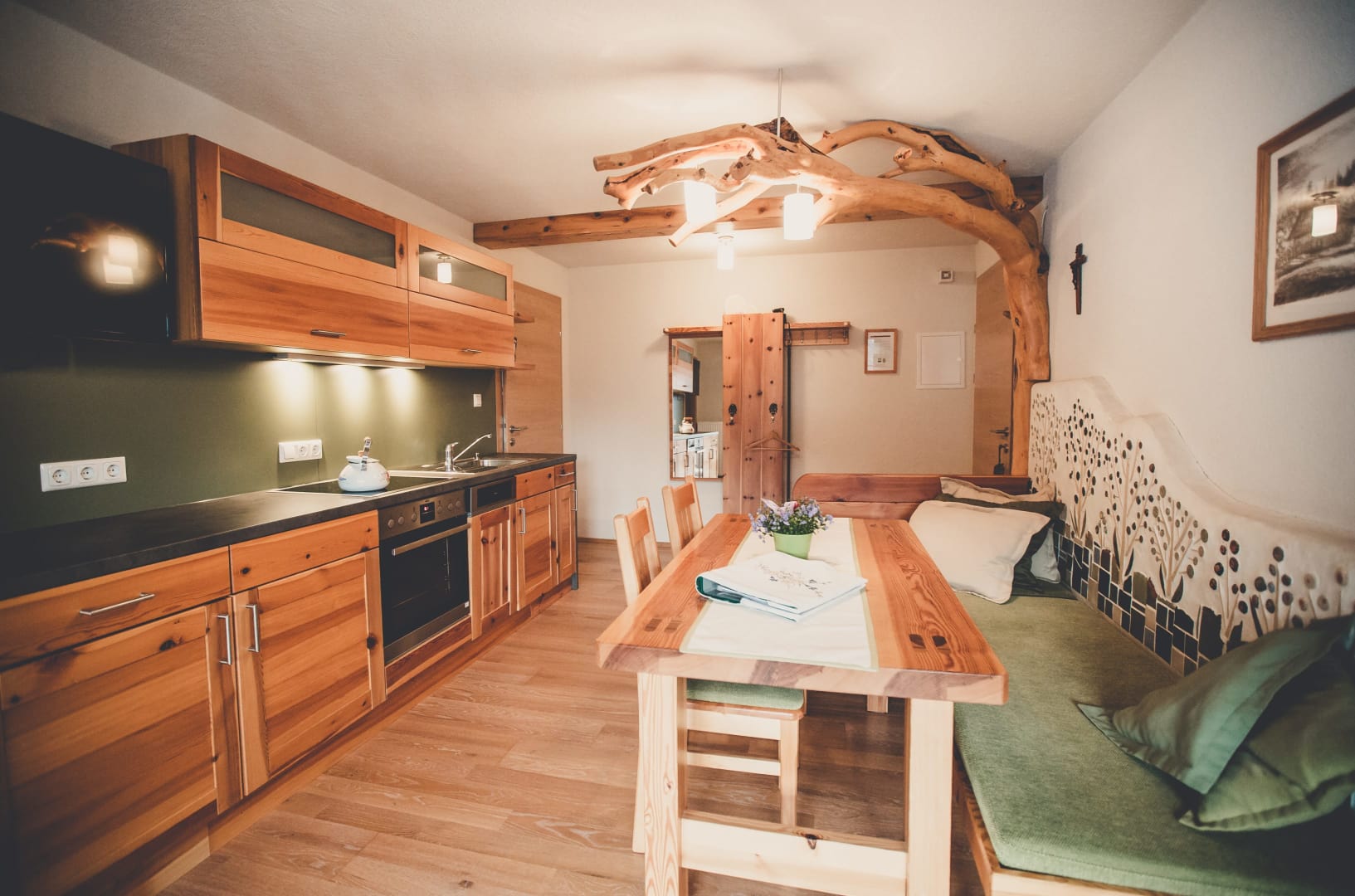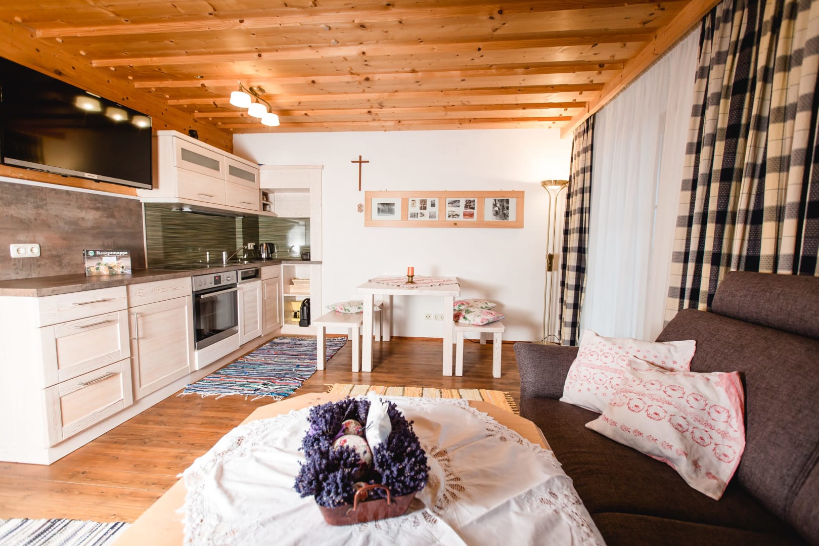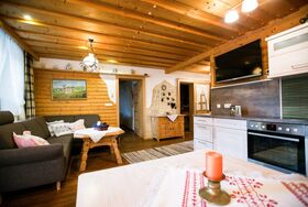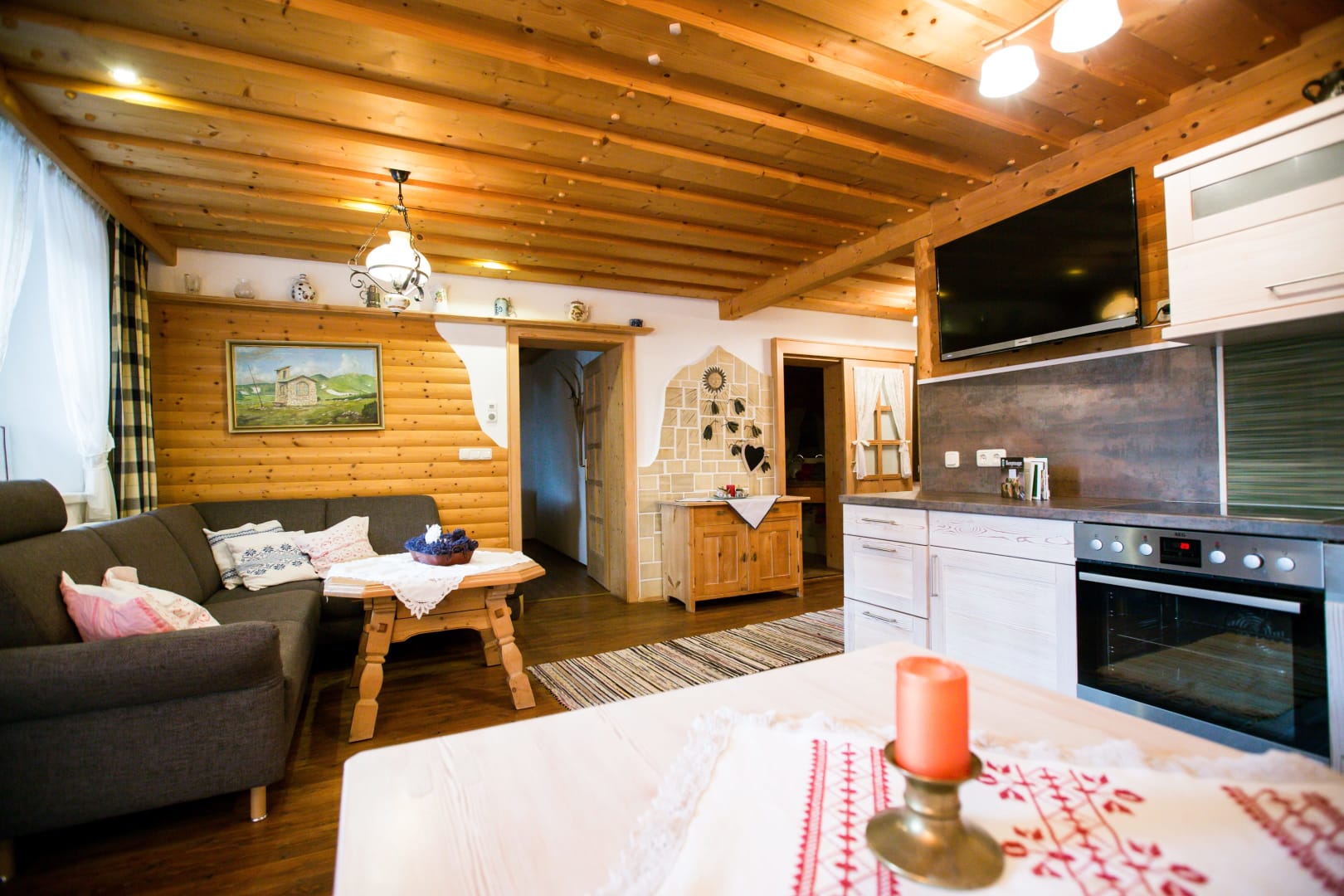 • einem gemütlichen Wohnraum mit Kachlewand, voll ausgestattete Küche,