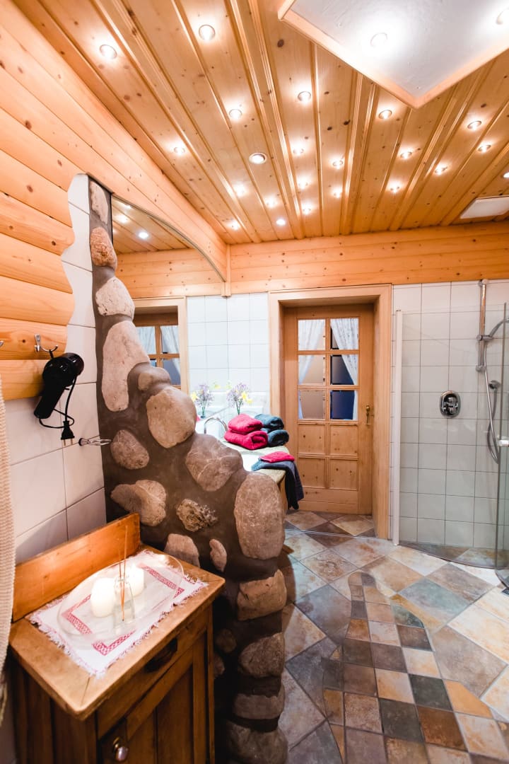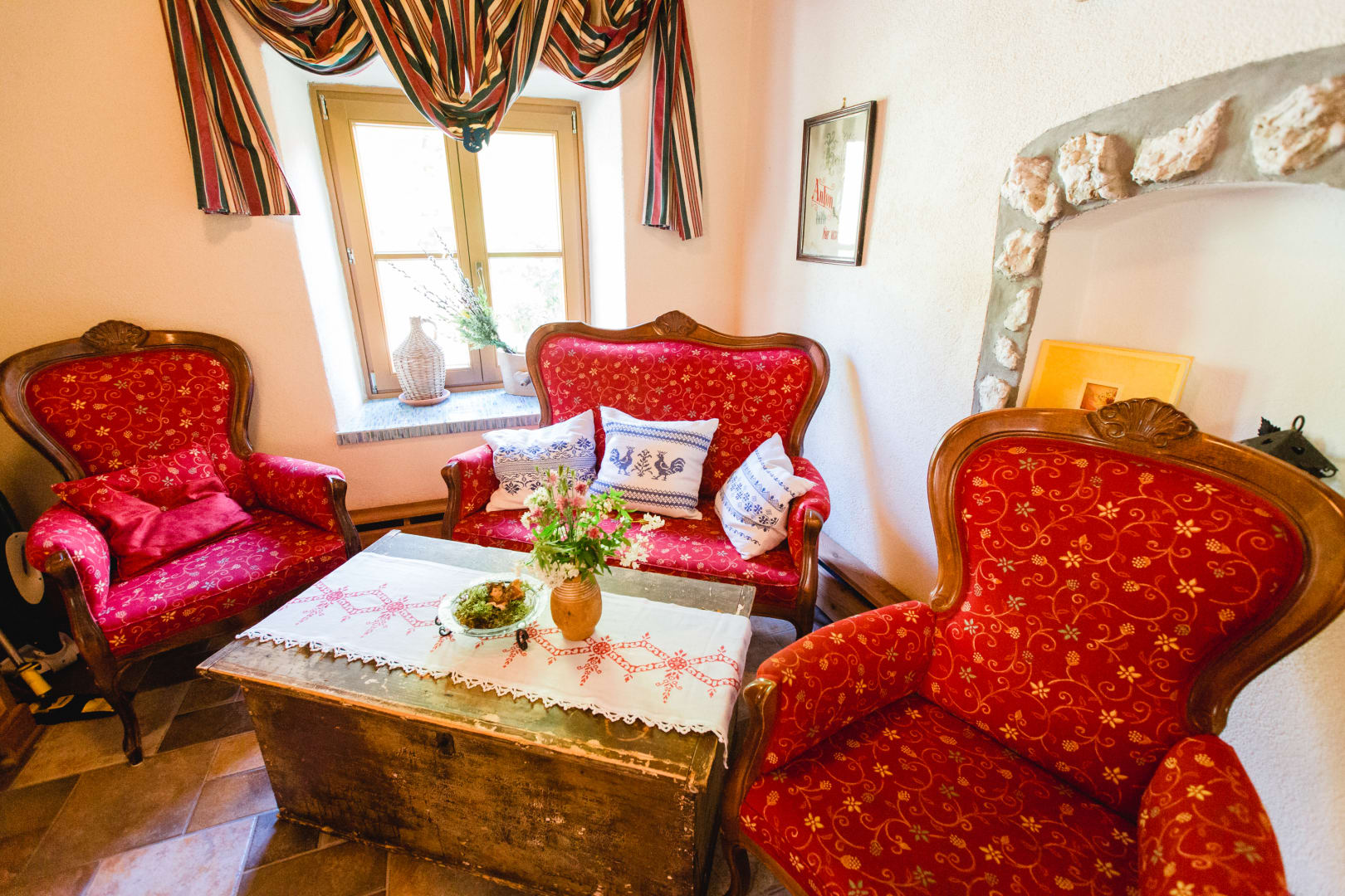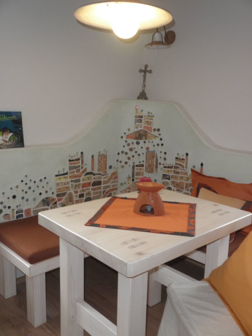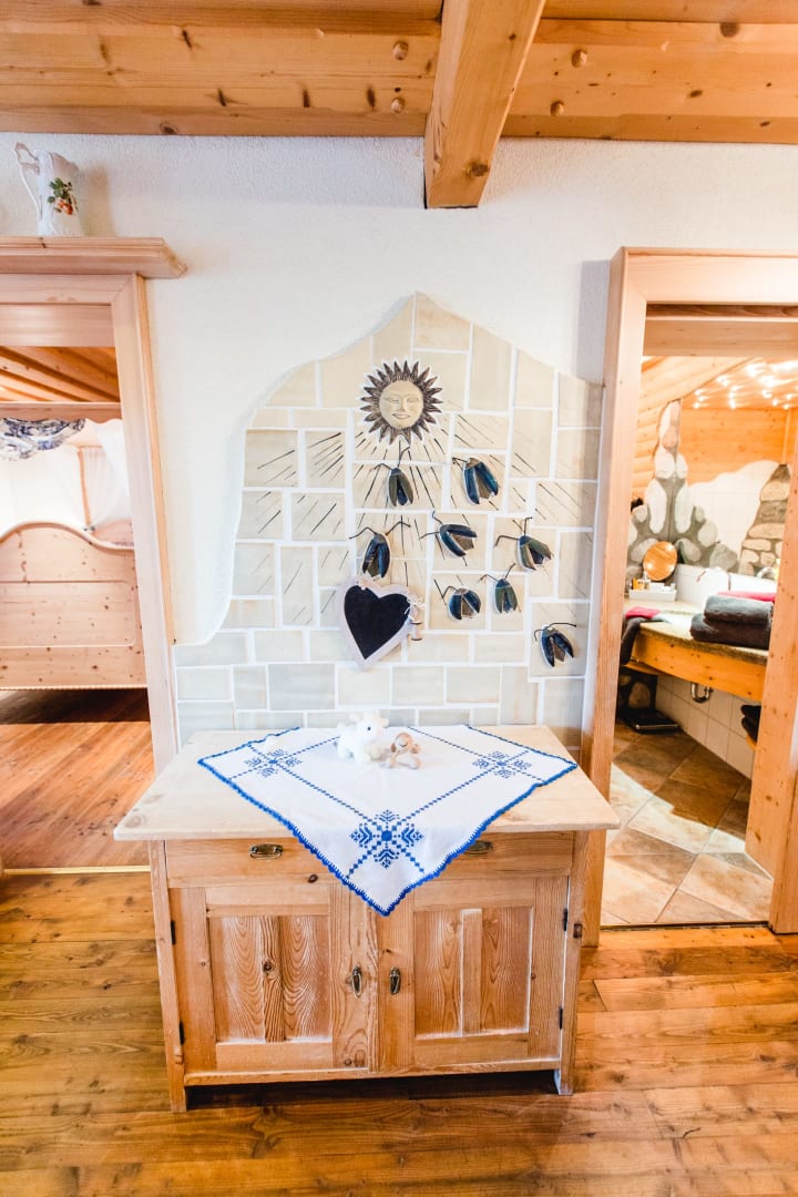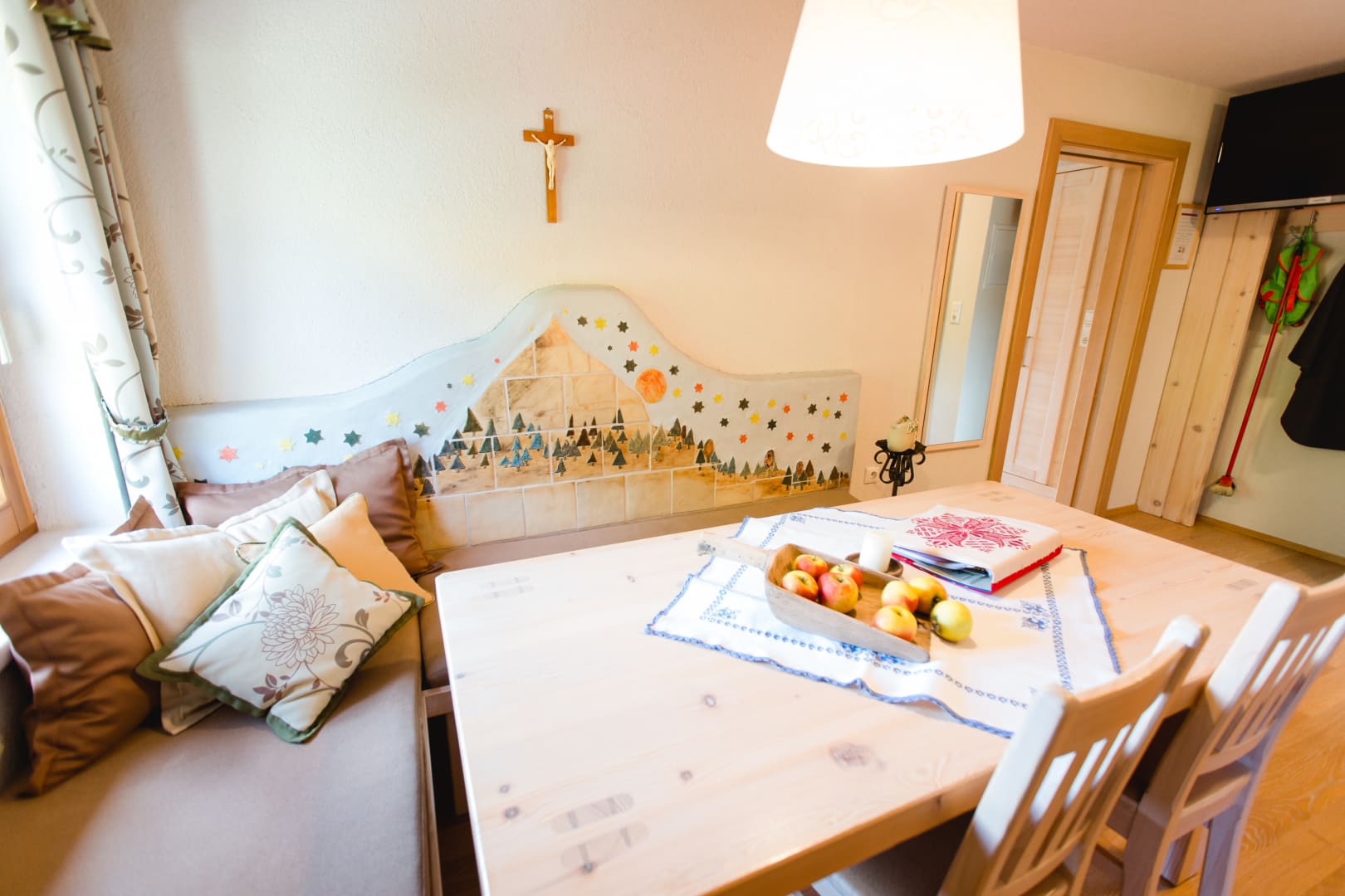 • einem gemütlichen Wohnraum mit Kachlewand, voll ausgestattete Küche,