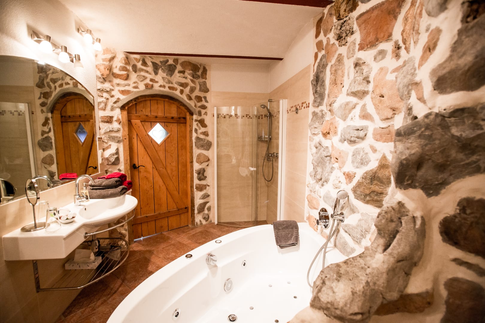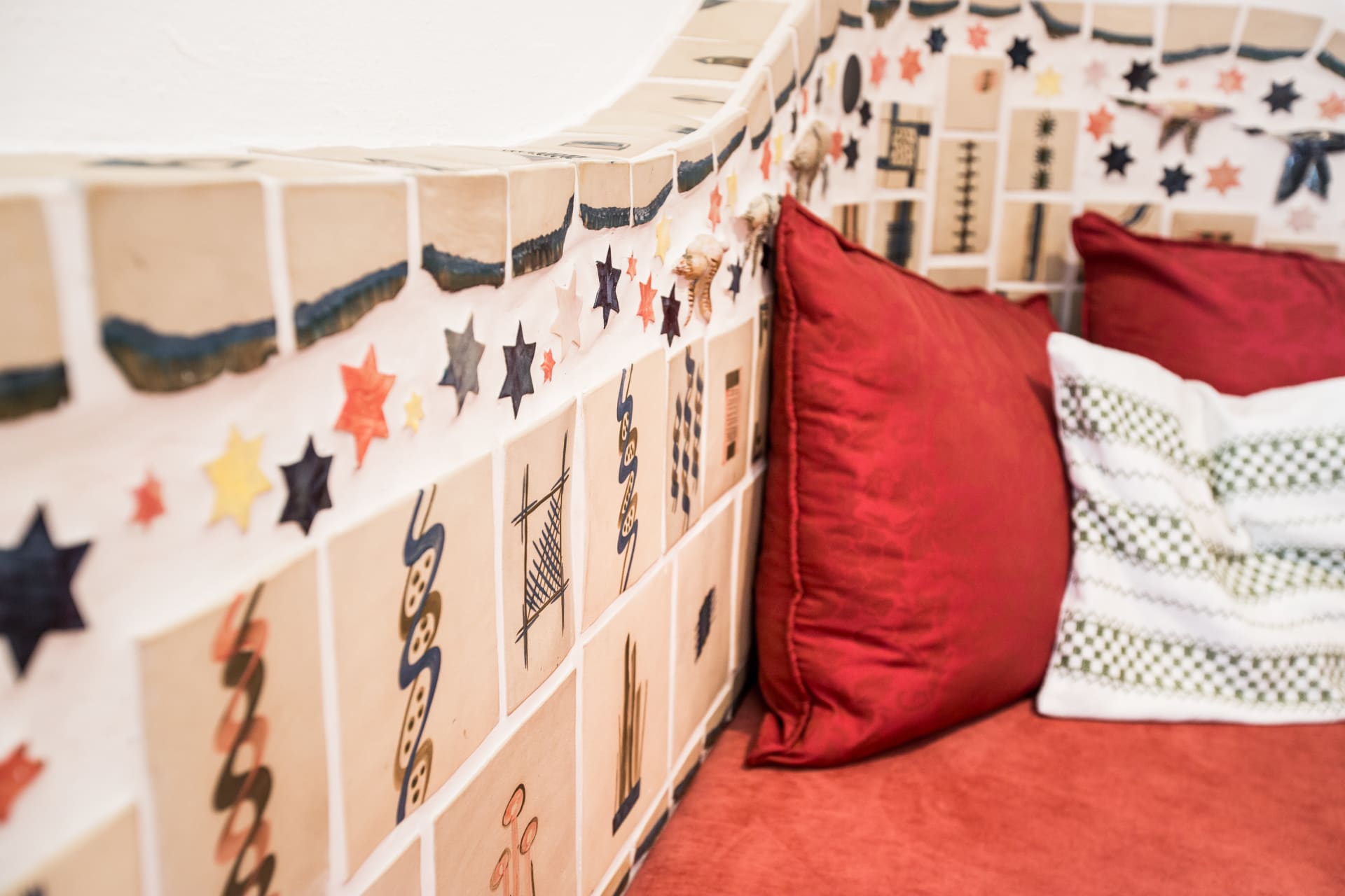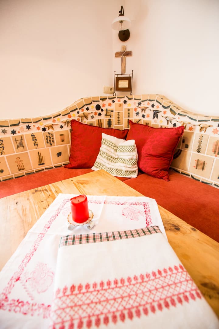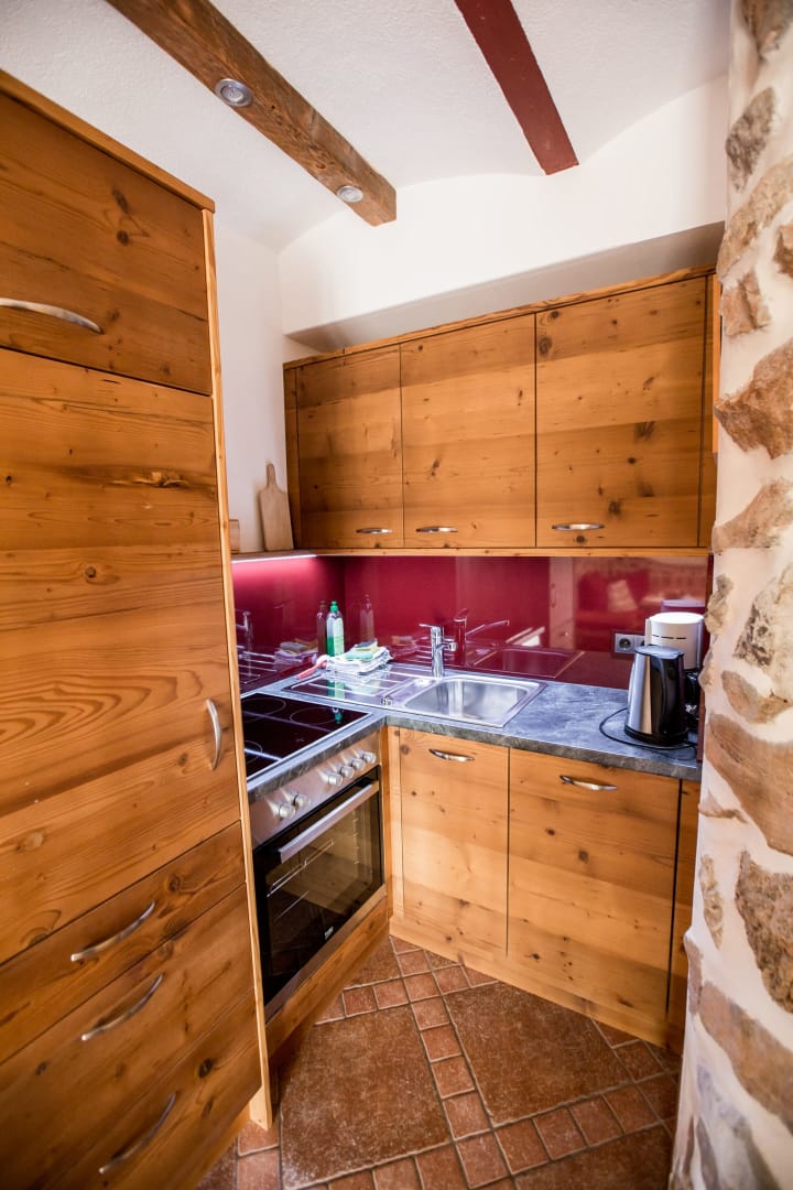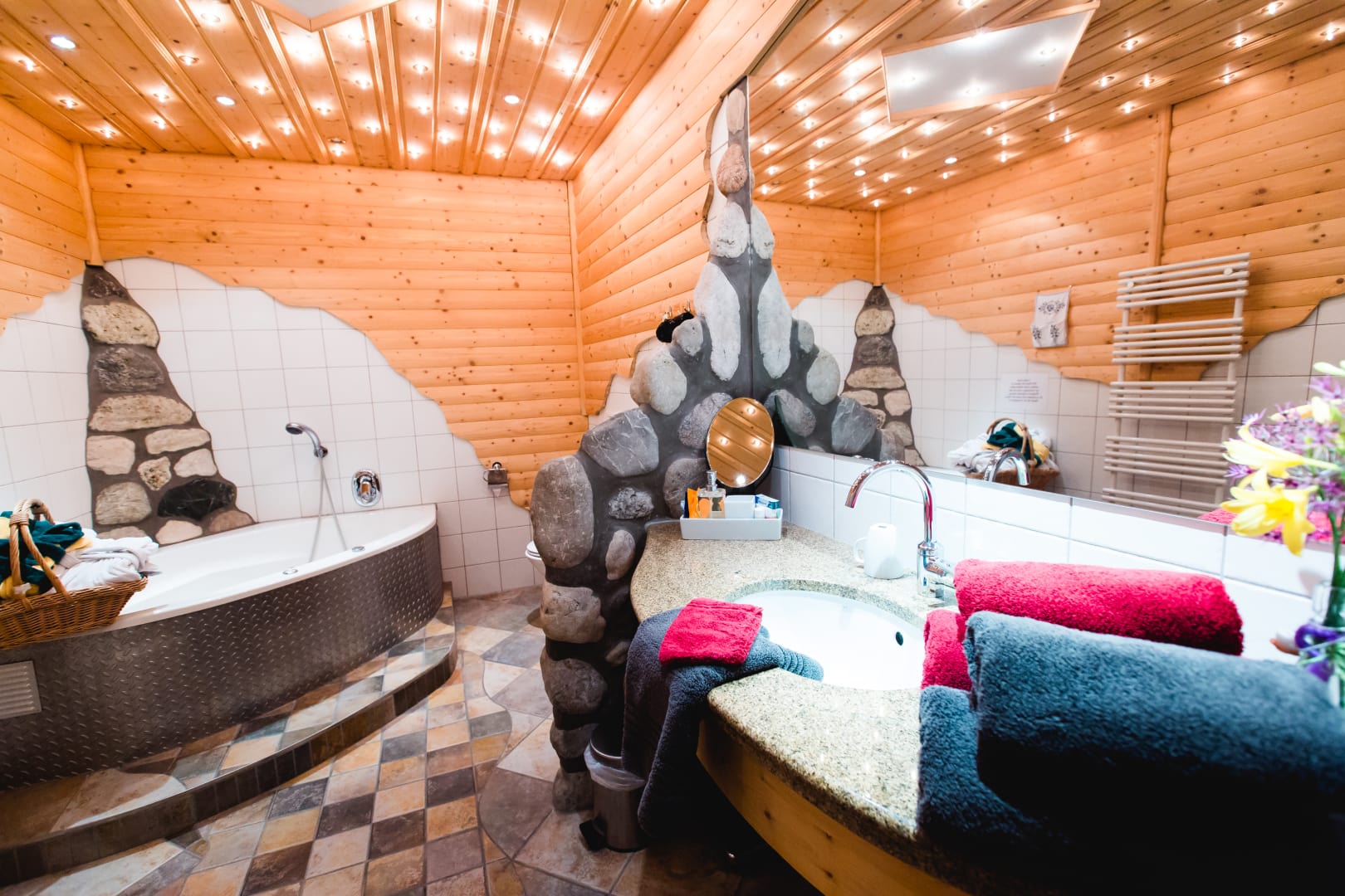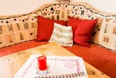 • sich an die warme Kachelwand lehnen und bei einem Glas Wein ein gutes Gespräch führen,