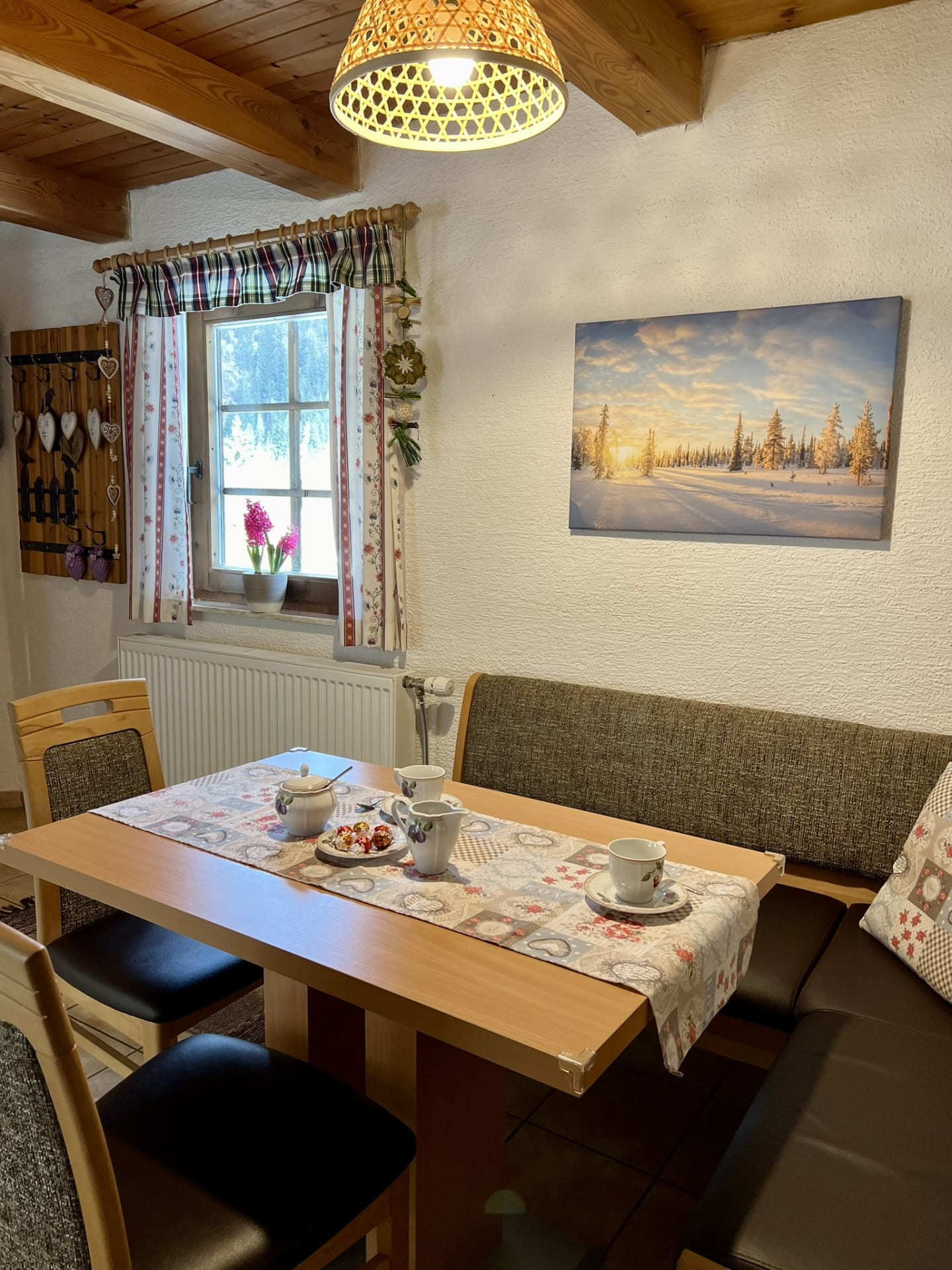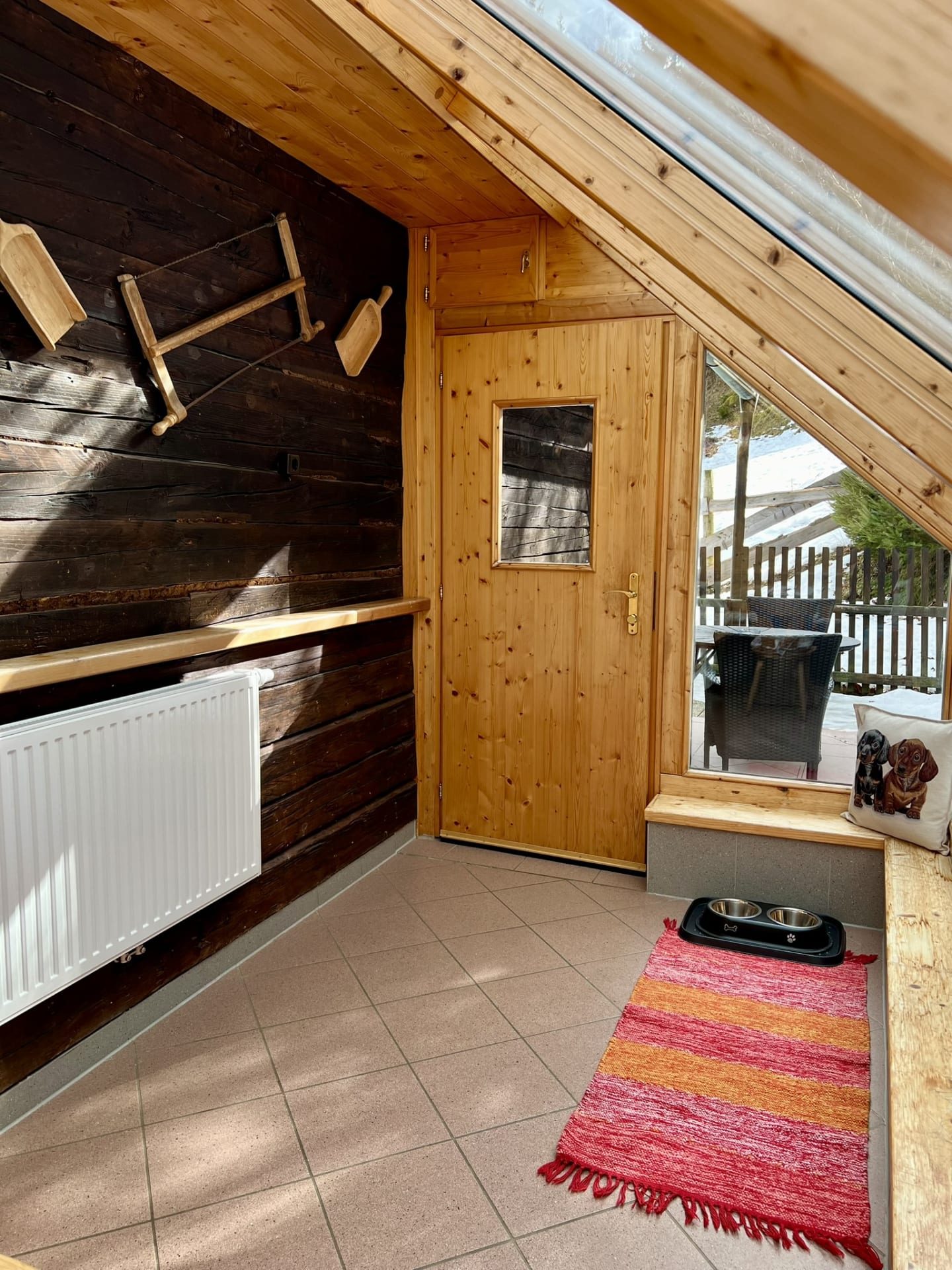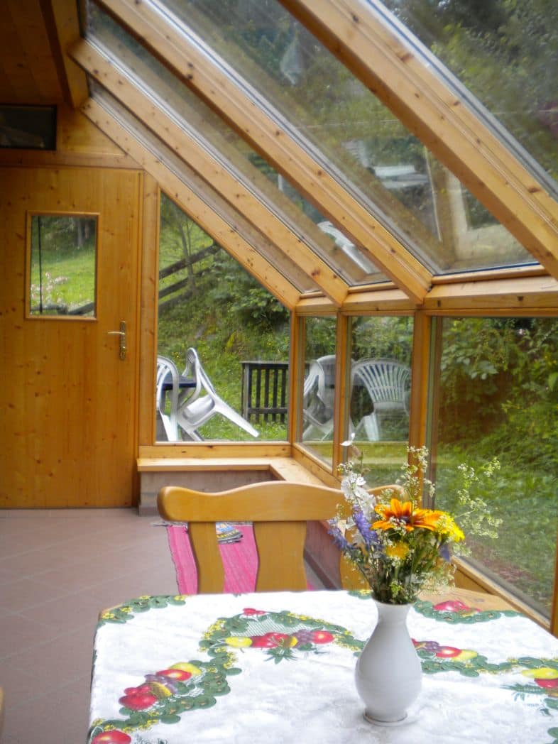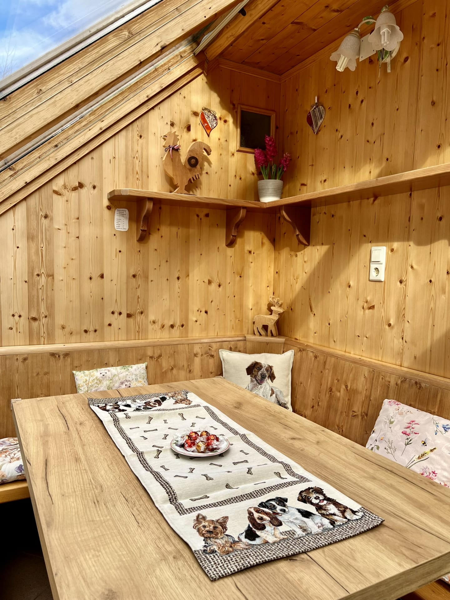 Gleich zwei Essecken laden zum Verweilen ein: In der Wohnküche und im gemütlichen Wintergarten mit Ausblick auf Wald, Wiese und Himmel. Verbunden sind die Räume über ein kleines Stiegenhaus mit Garderobe. Rund um die Hütte im Außenbereich und auf der Terrasse befinden sich Bänkchen und Tische zum Sonnsitzen.