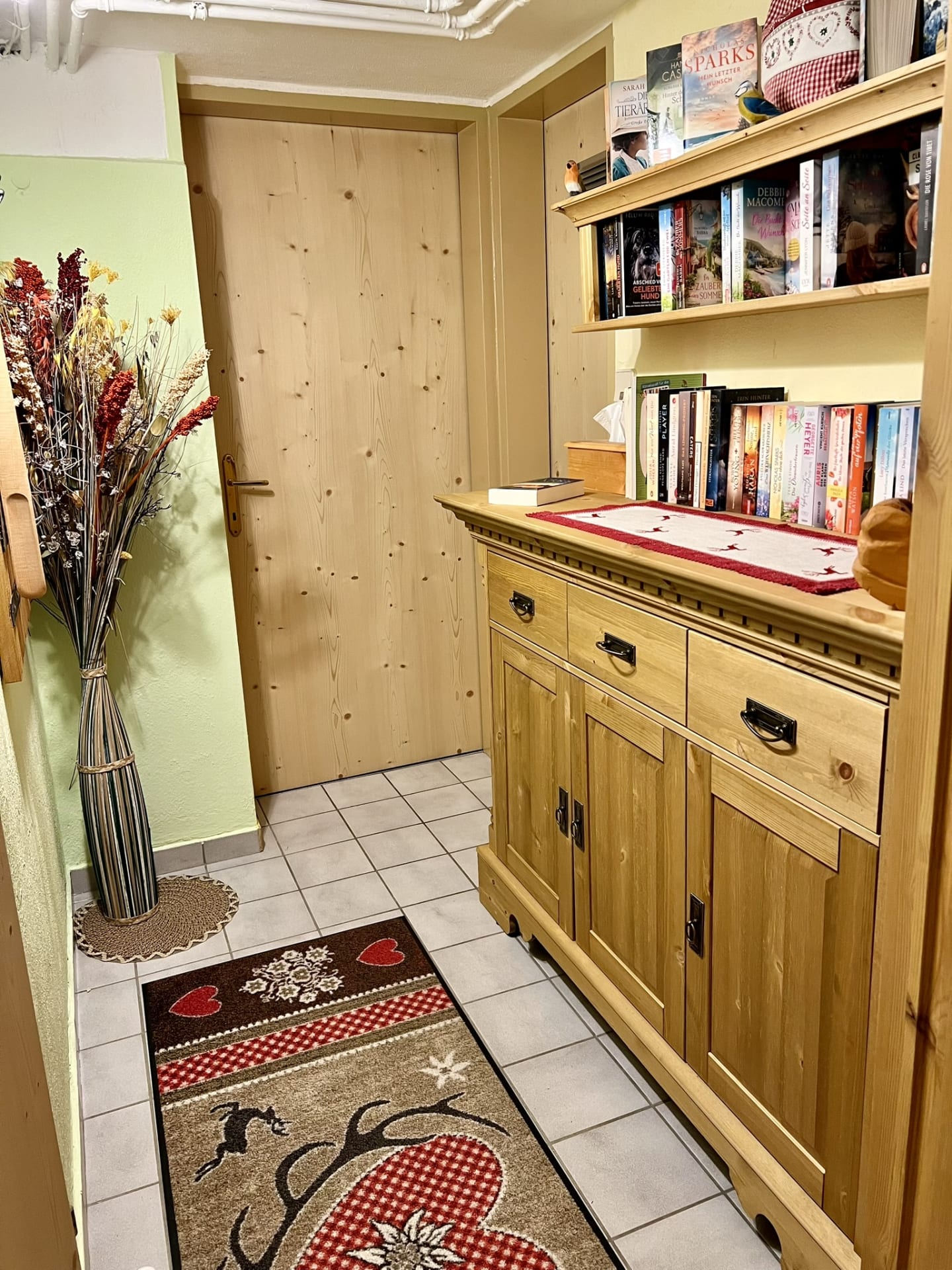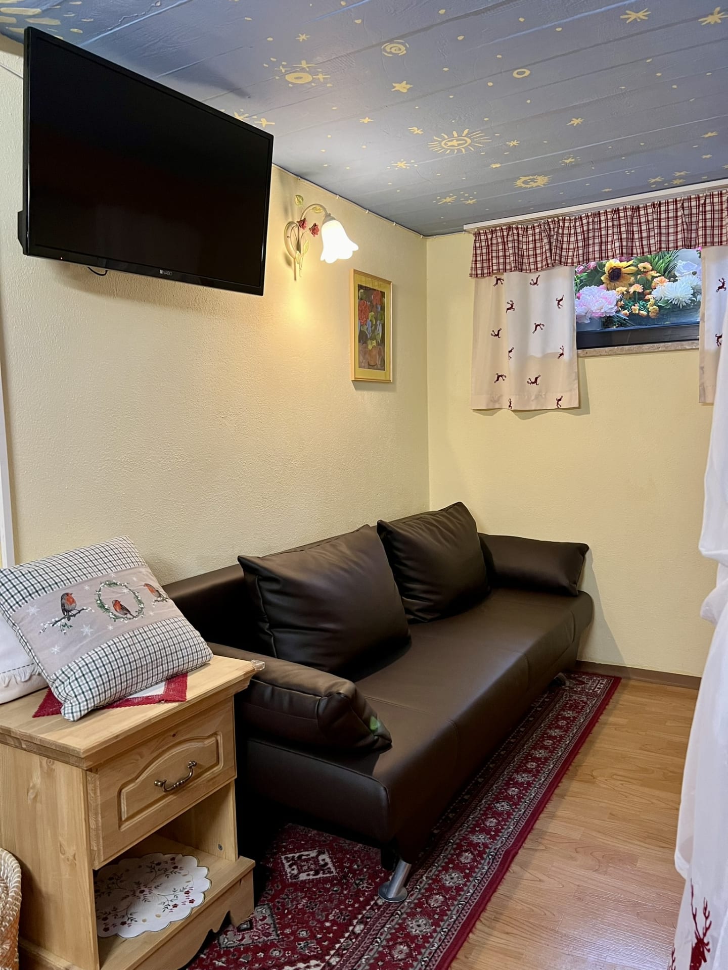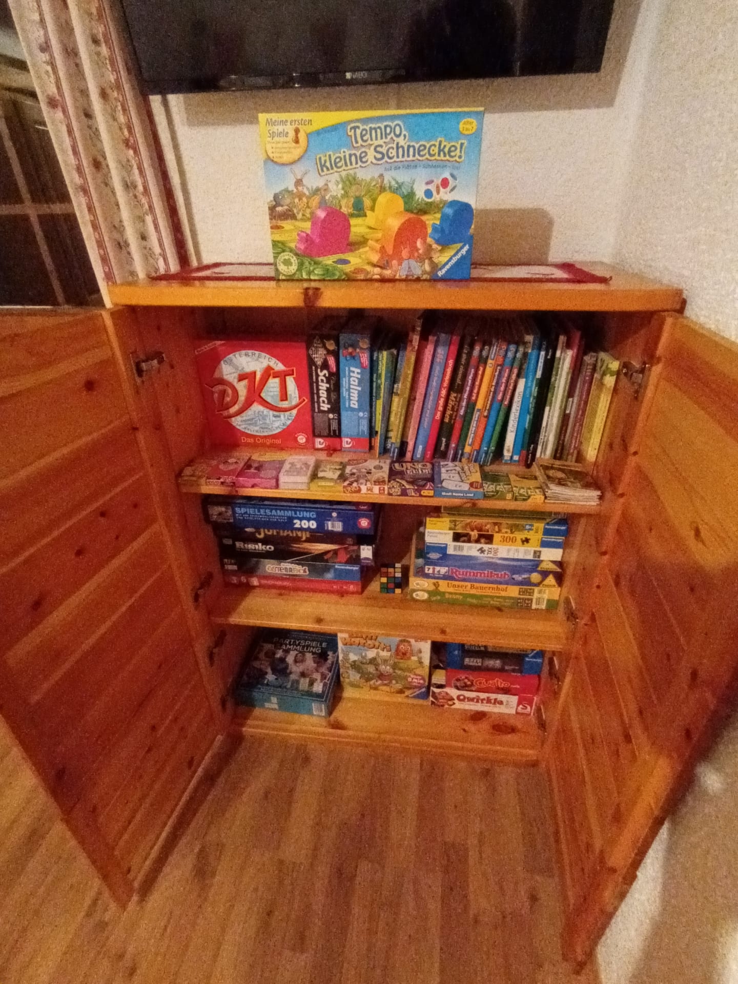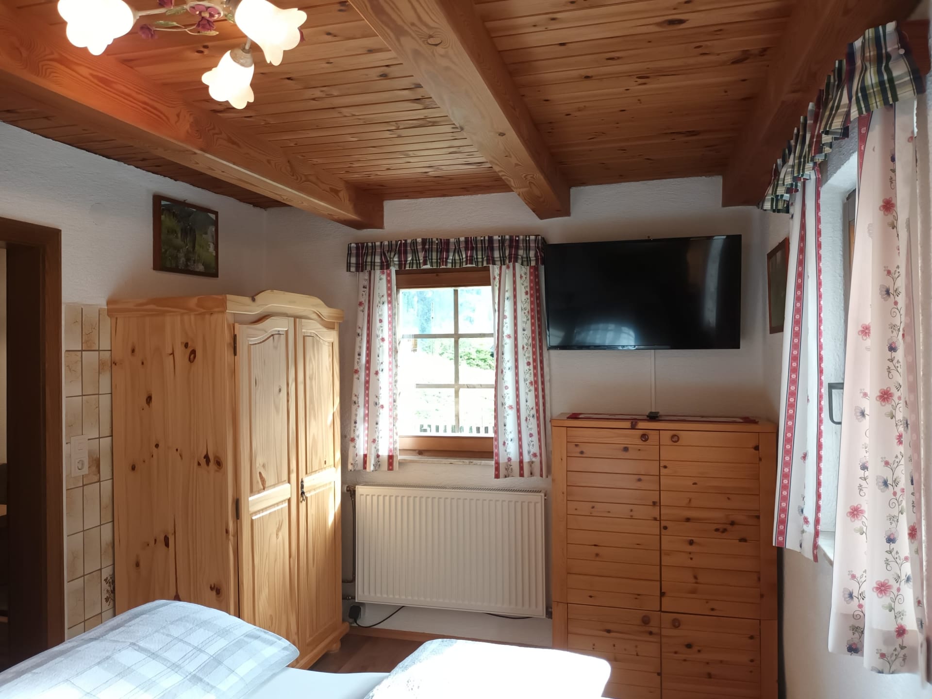 Das helle Zweibettzimmer befindet sich ebenerdig und beinhaltet einen Schrank, eine Komode voller Brettspiele, einen Samsung Flachbildfernseher und ein Zirbendoppelbett.