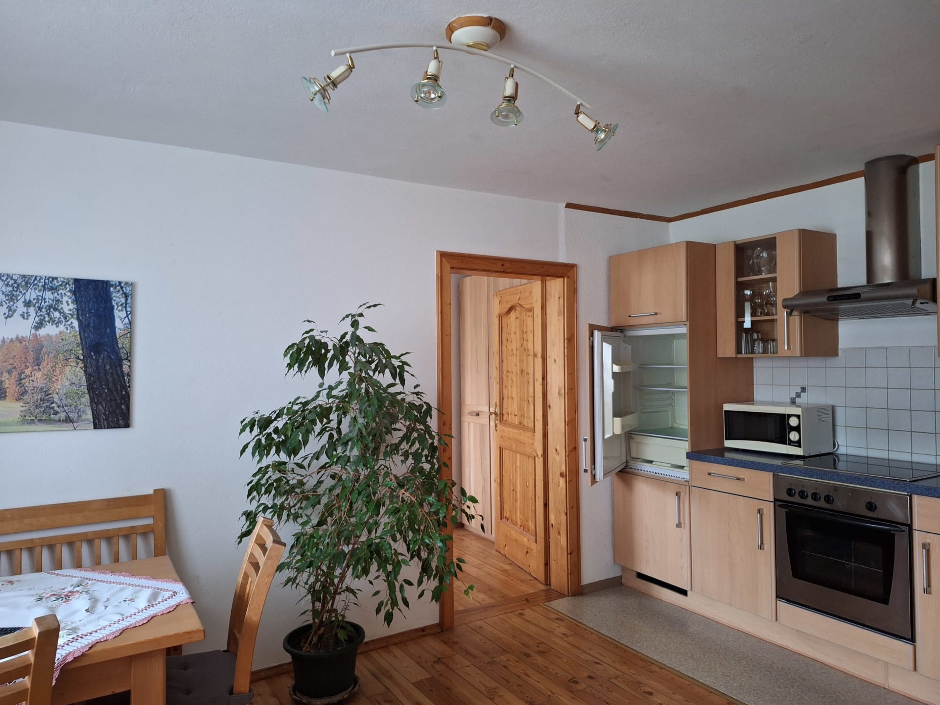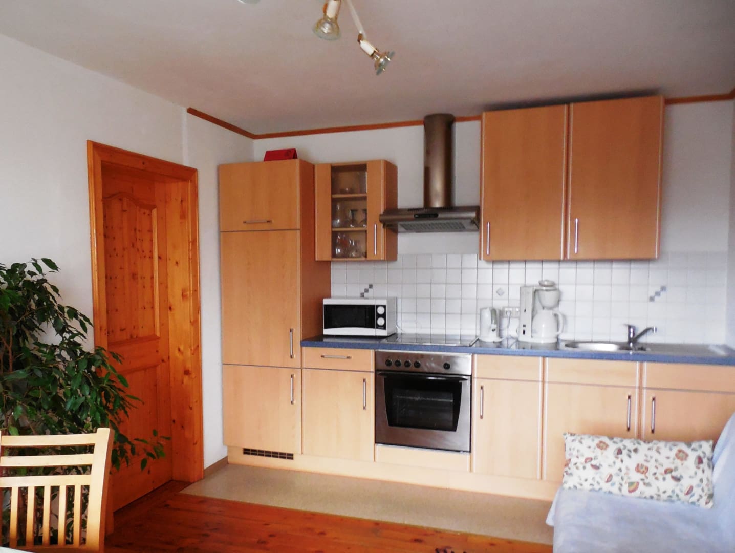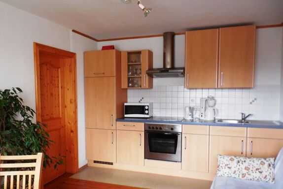 Eine gemütliche Wohnküche, komplett ausgestattet mit modernem 4-Plattenherd, Backofen, Mikrowelle, Wasserkocher und allen nötigen Küchenutensilien, lädt zum gemeinsamen Kochen und Verweilen ein. Hier befindet sich auch ein bequemes Schlafsofa, das Platz für bis zu zwei weitere Personen bietet.