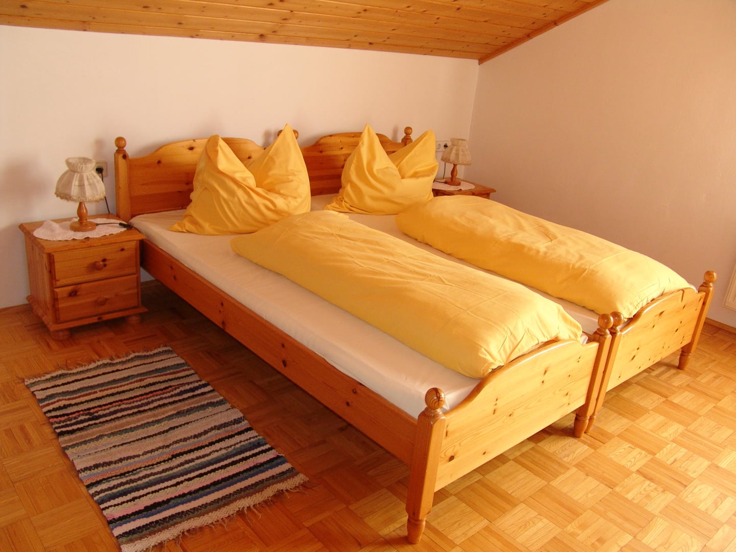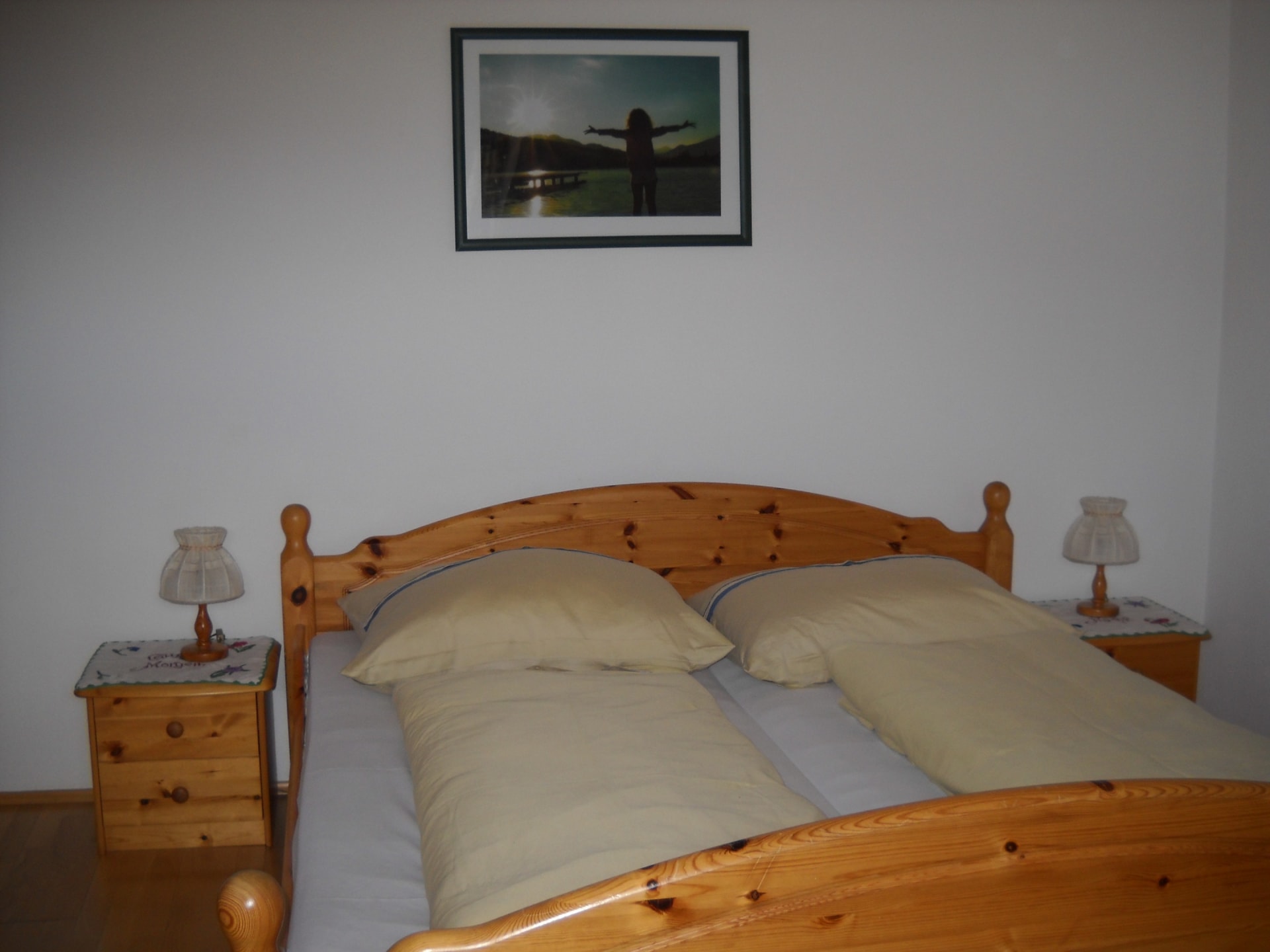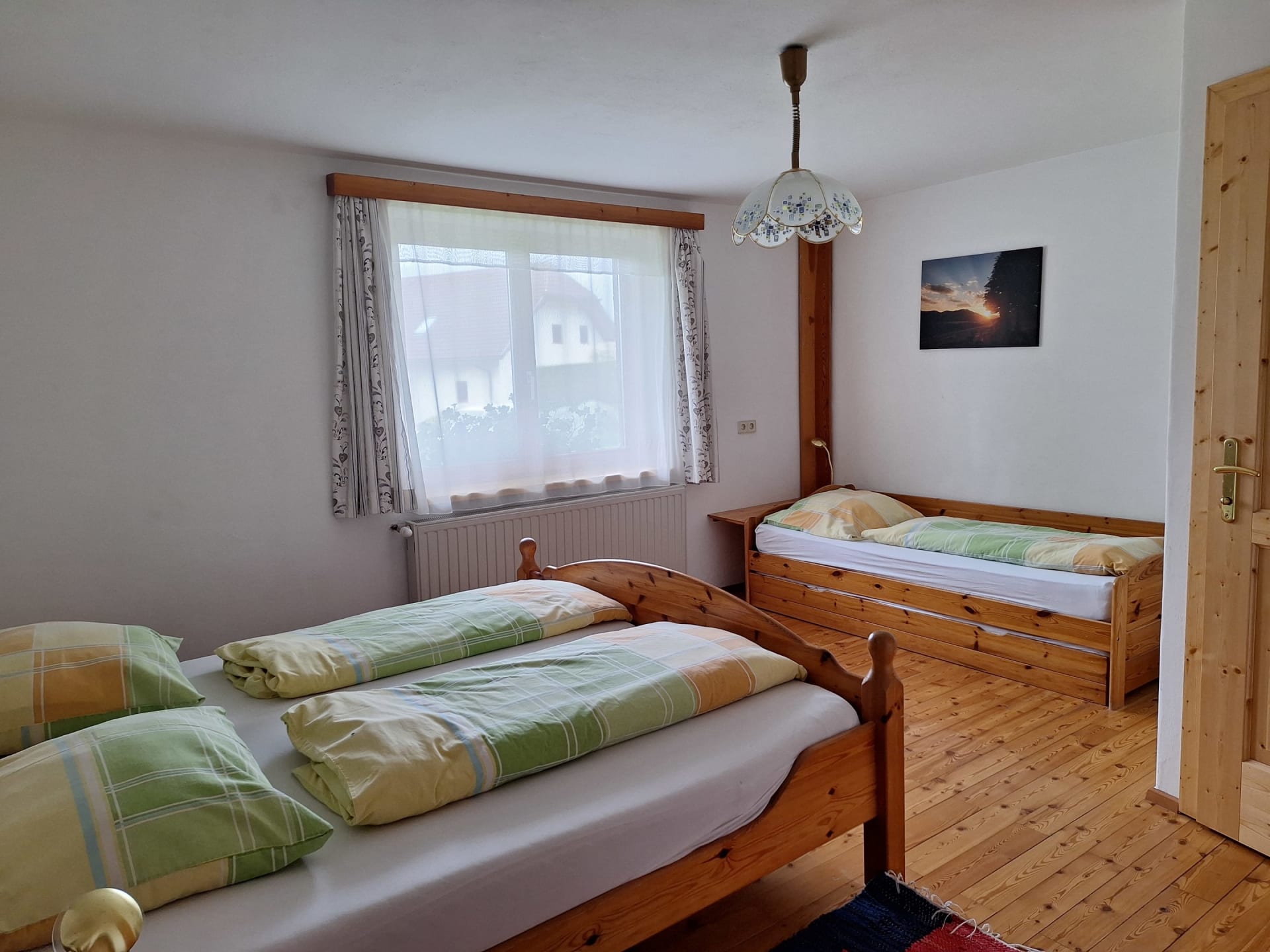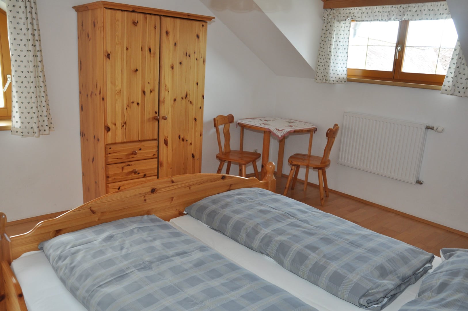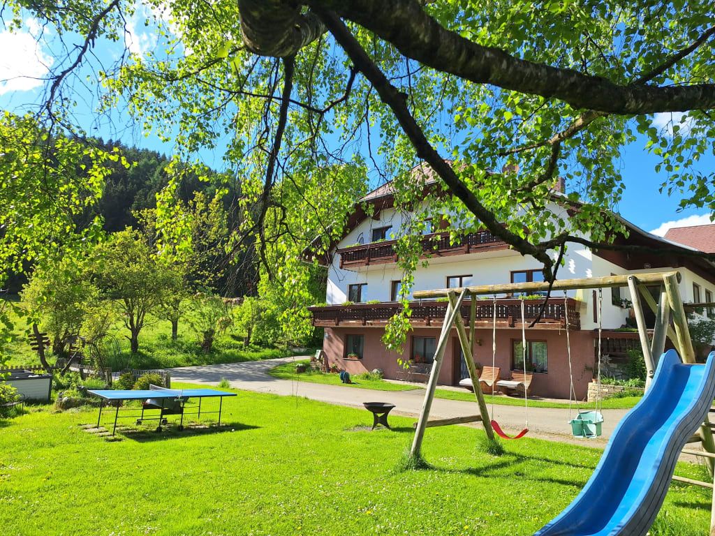 Die liebevoll eingerichtete Nichtraucherwohnung im Haupthaus bietet ein großzügiges Schlafzimmer mit einem komfortablen Doppelbett und einem zusätzlichen Einzelbett. Das moderne Badezimmer verfügt über eine Dusche und einen Haarföhn.