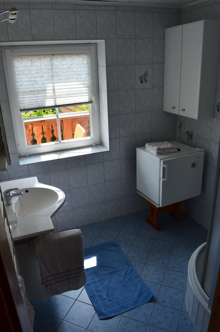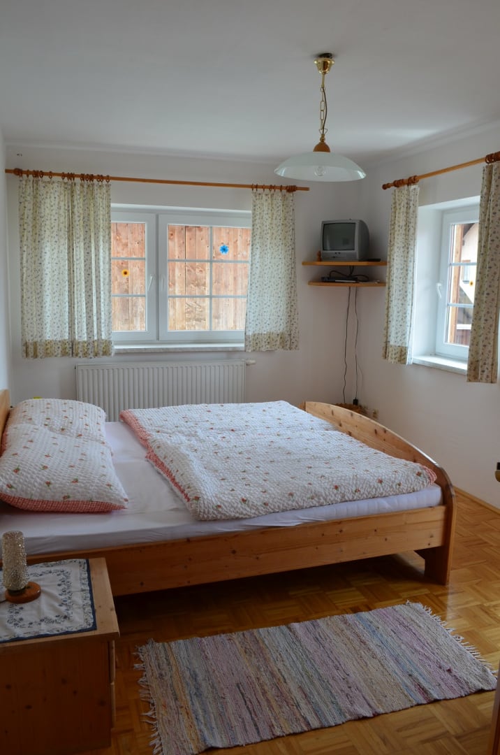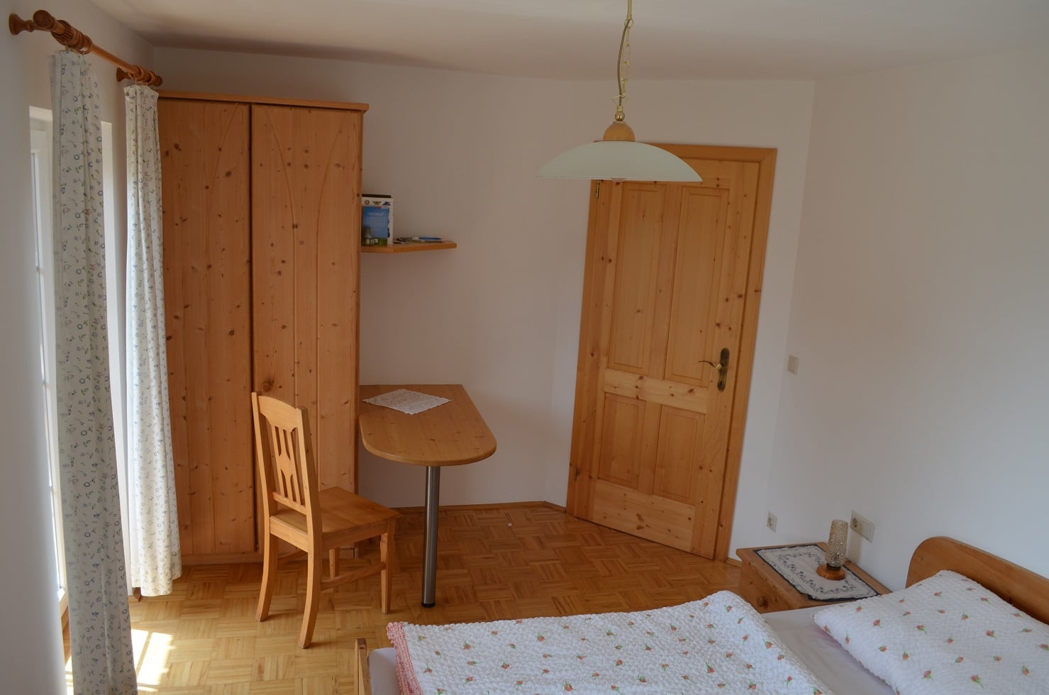 sonniges Doppelzimmer mit Vorraum, Dusche, WC und großem, südseitigem Balkon. Parkettböden. SAT-TV und W-LAN.