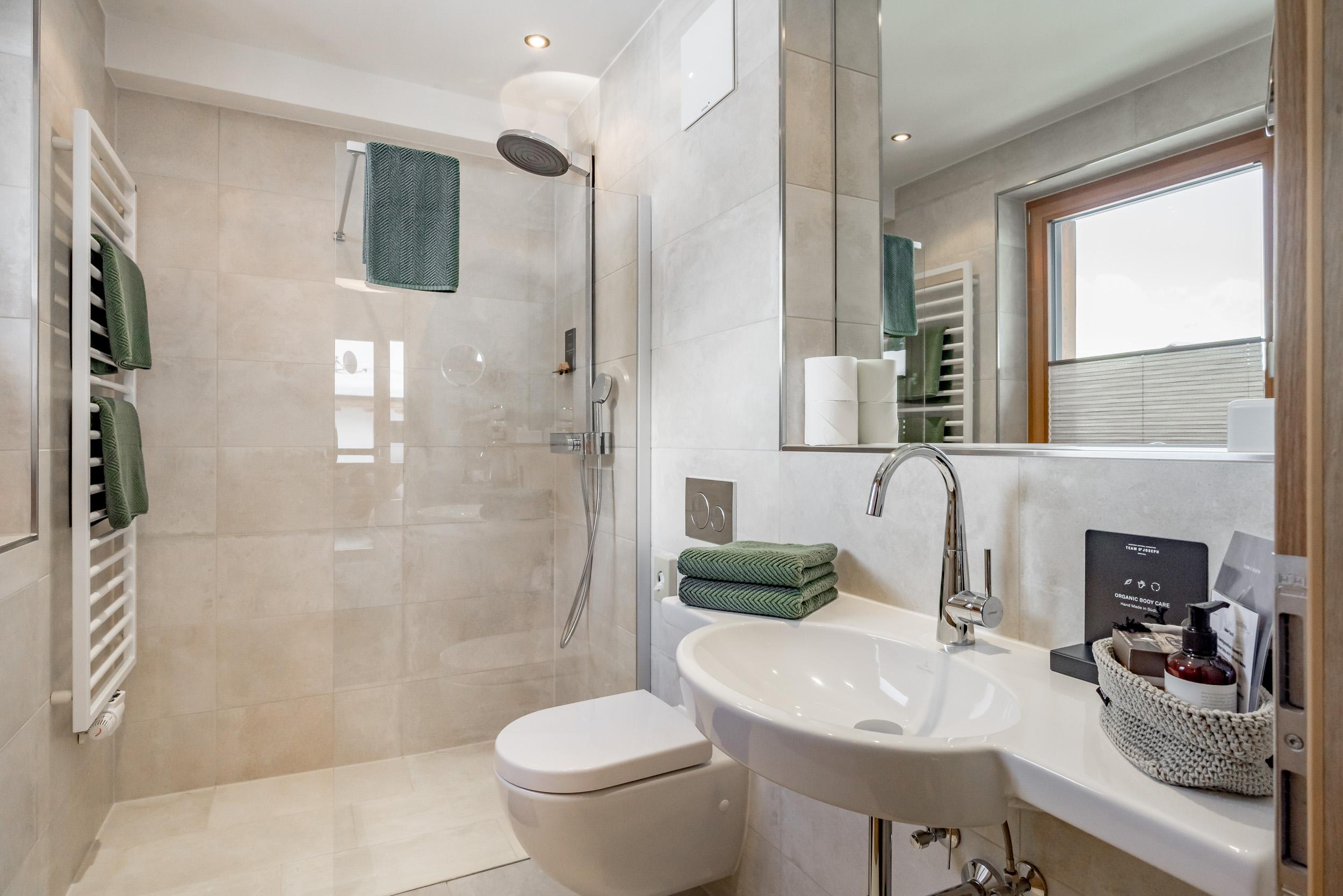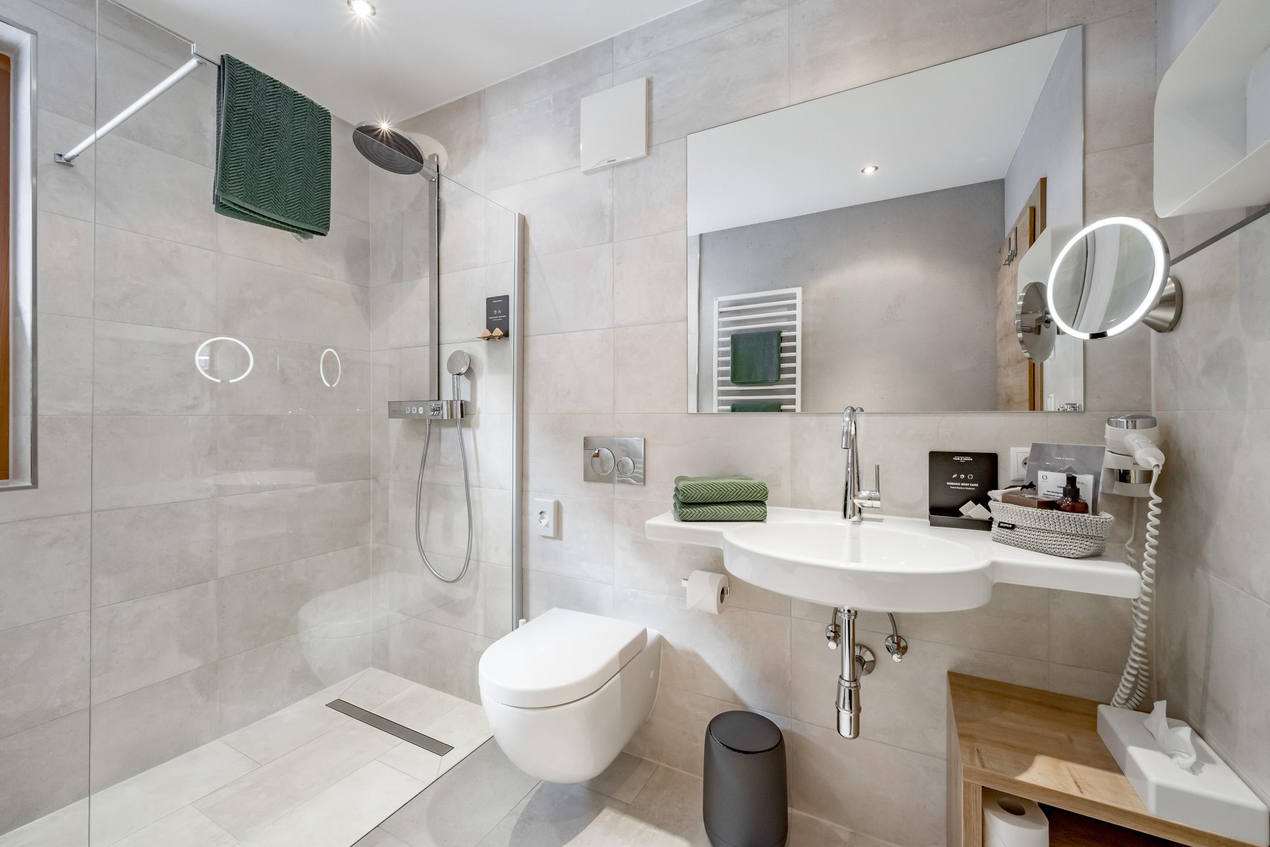 • 2 Badezimmer (Tageslicht) Wellnessdusche, WC, Fön, beleuchteter Kosmetikspiegel, Kosmetiktücher