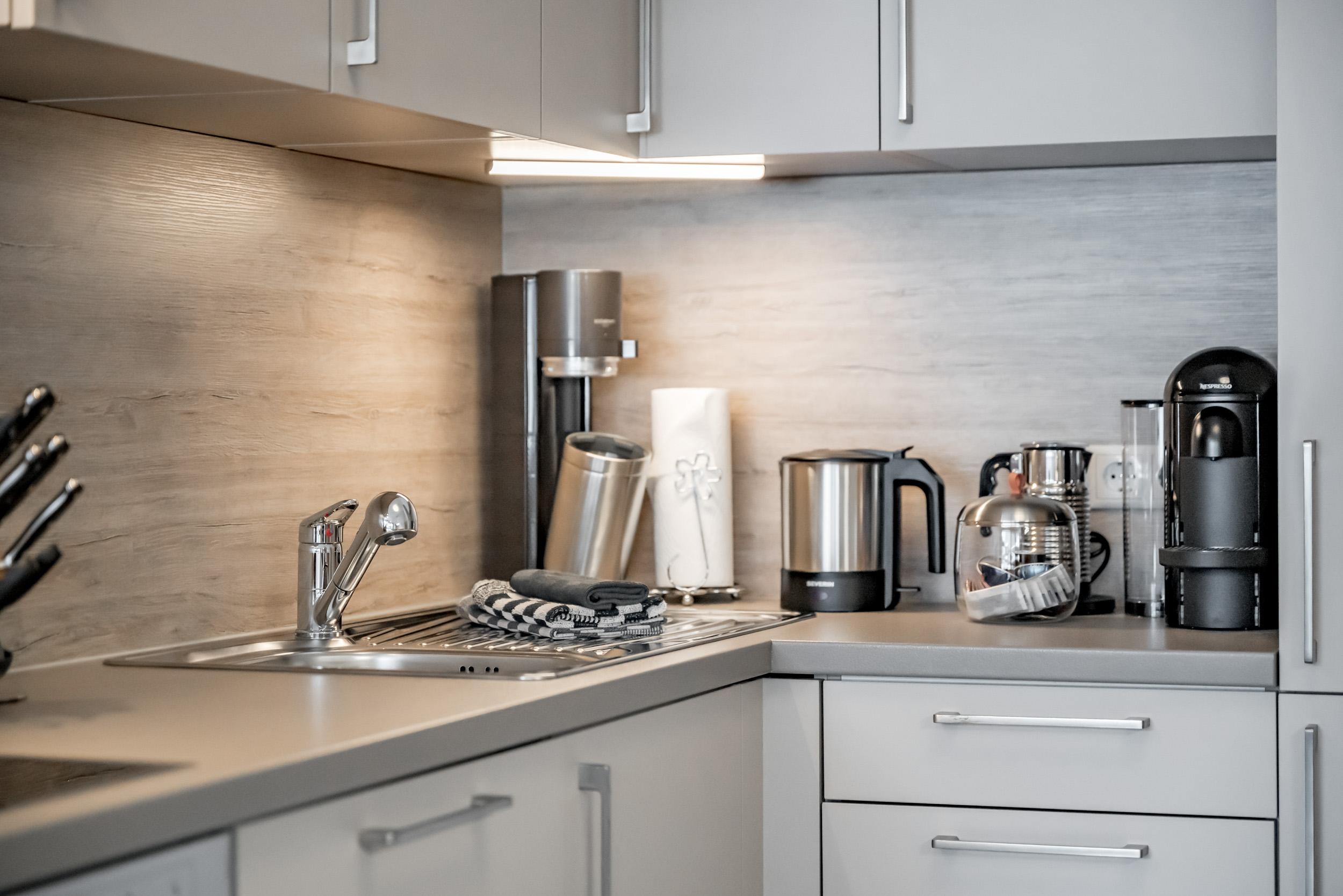 • vollausgestattete Küche mit 4 Platten-Cerankochfeld, Backofen, Geschirrspüler, Kühlschrank mit Gefrierfach, Nespresso VERTUO NEXT-Kaffeemaschine & Milchschäumer, Toaster, Eierkocher, Wasserkocher und Sodastream Wassersprudler