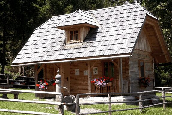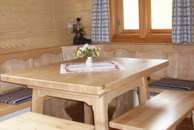 Sie ist ausgestattet mit 2 Schlafzimmern, DU/ WC, Wohnküche, Sat-TV und Kachelofen. Brunnen, Gartengriller und Sitzgarnitur befinden sich vor der Hütte.