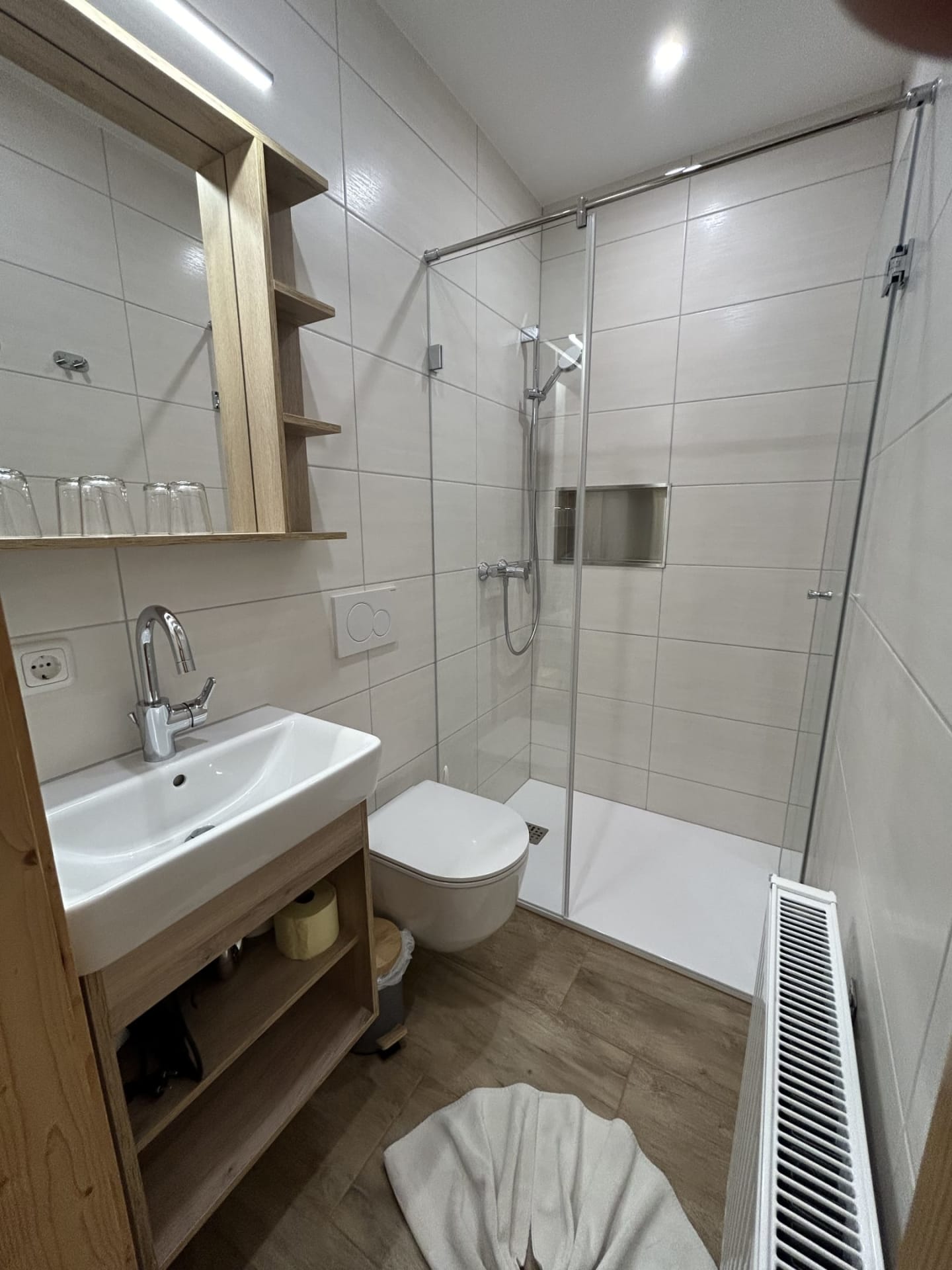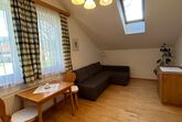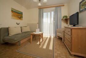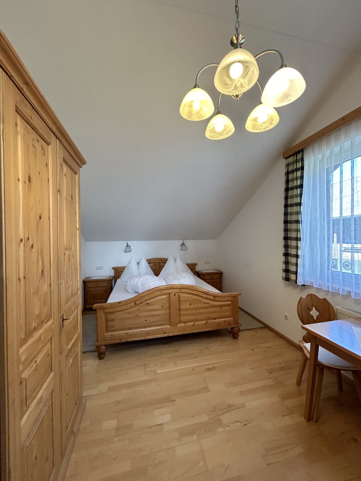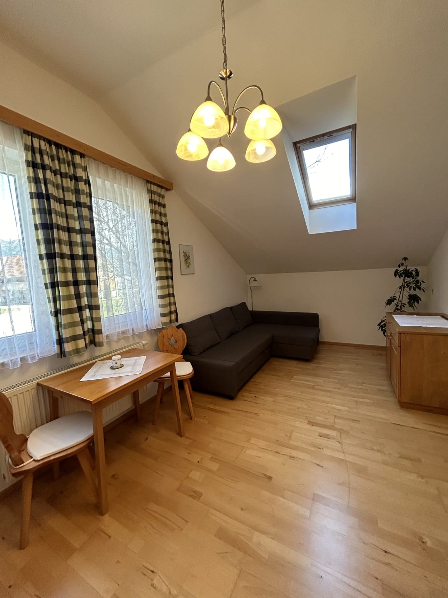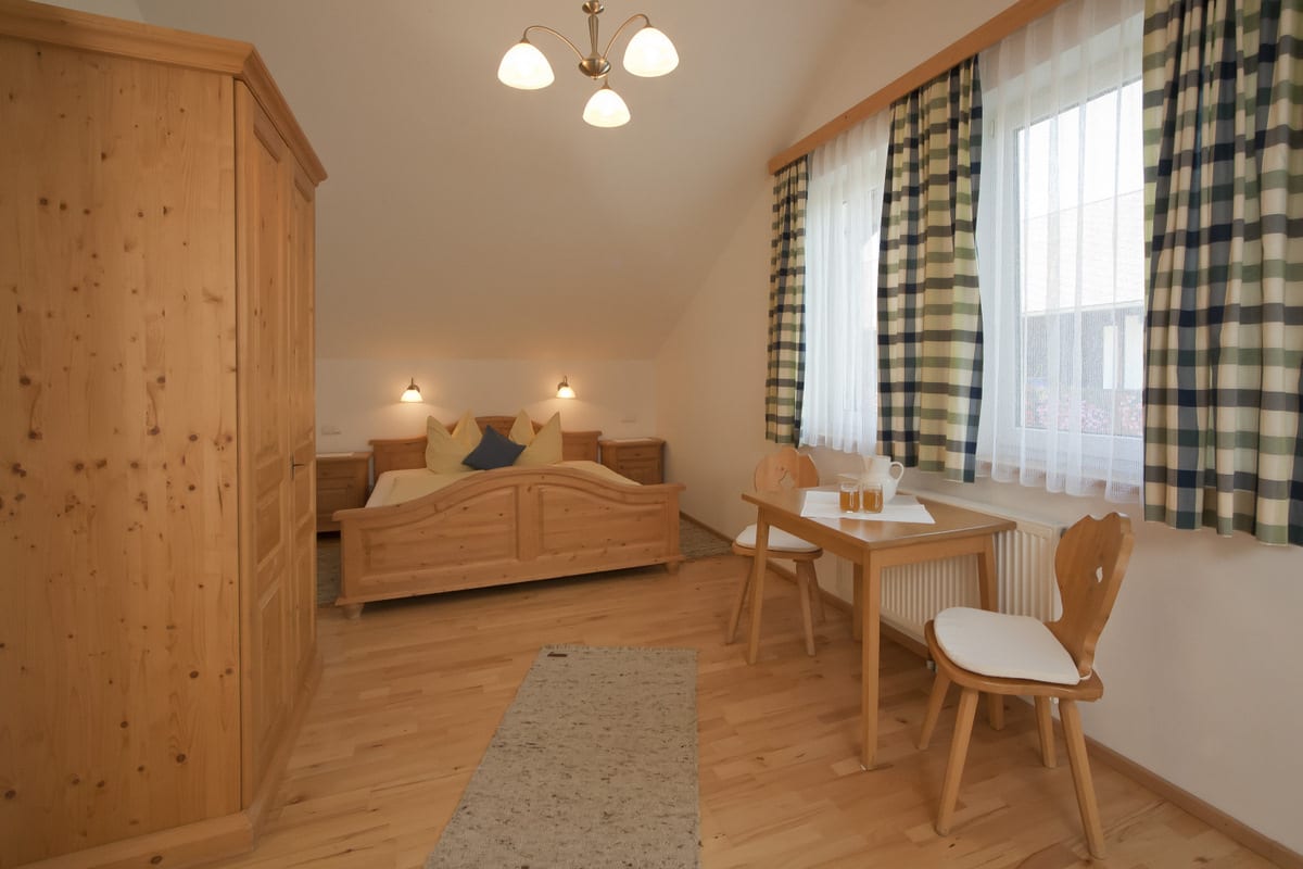 Das Ahornzimmer ist im ersten Stock. Sie kommen zuerst in das Wohnzimmer. mit einer Doppelcouch, Zugang zum Balkon, Dusche, WC, und Flat TV . Weiter geht es ins sehr geräumige Schlafzimmer mit Hofblick und einer zusätzlichen Couchliege. Es ist durch eine Türe vom Wohnzimmer getrennt. Ausgestattet mit Vollholzmöbeln und natürlich behandelten Holzböden.