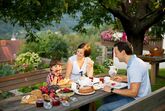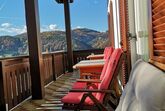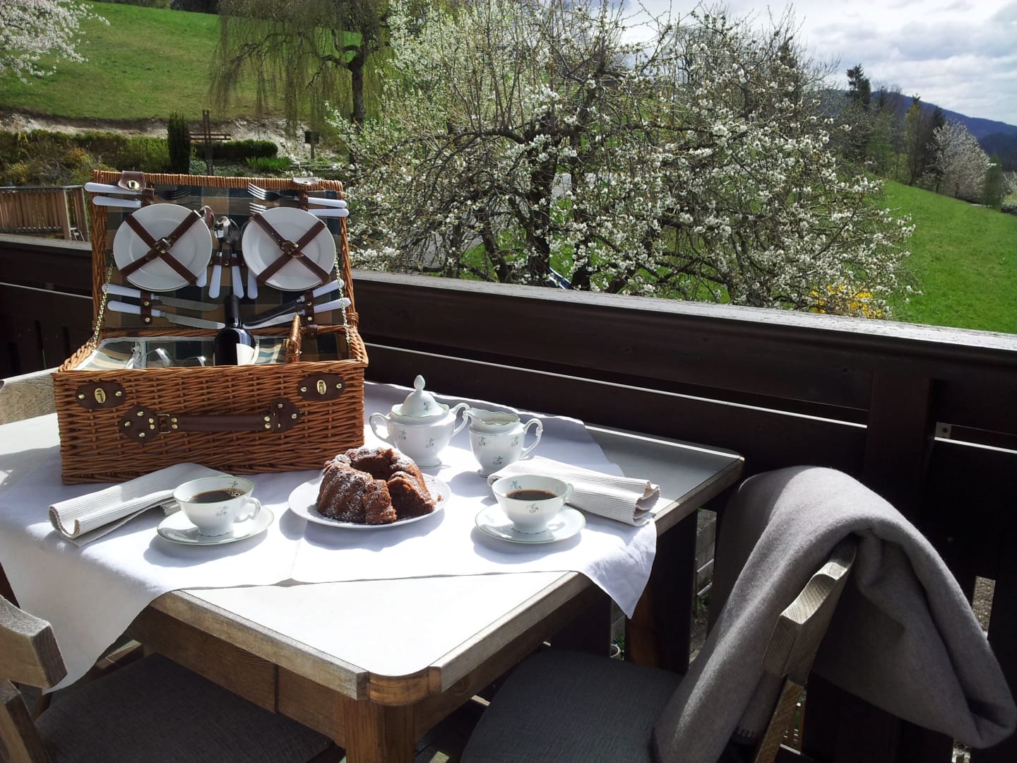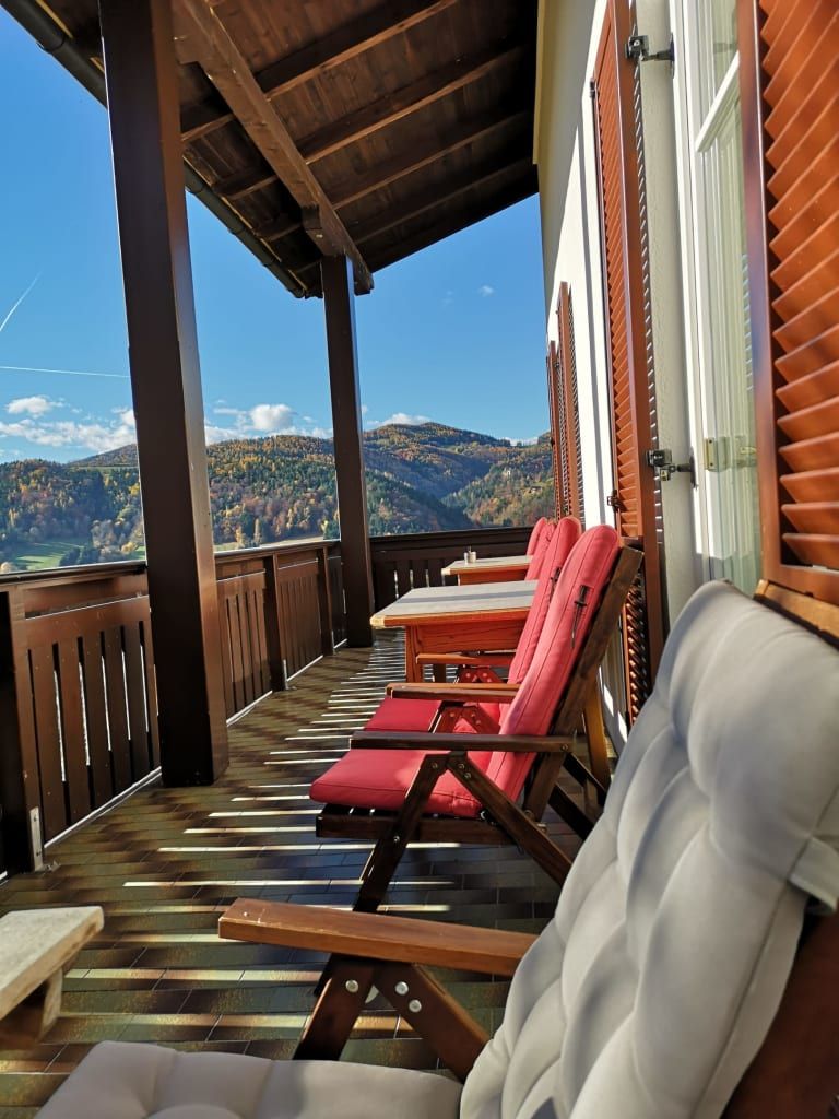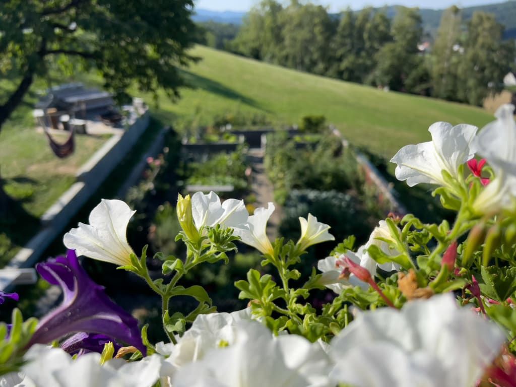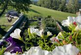 Der Balkon ist zu jeder Tageszeit schön, ein besonderes Highlight ist aber der Morgen: von hier erlebt man schon den ersten Sonnenstrahl, der Blick geht über den blühenden Bauerngarten und die herrliche Landschaft. Auf bequemen Liegestühlen kann man jeden Moment genießen.