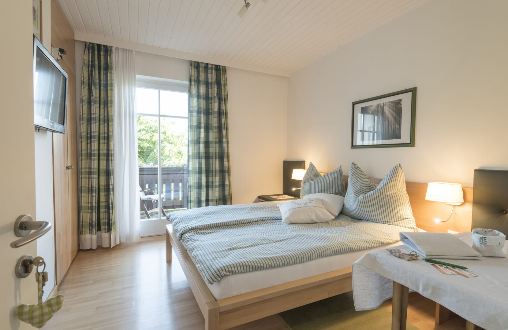 Kleines und fein mit Blick ins Grüne: unser Doppelzimmer 3 mit dem grünen Herzerl am Schlüsselanhänger ist ein helles, komfortables Zimmer zum Wohlfühlen. Ein Qween-Size Bett, ein Tisch mit Sessel und zwei weitere gemütliche Sitzggelegenheiten sowie ein begehbarer Schrank mit viel Platz für Garderobe und Gepäck sorgen für eine harmonische Atmosphäre.