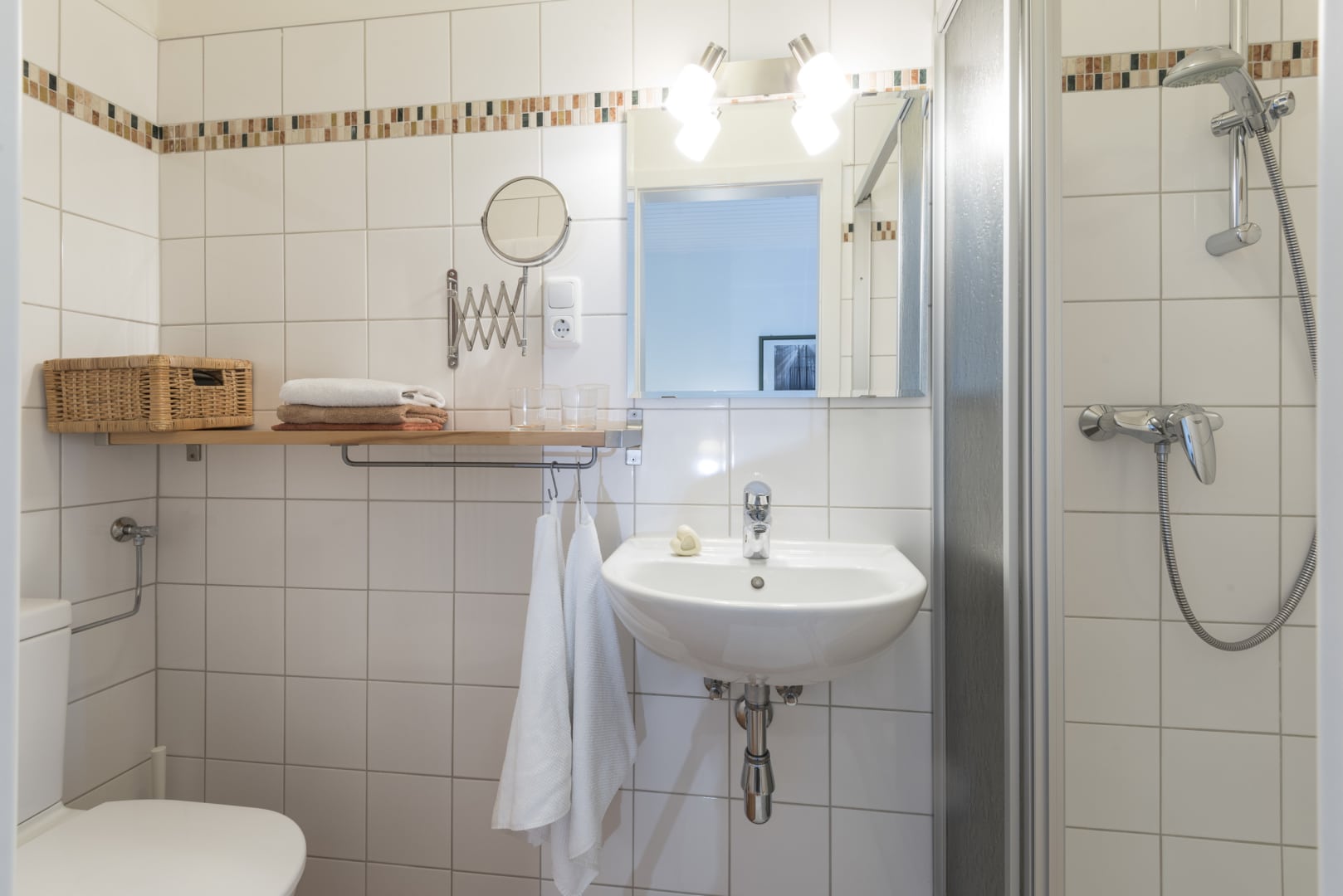 Das Badezimmer hat eine angenehm große Dusche und Ablageflächen für alle Utensilien, Handtücher und Fön liegen selbstverständlich für Sie bereit.