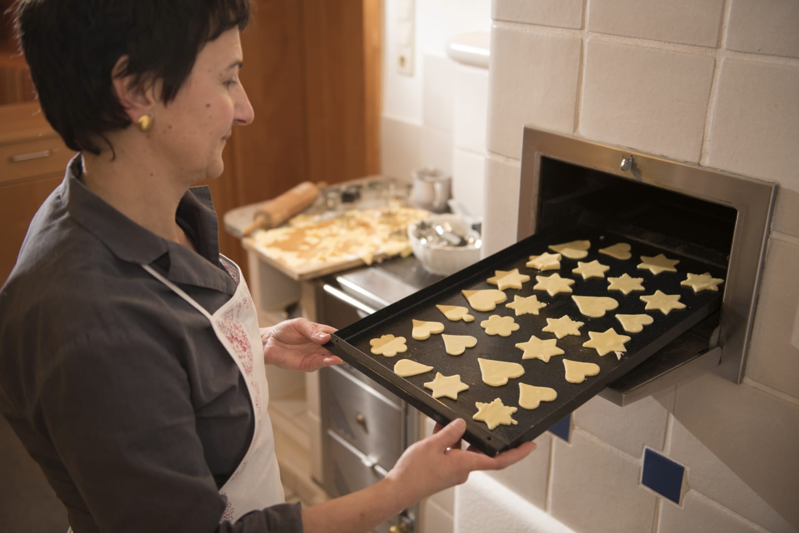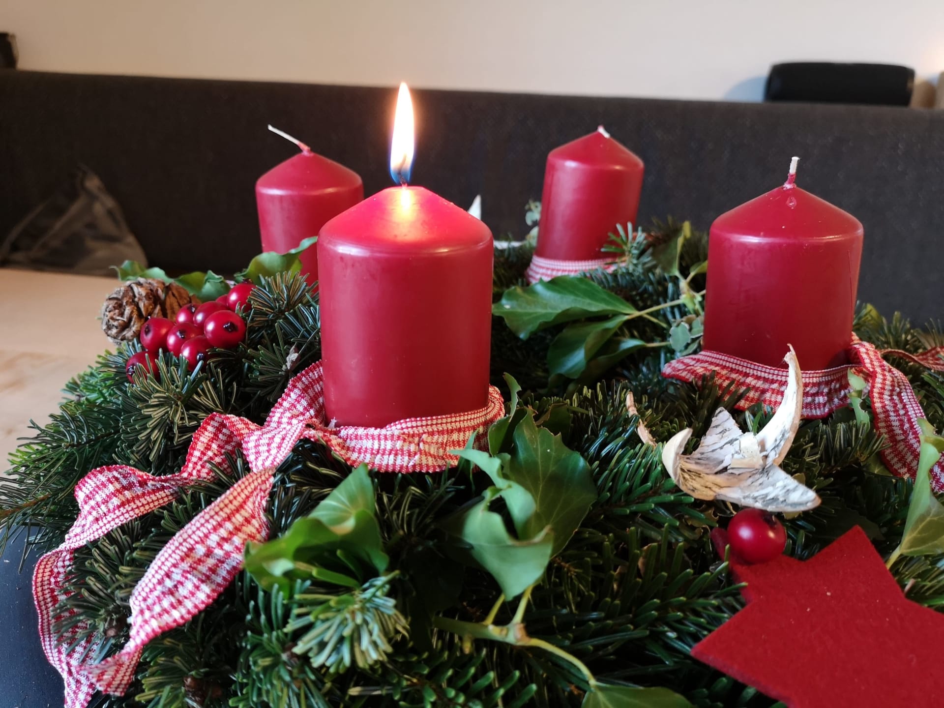 Die Massivholzmöbel - ein Tisch mit zwei Sessel, ein Schrank, Garderobe und diverse Ablagen sowie die liebevollen Details - Vorhänge mit Handdruck, Textilien in feiner Qualität und Wollteppiche -sorgen für eine schöne Atmosphäre.