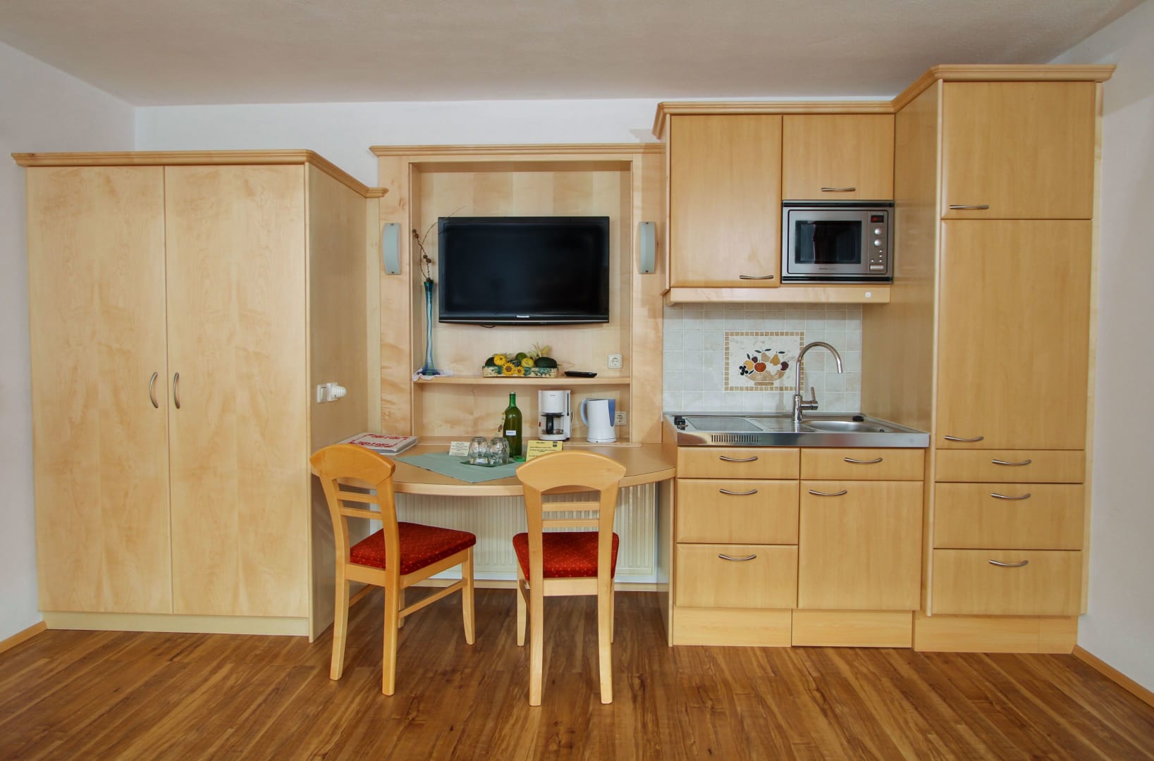 1 bis 3 Personen / 23m², Kochgelegenheit mit Kühlschrank, 1 Doppelbett, Couch (Extraanfertigung mit Matratze) Bad mit DU/WC, Balkon