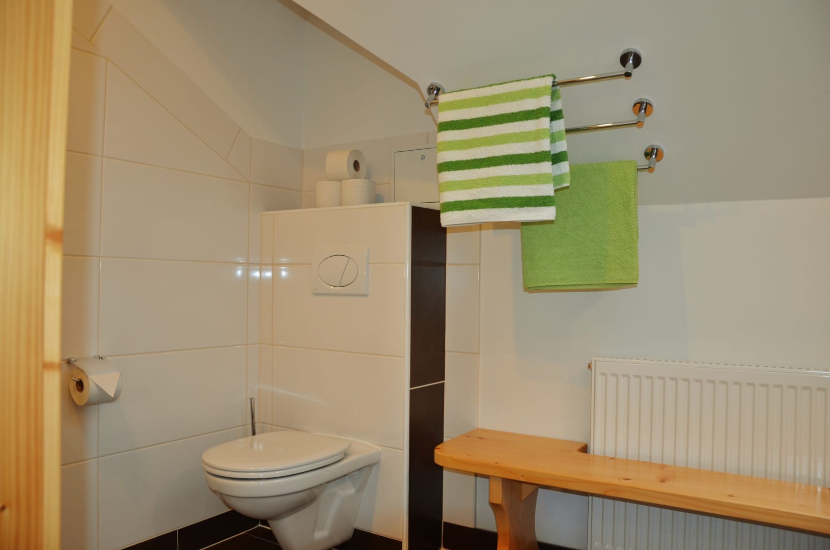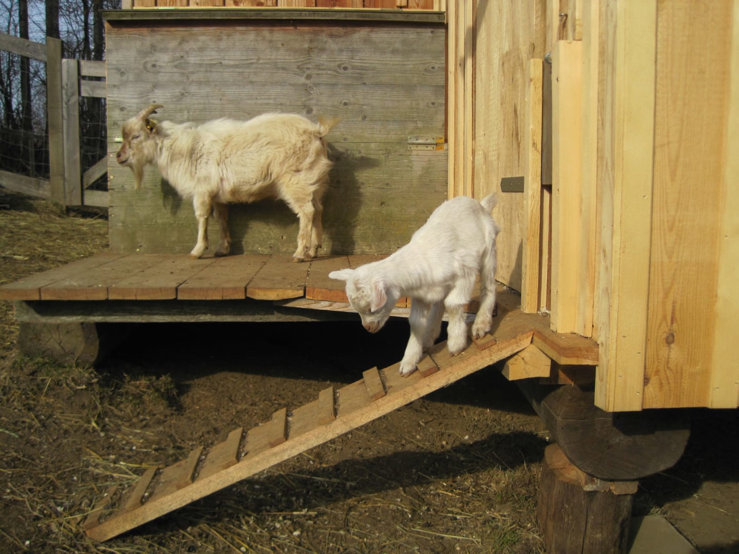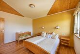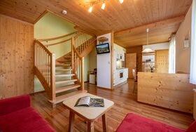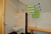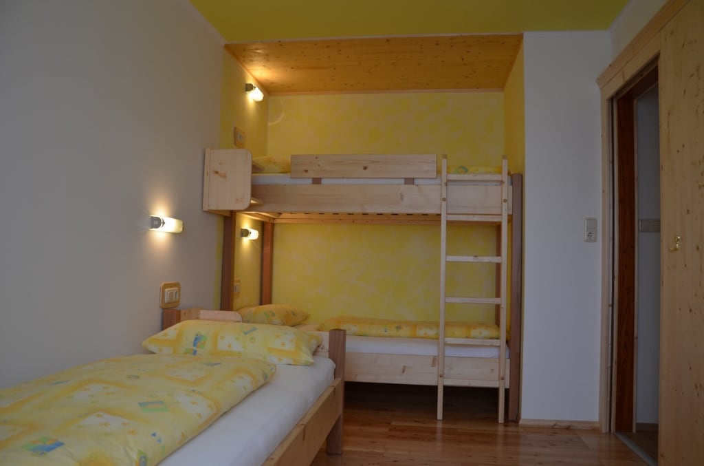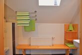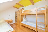 Holztreppe ins Obergeschoß mit Gitter gesichert, 2 Schlafzimmer davon ein 3 Bettzimmer mit Stockbett, Dusche, WC