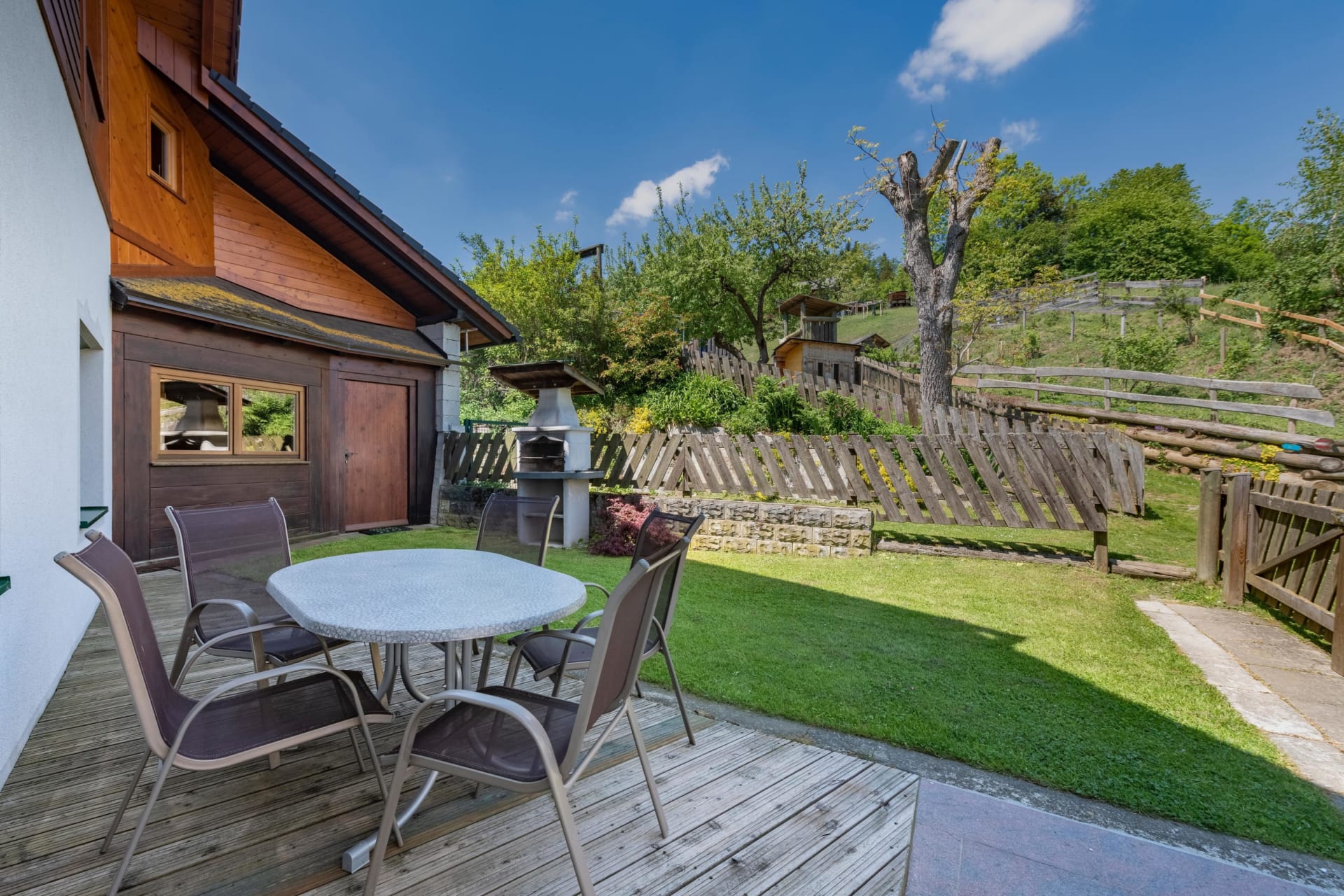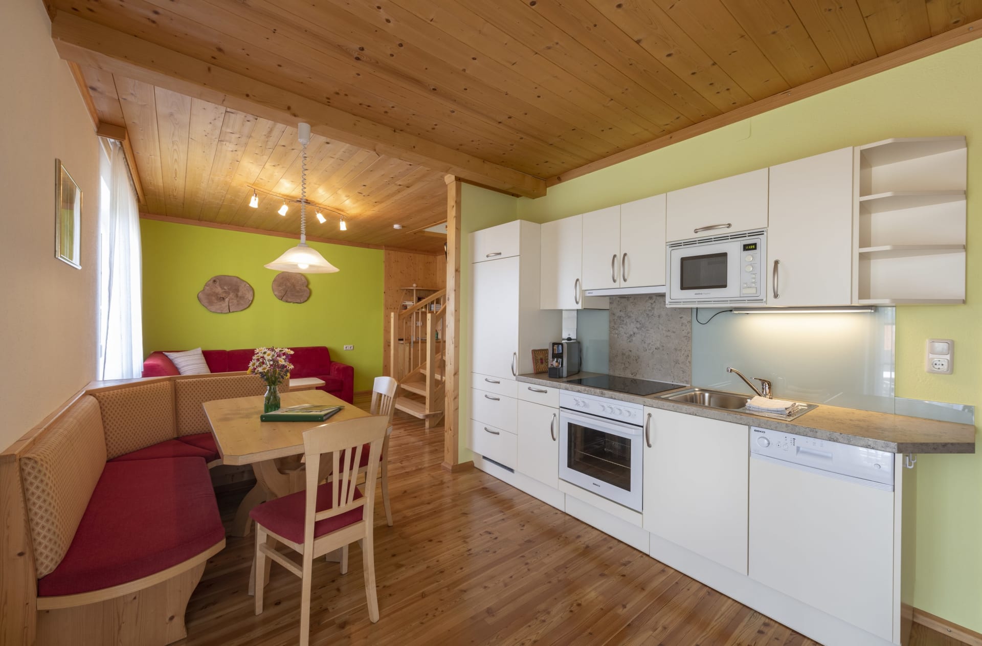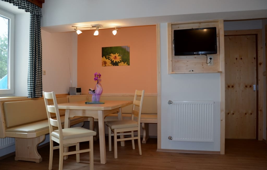 In der Ferienwohnung Morgenrot ist das Frühstücken im Freien besonders schön, da Sie schon bei der ersten Mahlzeit des Tages die Sonne begrüßt. Selbstgetischlerte Möbel vom Opa Franz verleihen der Ferienwohnung ein besonderes Flair.