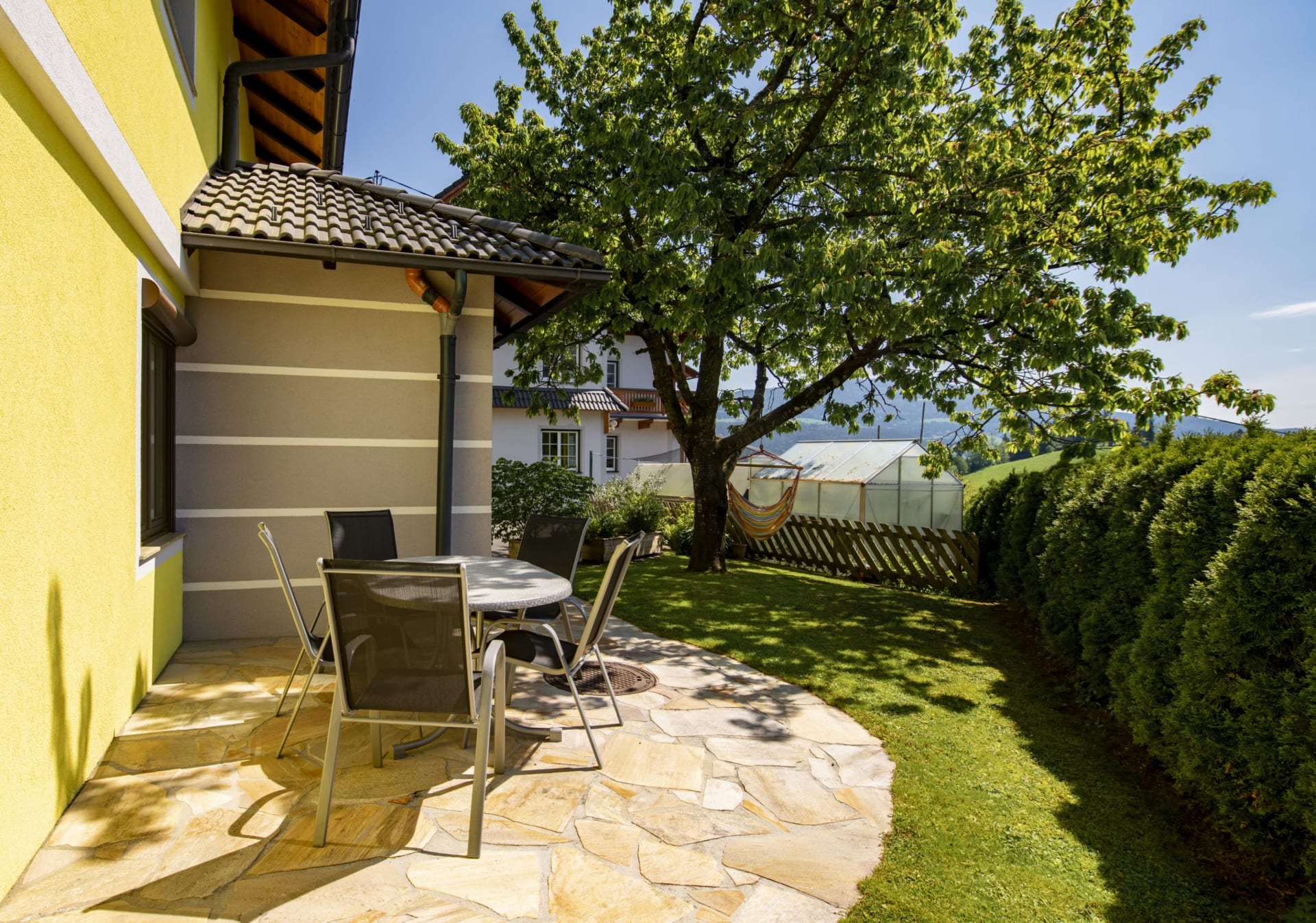 Auf der großen eigenen Terrasse sitzen und die Sonne genießen bis sie untergeht.