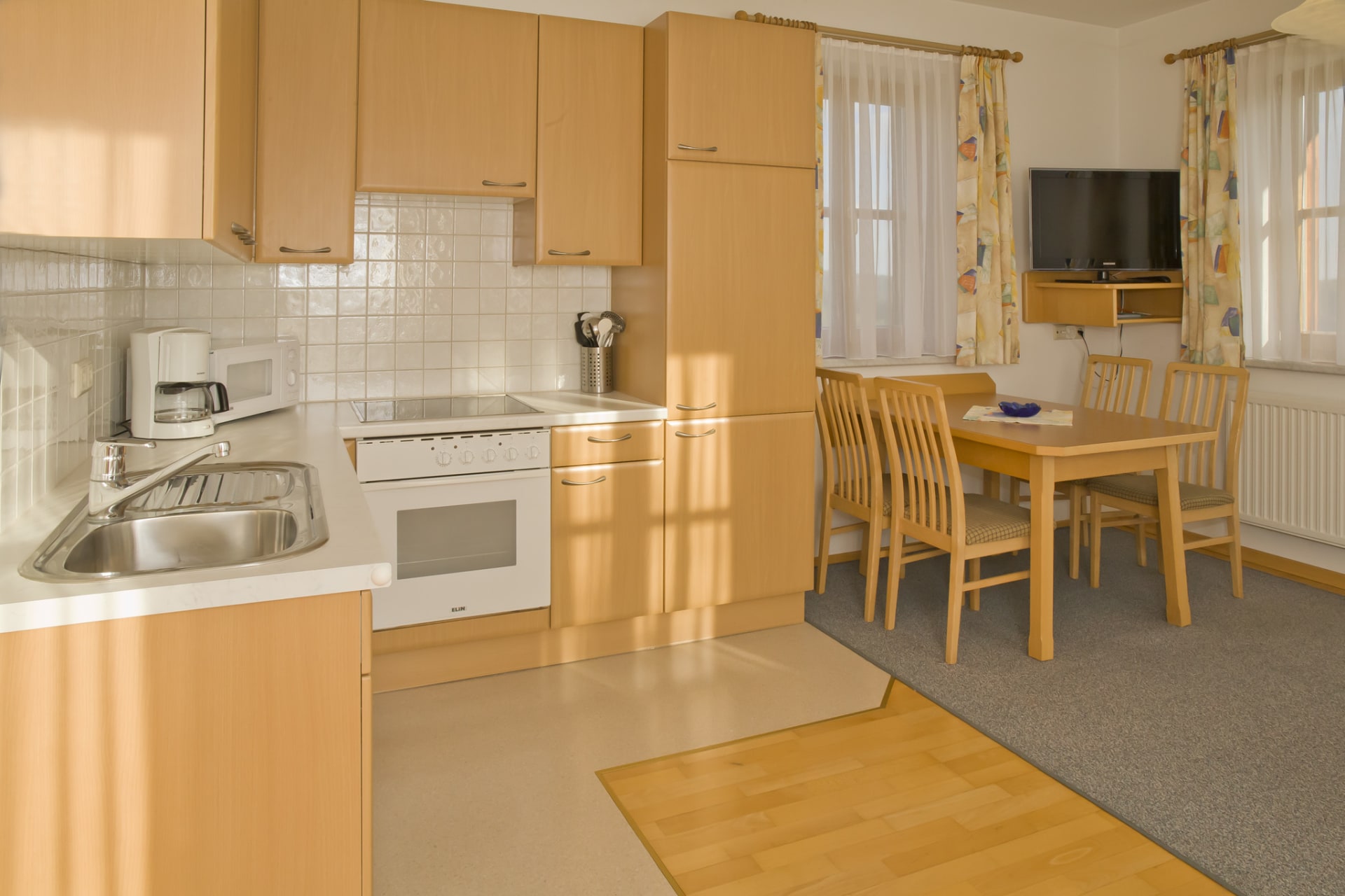 Ein Schlafzimmer mit kuscheliger Bettwäsche, eine bequeme Schlafcouch (Doppelbett) und eine bestens ausgestattete Küche mit allem Drum und Dran. Im Bad findest du Dusche, WC, Fön und Handtücher. Am Balkon kannst du die frische Landluft und den Blick ins Grüne so richtig genießen. SAT-TV ist natürlich auch dabei – und auf Wunsch richten wir gern ein Zusatzbett oder Gitterbett her.