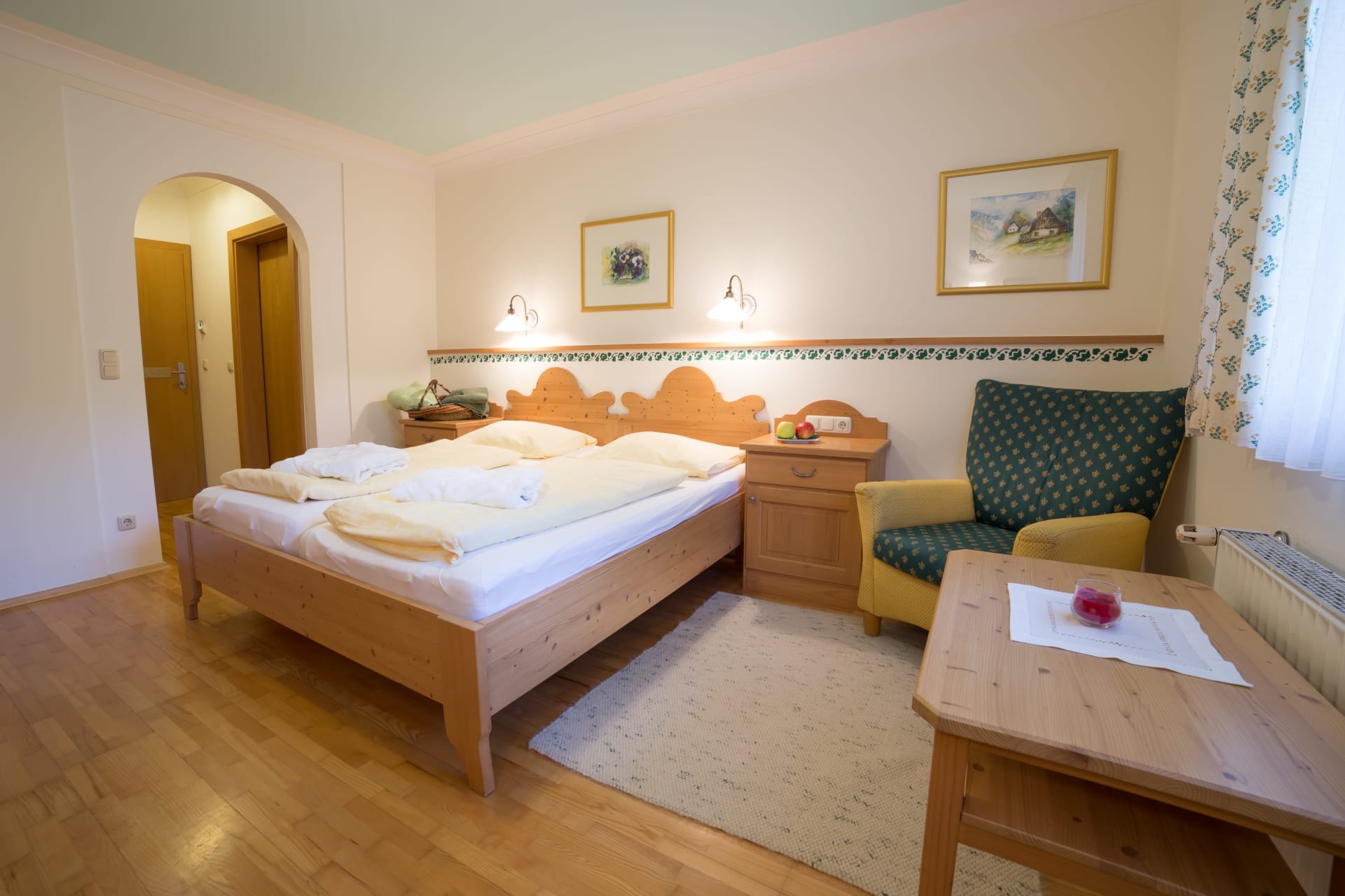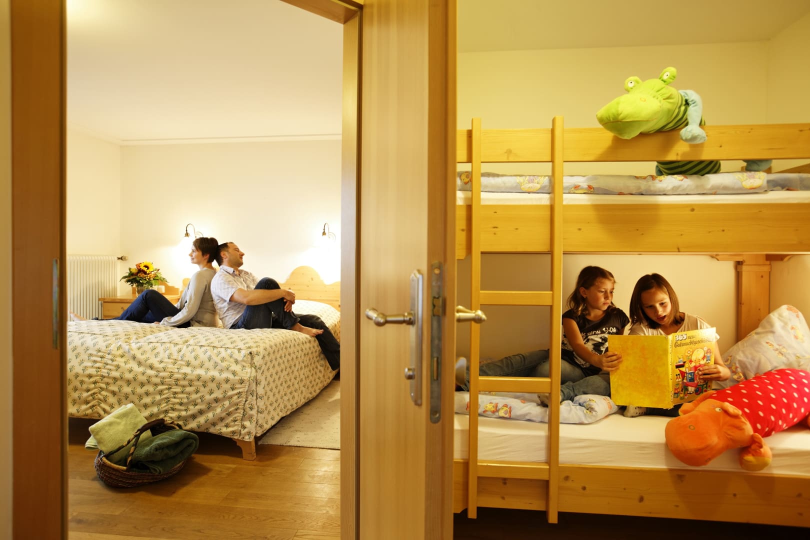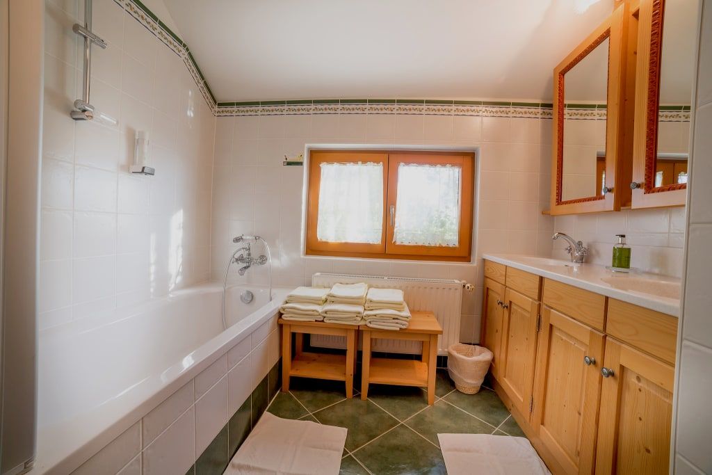 großes Doppelzimmer mit getrenntem Kinderschlafzimmer, Badezimmer mit Badewanne, herrliche Aussicht auf die Alpen