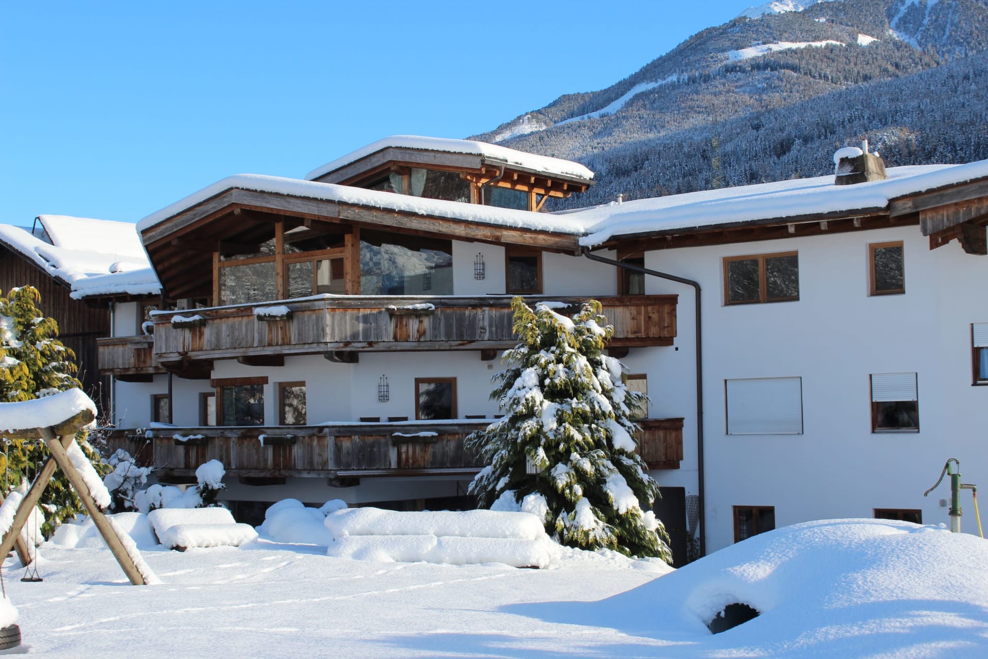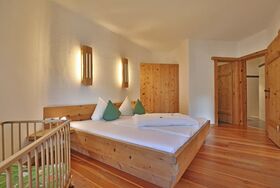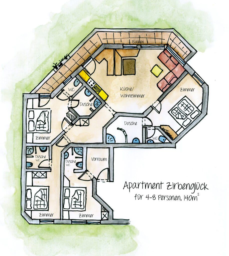 Erleben Sie unvergessliche Tage in unserem luxuriösen und geräumigen Apartment, perfekt geeignet für Familien oder Gruppen von 4 bis zu 8 Personen. Auf großzügigen 130 m² erwarten Sie vier individuell gestaltete Schlafzimmer, jedes ausgestattet mit einem luxuriösen Kingsize-Bett und liebevoll gefertigt aus gesundem Zirbenholz. Die natürlichen Eigenschaften des Zirbenholzes fördern einen erholsamen Schlaf und tragen maßgeblich zu Ihrem Wohlbefinden bei. Jedes Schlafzimmer verfügt über ein eigenes, modernes Badezimmer mit Dusche und WC, sowie Annehmlichkeiten wie Föhn, Leselampen und einen Kosmetikspiegel für Ihren Komfort. Selbstverständlich sind frische Bettwäsche, weiche Handtücher und Badetücher für jeden Gast vorhanden. Der helle und komfortabel eingerichtete Wohnbereich umfasst eine voll ausgestattete Nichtraucher-Wohnküche, die keine Wünsche offenlässt. Hier finden Sie einen Geschirrspüler, eine Mikrowelle, einen Backofen und einen geräumigen Kühlschrank – ideal für gemeinsame Kochabende. Genießen Sie zudem den Zugang zu einem privaten Balkon mit Blick auf den Spielplatz, der zum Entspannen und Verweilen an der frischen Luft einlädt. Zusätzlich stehen Ihnen ein gemütlicher Aufenthaltsraum und ein separates Kinder-Spielzimmer zur Verfügung, die für Unterhaltung bei Groß und Klein sorgen. Unser Apartment ist selbstverständlich ein Nichtraucherbereich, um Ihnen eine frische und angenehme Atmosphäre zu garantieren.