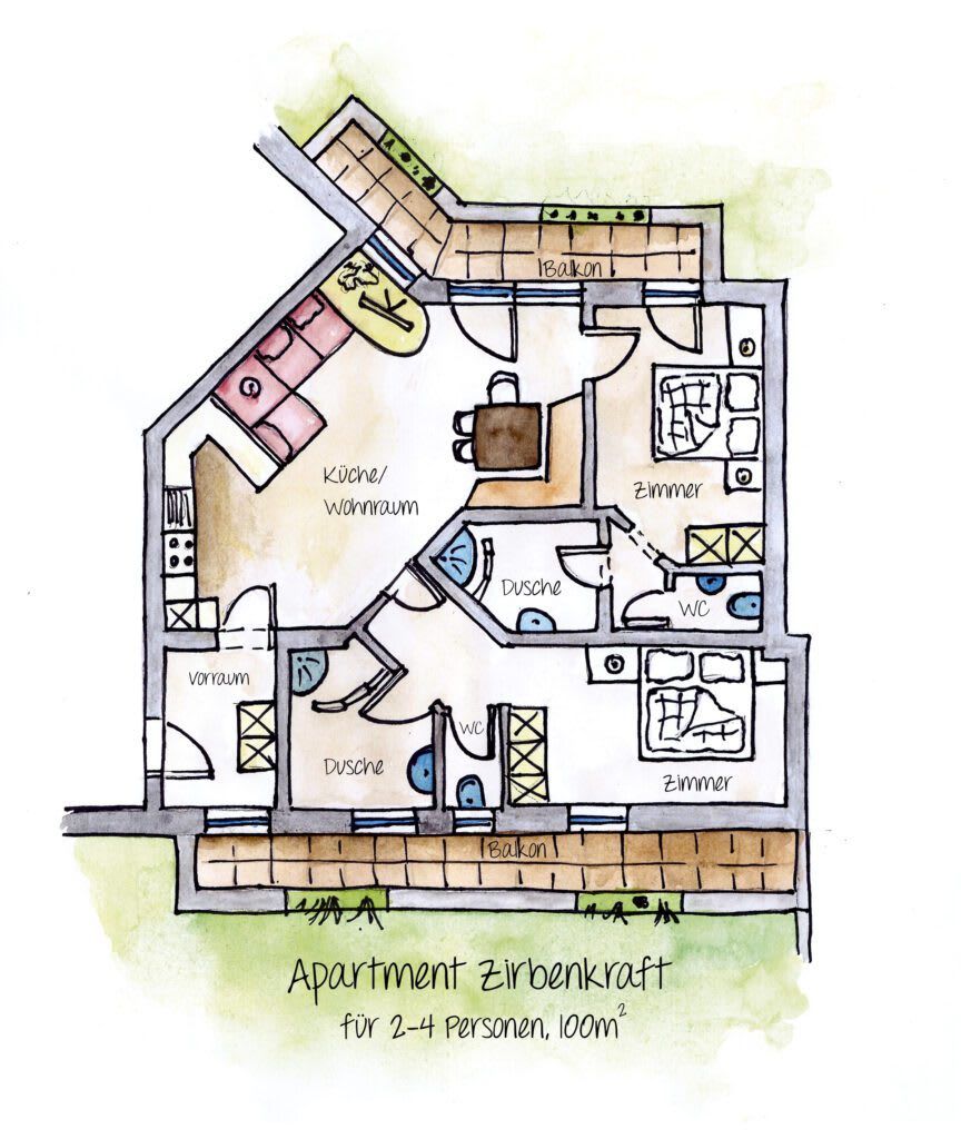 Entdecken Sie unsere großzügige und komfortable 90 m² große Ferienwohnung, perfekt für 2 bis 4 Personen. Genießen Sie tiefen, erholsamen Schlaf in unseren zwei separaten Schlafzimmern, die jeweils mit einem luxuriösen Kingsize-Bett ausgestattet sind. Die Schlafzimmer aus naturbelassenem Zirbenholz fördern nachweislich einen ruhigeren Schlaf und sind besonders wohltuend für Allergiker. Die Wohnung verfügt über zwei moderne Badezimmer mit separater Dusche und WC. Für Ihren Komfort sind hochwertige Bettwäsche, flauschige Handtücher und Badetücher, ein Föhn, Leselampen sowie ein Kosmetikspiegel selbstverständlich vorhanden. Die voll ausgestattete und gemütliche Wohnküche lässt keine Wünsche offen und lädt mit Geschirrspüler, Mikrowelle, Backofen und Kühlschrank zum gemeinsamen Kochen und Verweilen ein. Von Ihrem privaten Balkon, der sowohl vom Wohnbereich als auch von der Küche zugänglich ist, genießen Sie einen atemberaubenden Panoramablick auf die majestätische Bergwelt – der ideale Ort für entspannte Stunden. Als reine Nichtraucherwohnung garantieren wir Ihnen ein stets frisches und angenehmes Raumklima. Zusätzlich stehen Ihnen ein liebevoll eingerichtetes Kinder-Spielzimmer und ein gemütlicher Aufenthaltsraum zur freien Verfügung, die jederzeit für Unterhaltung und Entspannung sorgen.