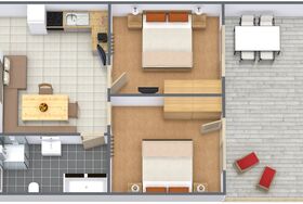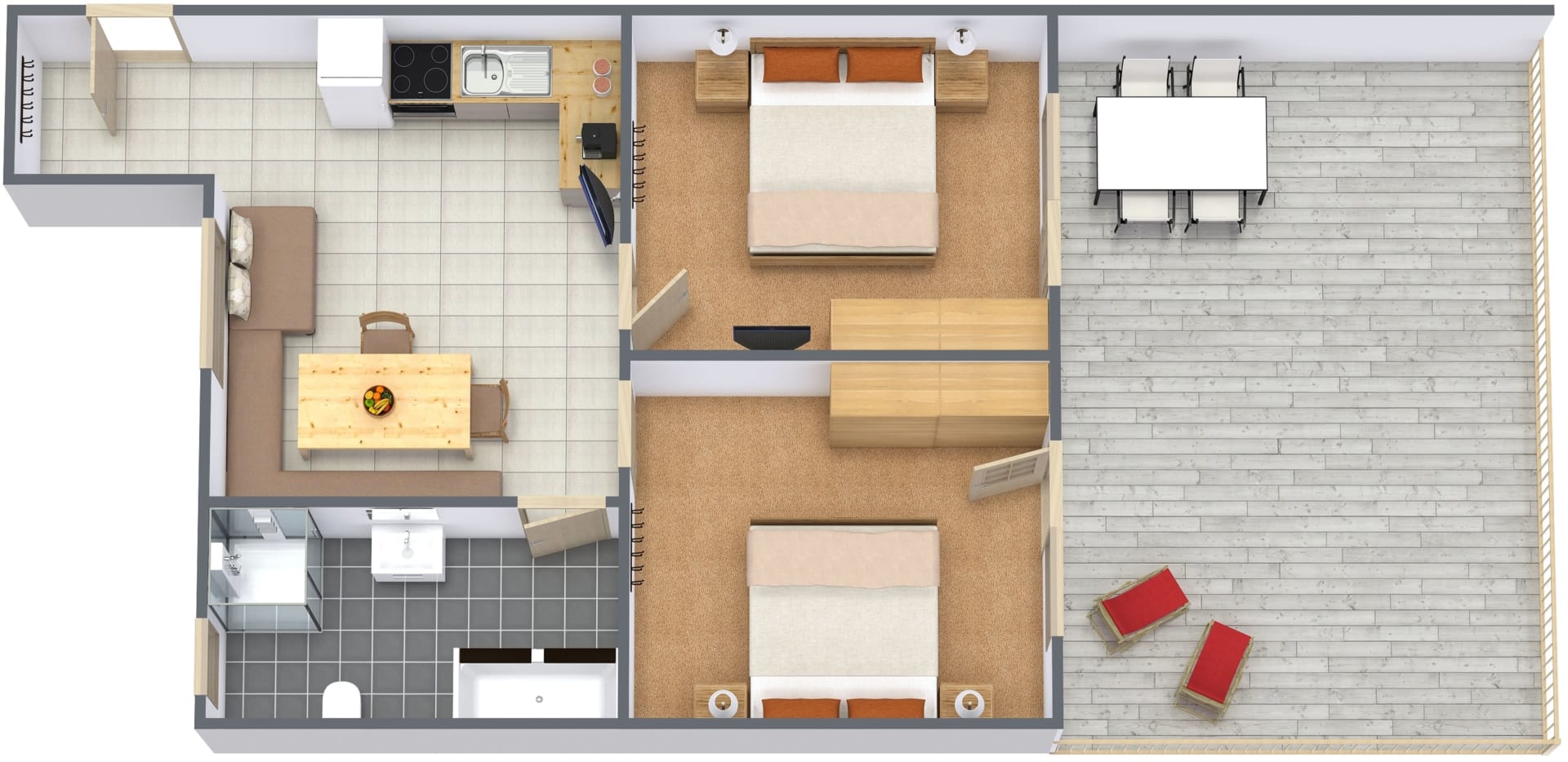 2 getrennte Schlafzimmer, komfortable Wohnküche voll ausgestattet (Geschirrspüler, Cerankochfeld Kaffeemaschine), Couch, gemütliche Essecke, Bad mit Badewanne und Dusche, WC, Sat TV, Panoramaterrasse zur Südseite mit Balkonmöbeln und Liegestühlen.