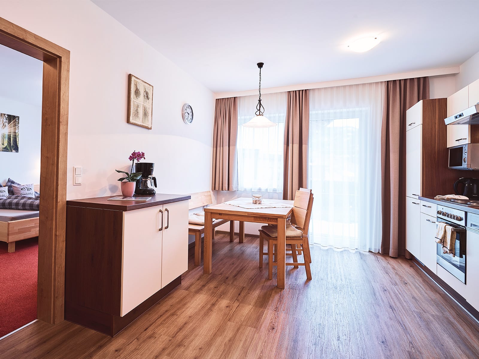 Das Appartement befindet sich im Erdgeschoss und verfügt über eine Terrasse mit kleinem Garten von wo Sie einen wunderbaren Panoramablick auf die umliegende Bergwelt genießen können. Es ist liebevoll und gemütlich eingerichtet und bietet Ihnen Platz für 4 bis 5 Personen auf ca. 54m² und verfügt über 2 Schlafzimmer und 2 Badezimmer mit Dusche und WC, eine voll ausgestattete Wohnküche mit Ess-Ecke. Jedes unserer Appartement verfügt über ein kostenloses W-LAN und einen eigenen Parkplatz direkt vor dem Haus. Im Schi -Raum steht ein Schischuh und Wanderschuhtrockner für Sie bereit. Bei Bedarf stellen wir Ihnen gerne ein Gitterbett zu Verfügung.
