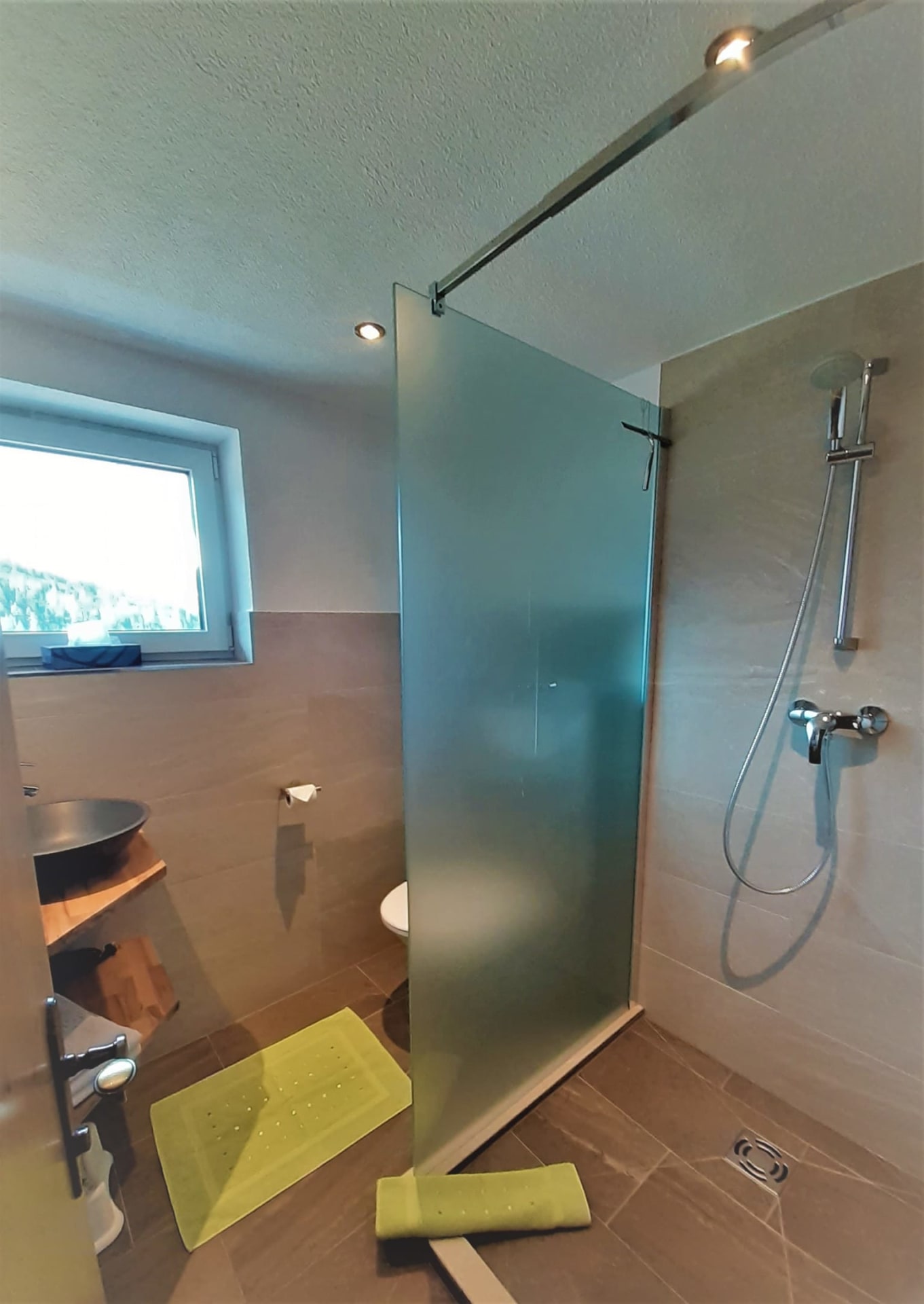 • Badezimmer mit Walk-in Dusche, WC und Föhn