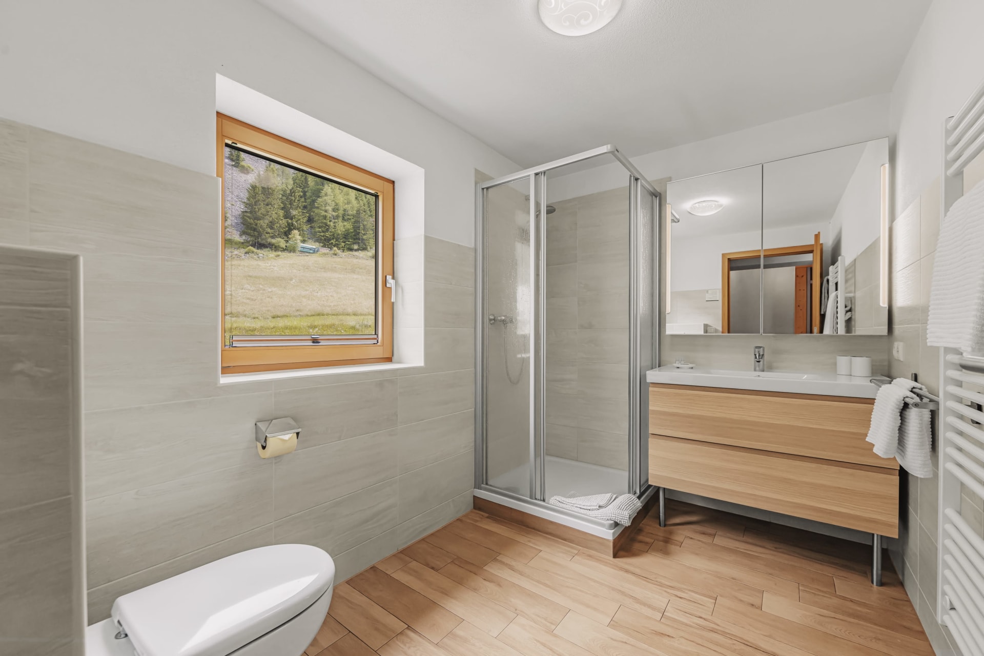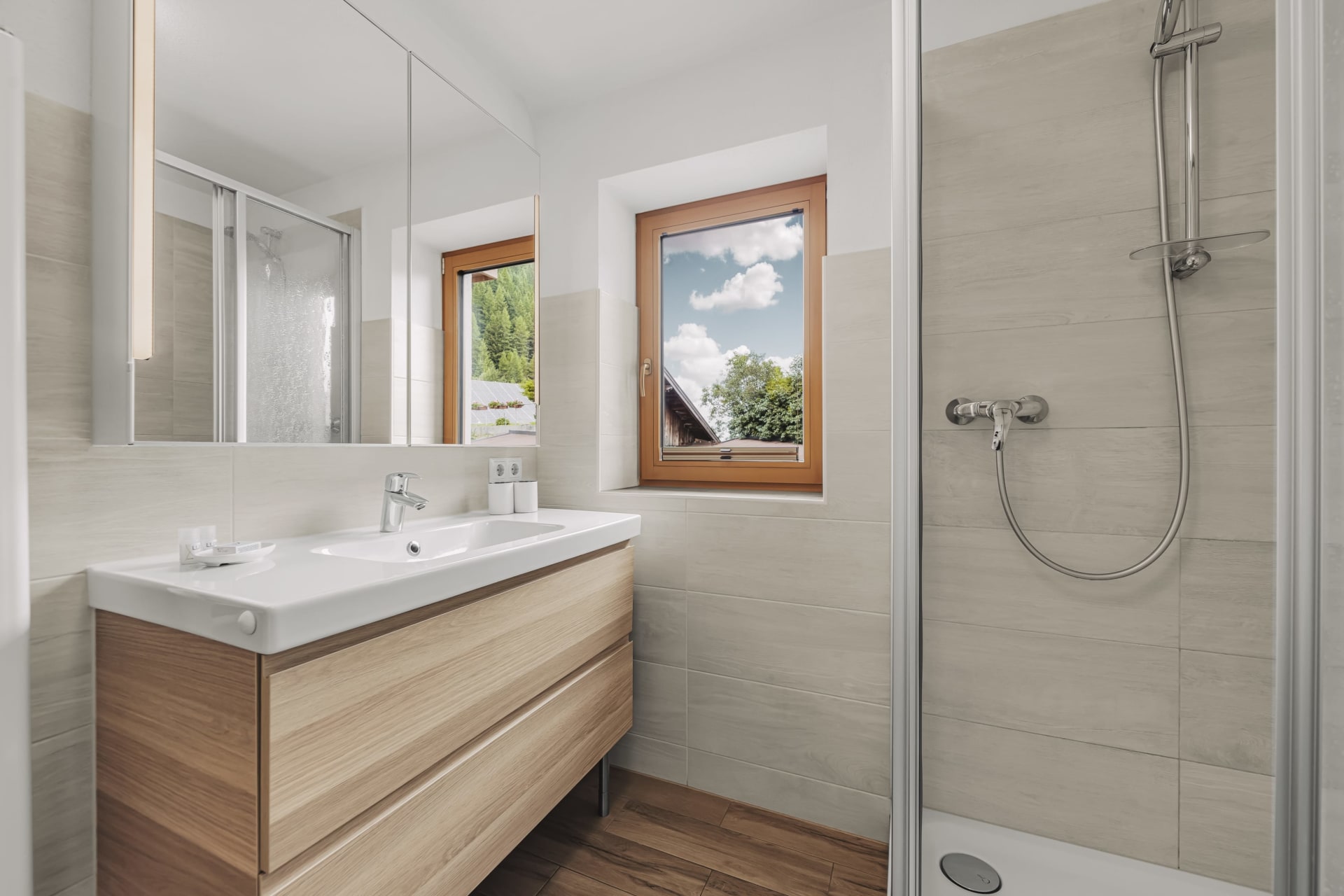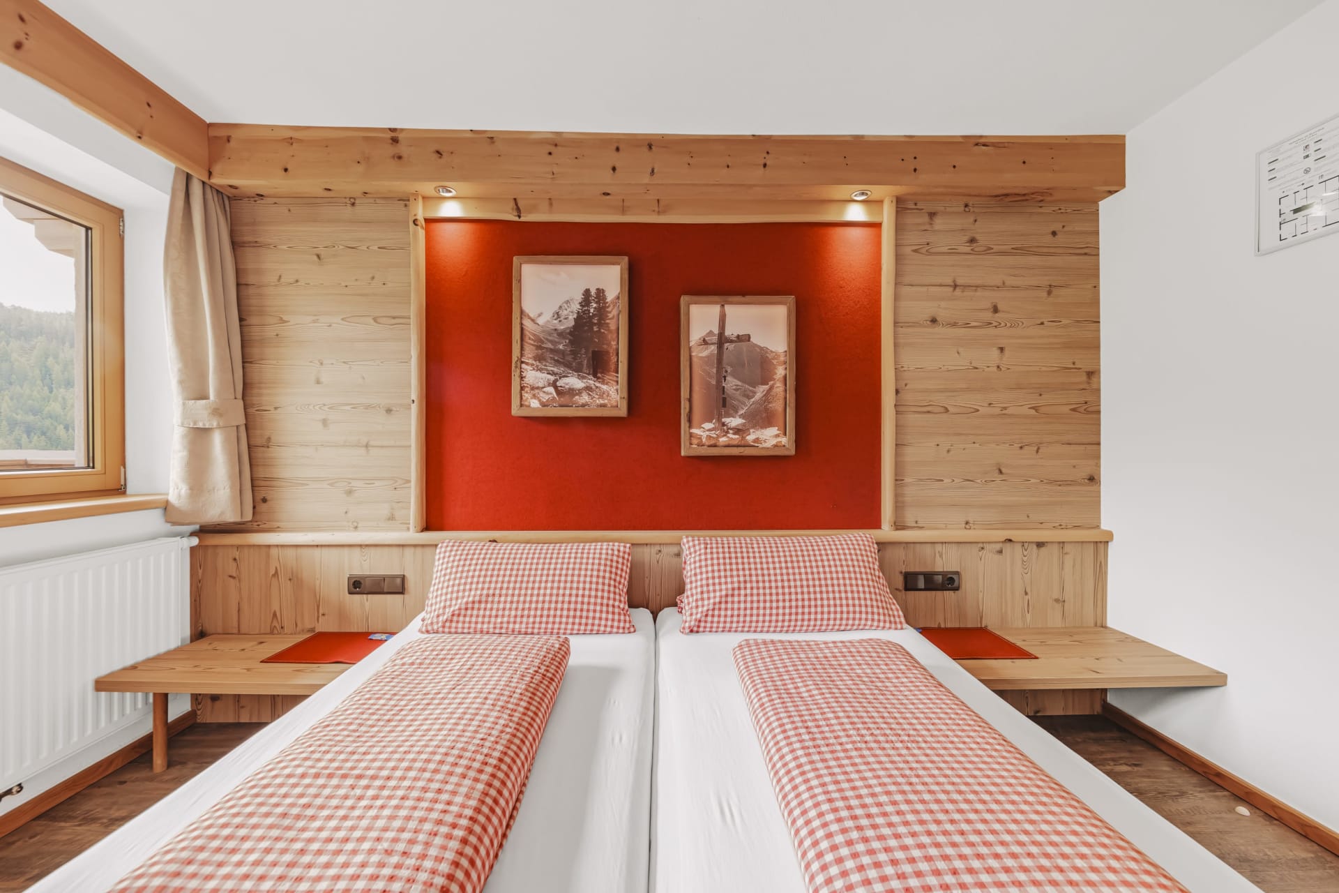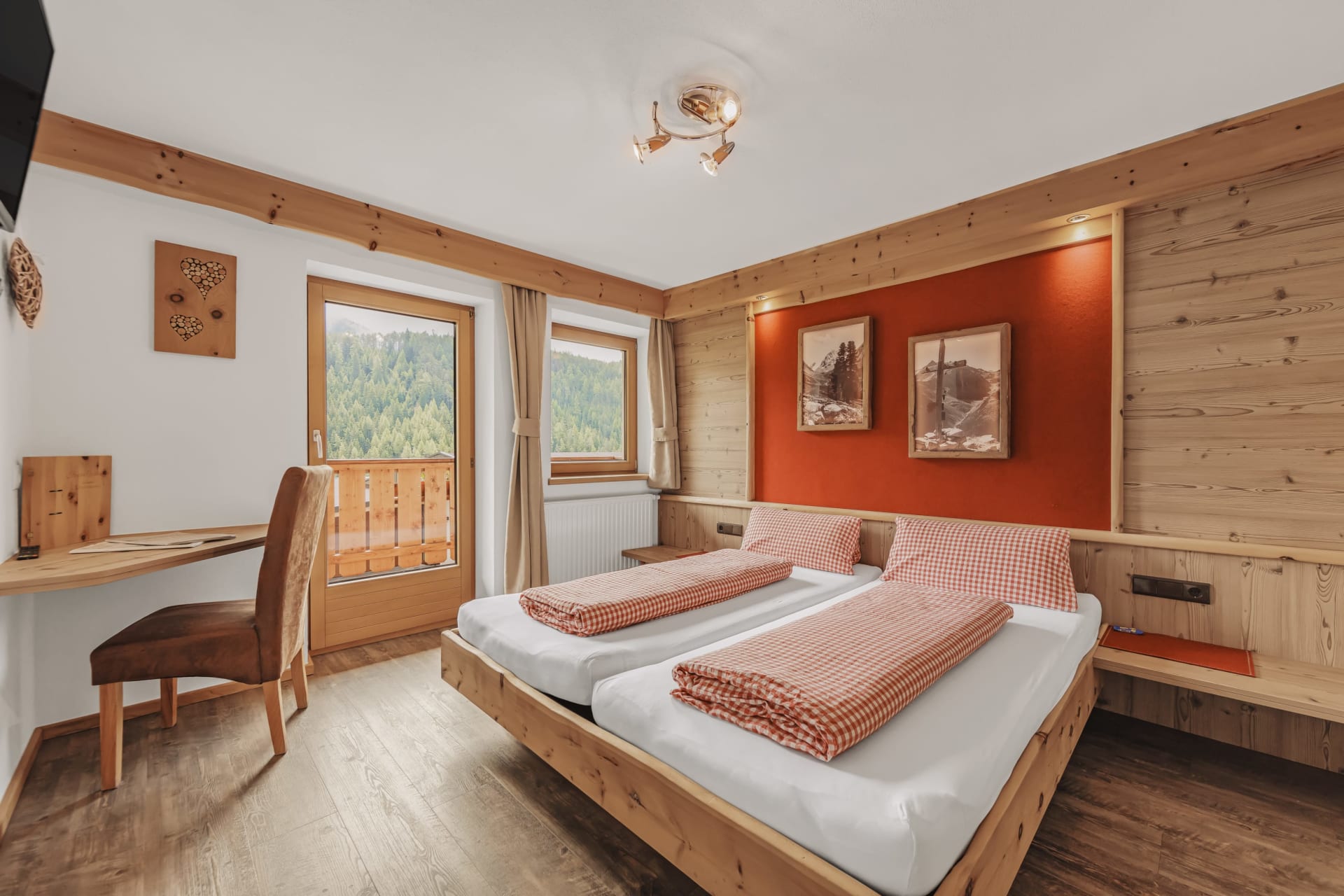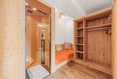 Das Zimmer Hemerkogel ist mit einer Infarotkabine , großes Bad (Dusche und WC), kleiner Couch und Zirben - Doppelbett ausgestattet.