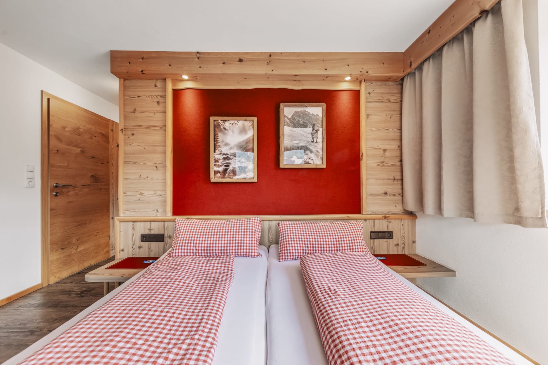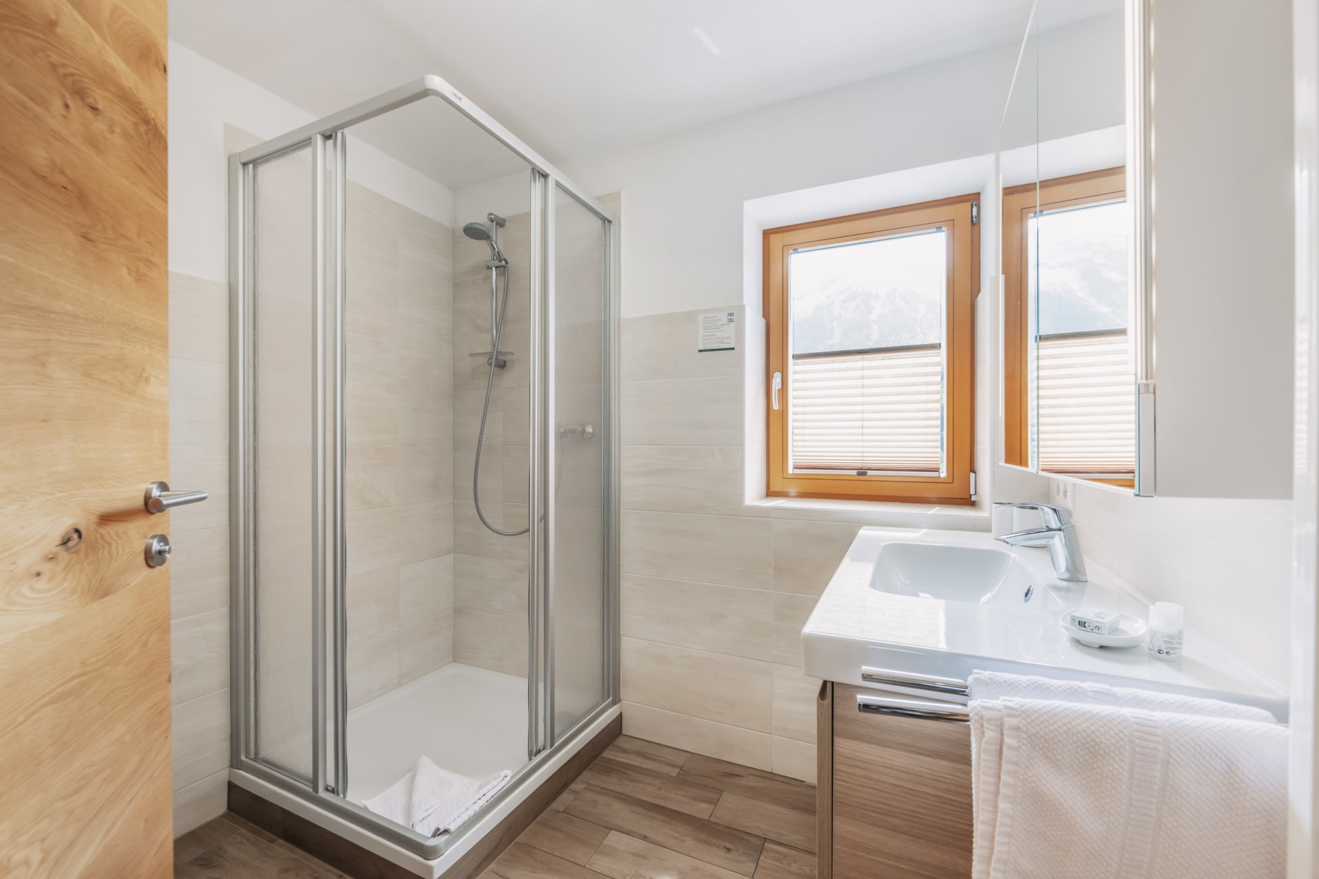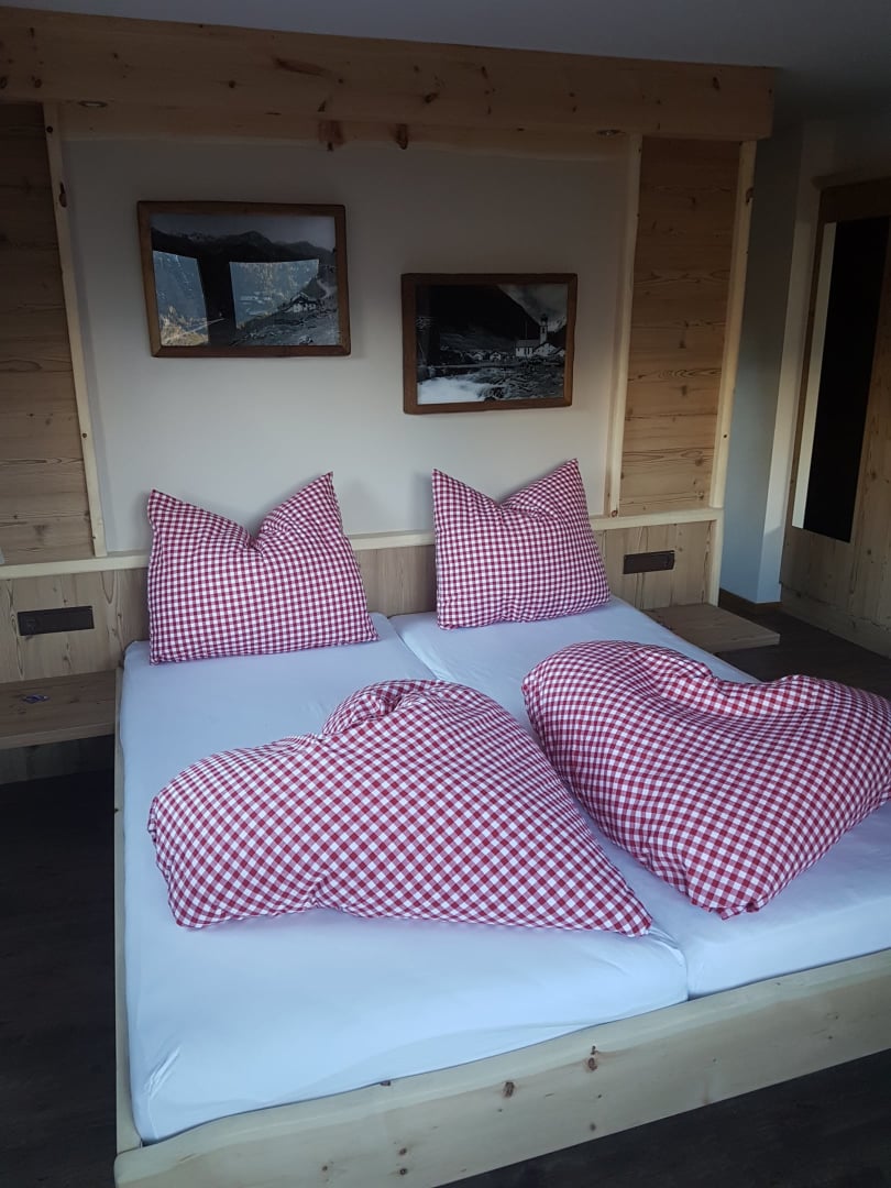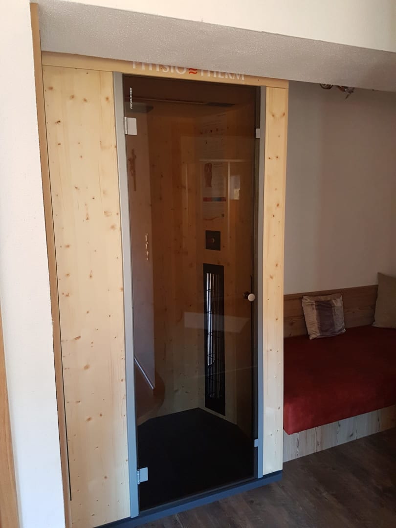 Das Zimmer Blockkogel ist mit einer Infarotkabine , großes Bad (Dusche und WC) und Zirben - Doppelbett ausgestattet.