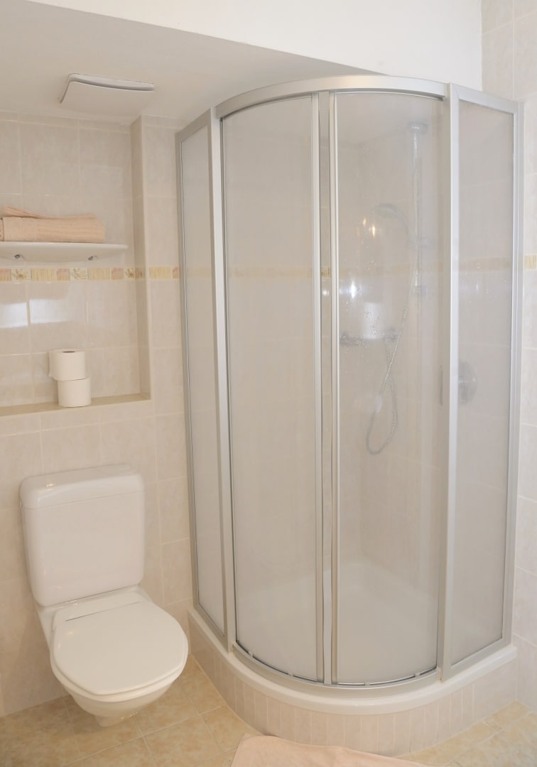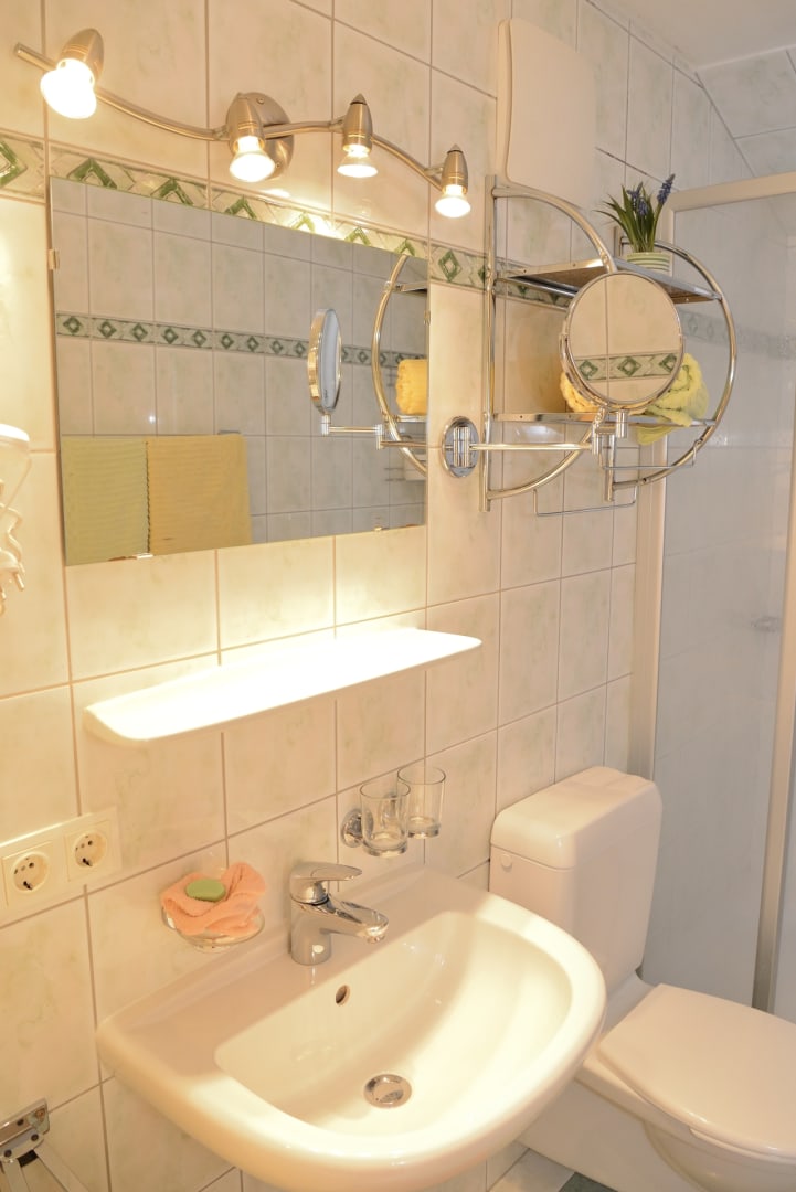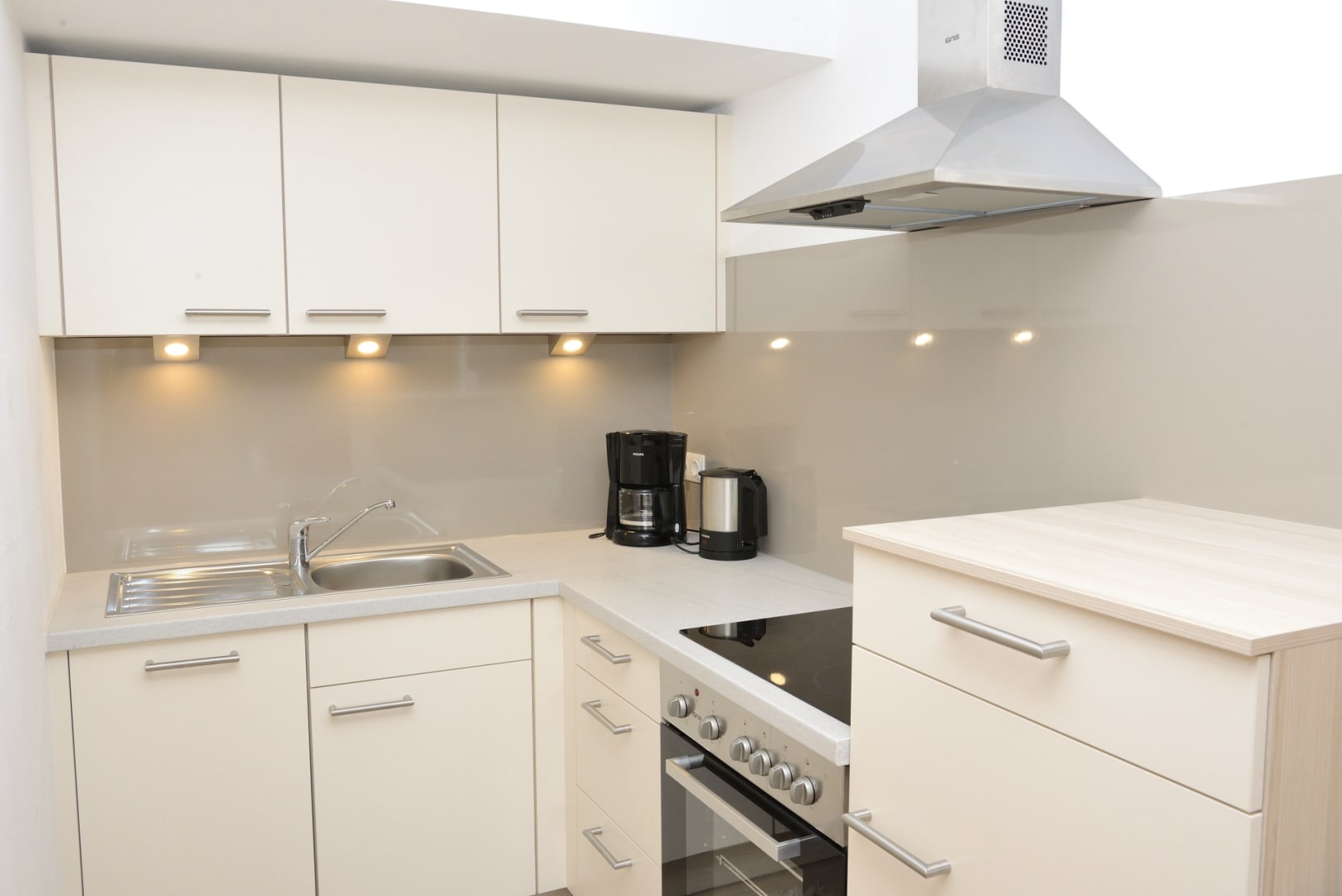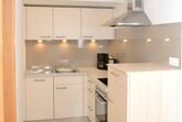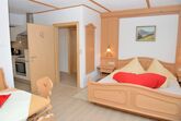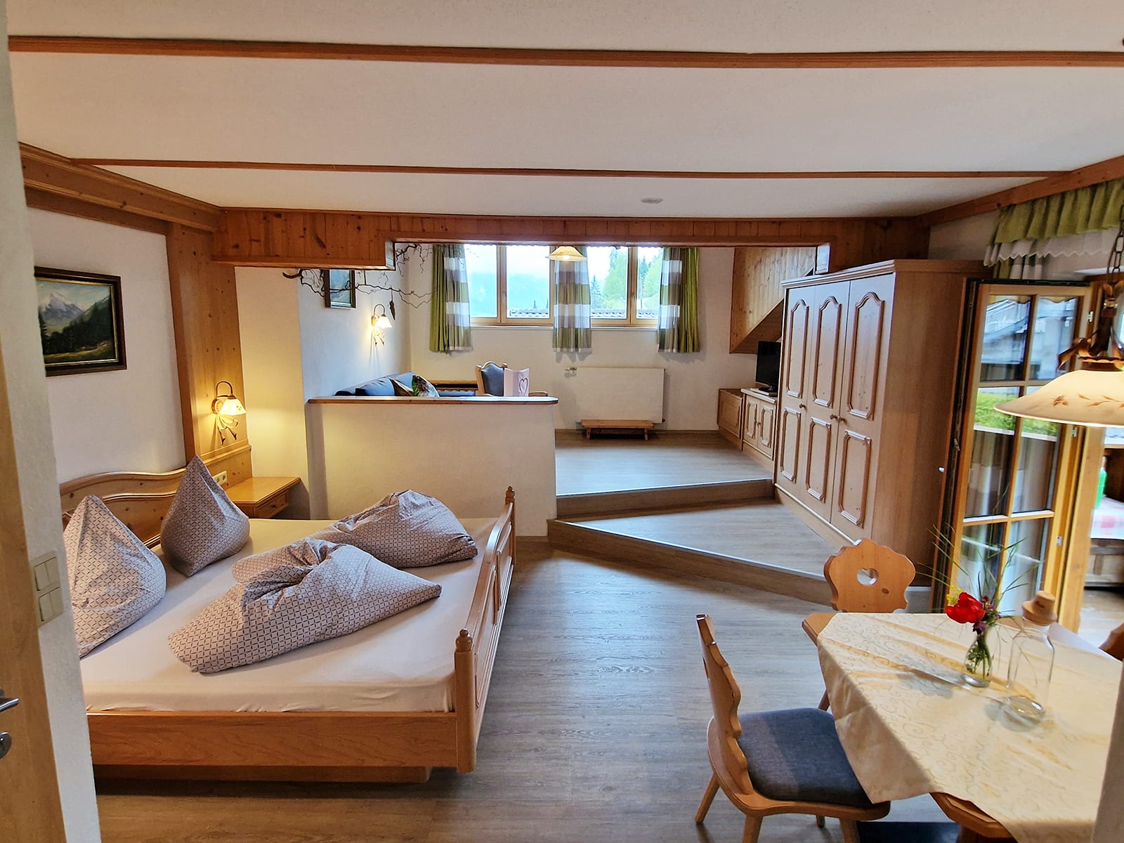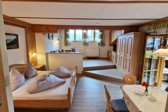 Wohnraum mit Dachgaube 2 Stufen erhöht, Sitzgruppe mit Sat-TV, Doppelbett, gegenüber Essecke, Kleinküche mit kompletter Ausstattung, Bad/WC/Fön, Balkon