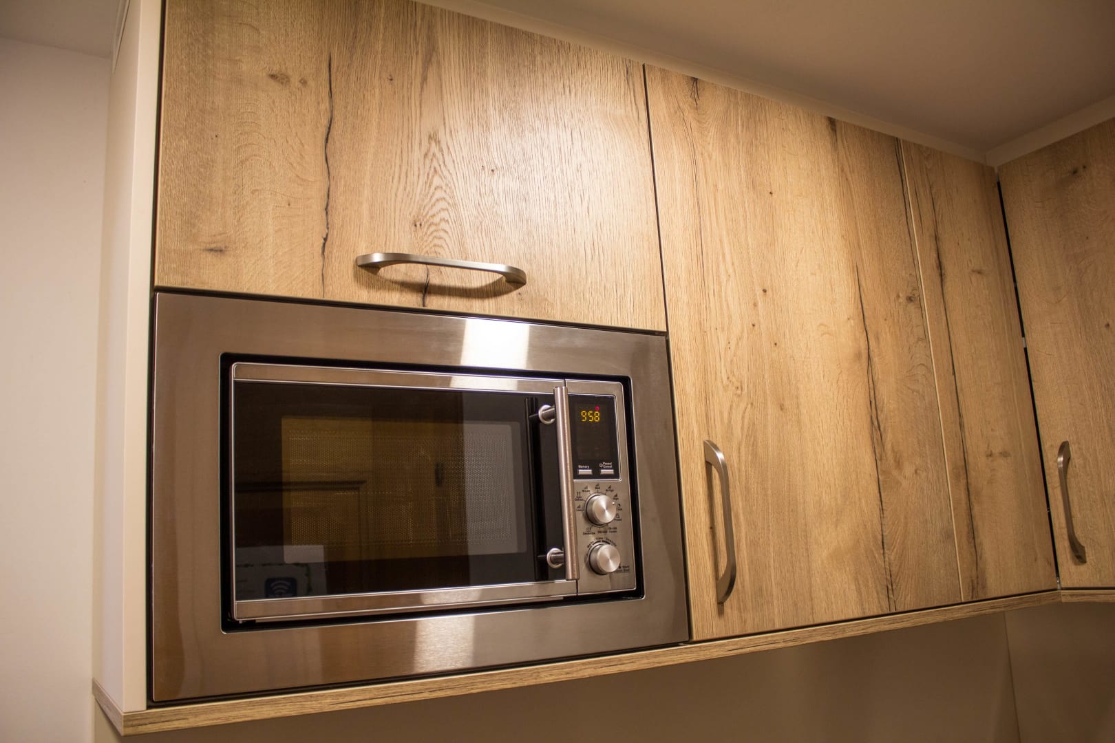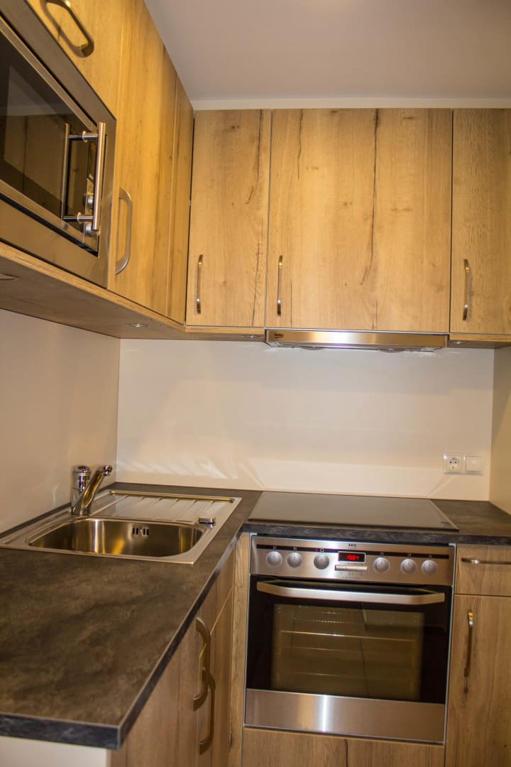 Kochnische mit Backrohr und Ceranfeld, Kühlschrank, Kaffeemaschine und Wasserkocher - komplett ausgestattet.