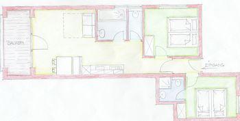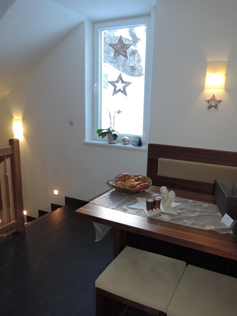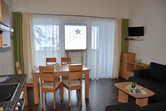 Das naturbelassene Fichtenholz des Sichtdachstuhls erzeugt eine besonders gemütliche Atmosphäre in Ihrem Urlaubszuhause. Das Süd-Appartement II ist ca. 60 m² groß bietet Platz für 2 - 6 Personen. Ausstattung: ein Doppelzimmer mit Flat TV, Badezimmer mit Badewanne und Föhn, separates WC, ein 2. Doppelzimmer mit Flat TV und eigener Dusche und WC, Wohnraum mit Flat-TV und ausziehbarem Sofa (Liegefläche 140x200), voll ausgestattete Küche (Backrohr, Kühlschrank mit Gefrierfach, Mikrowelle, Cerankochfeld mit 4 Kochplatten, Geschirrspüler mit Tabs, Wasserkocher, Kaffeemaschine, Geschirr) großer Südbalkon mit Sitzgelegenheit und Sonnenliegen, Safe, WLAN. Ein Doppelzimmer bietet Platz für ein Zusatzbett für eine 7. Person.