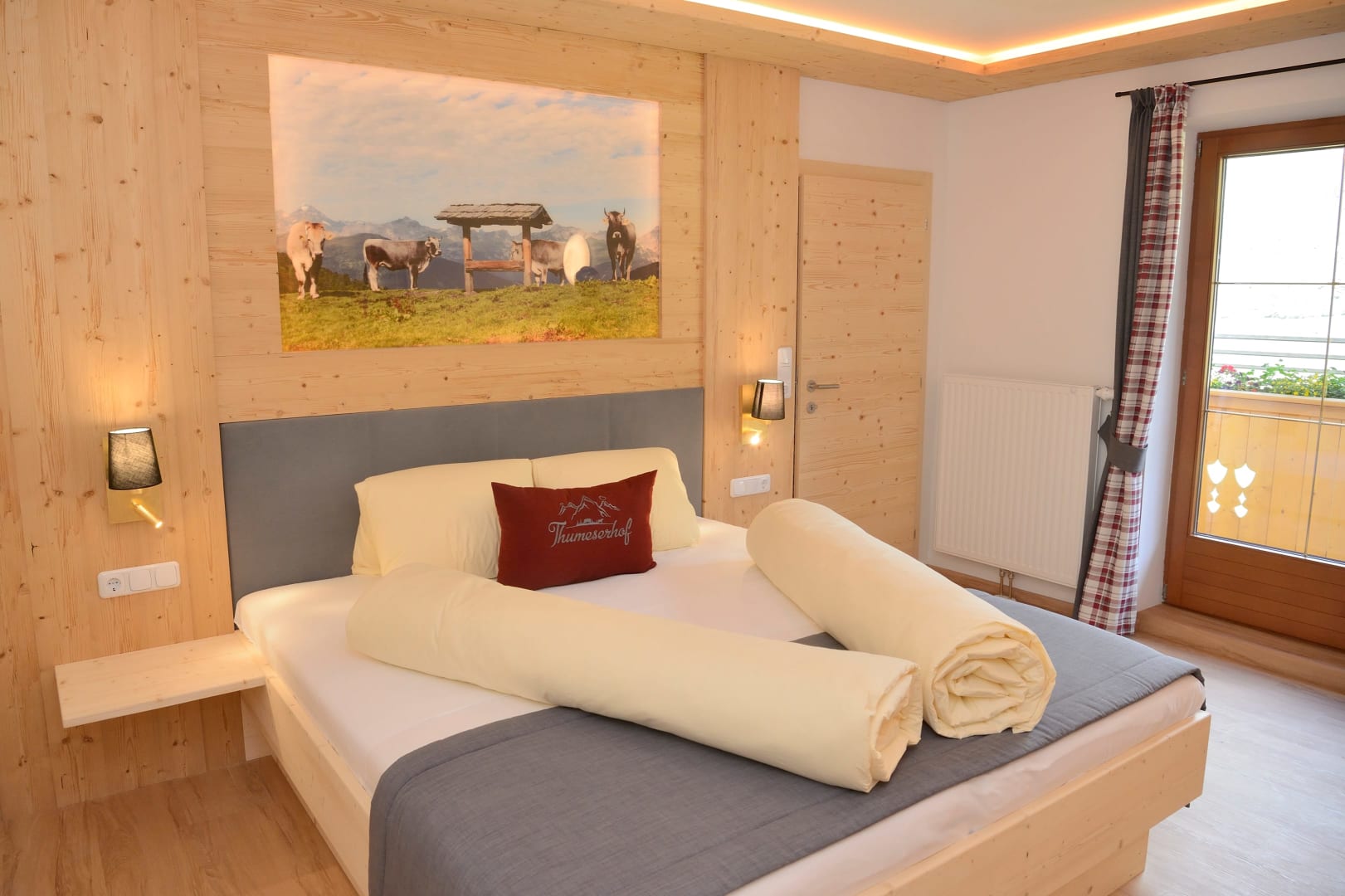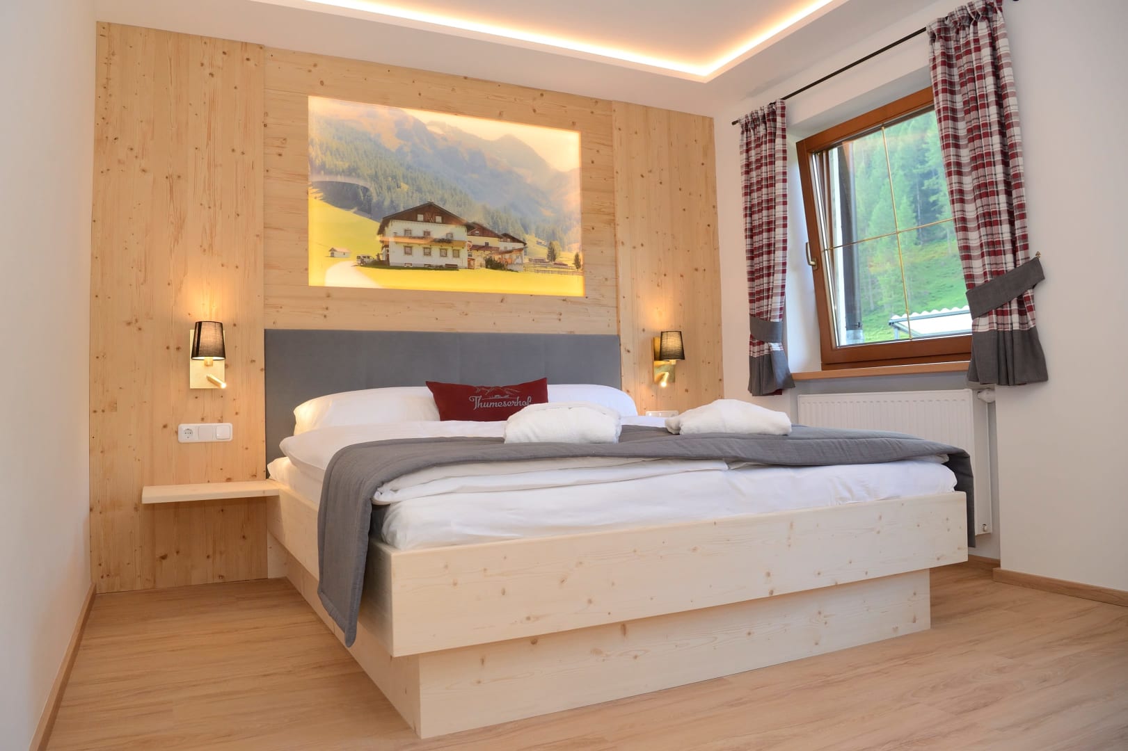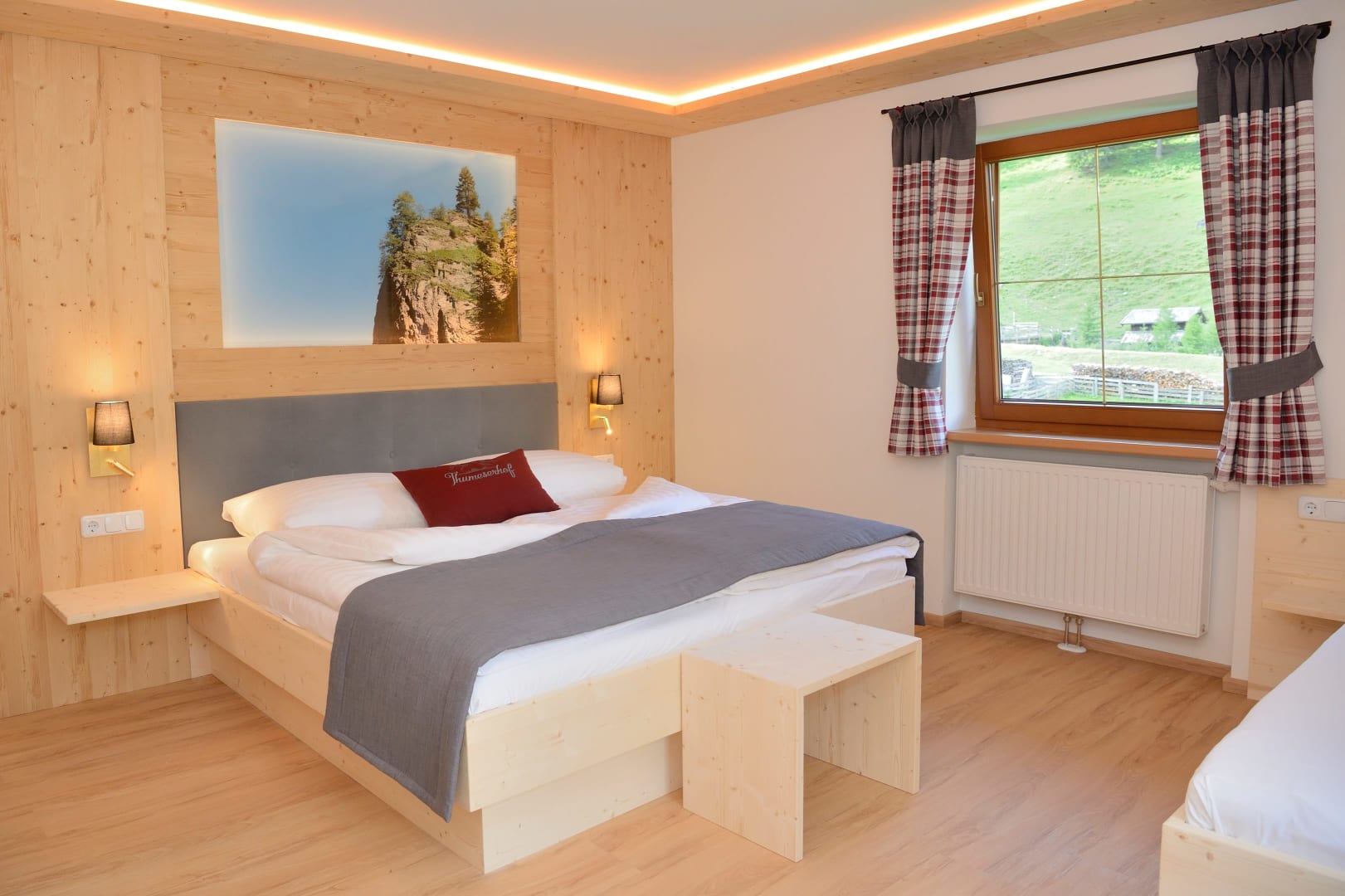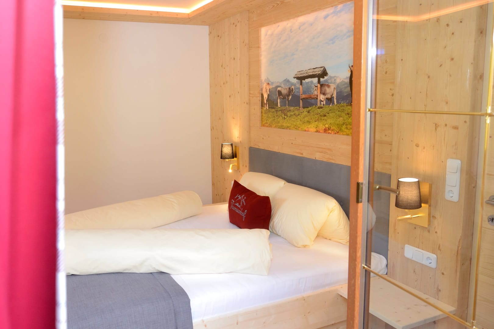 Das Zimmer Ramsgruben ist in Vollholz Fichte eingerichtet mit einem eigenen tollen Badezimmer. Durch die unterschiedliche Lichtgestaltung kann ich mir gemütliche oder helle Stimmung schaffen. Das Zimmer hat ein Zusatzbett für Kinder und einen Mini Kühlschrank.