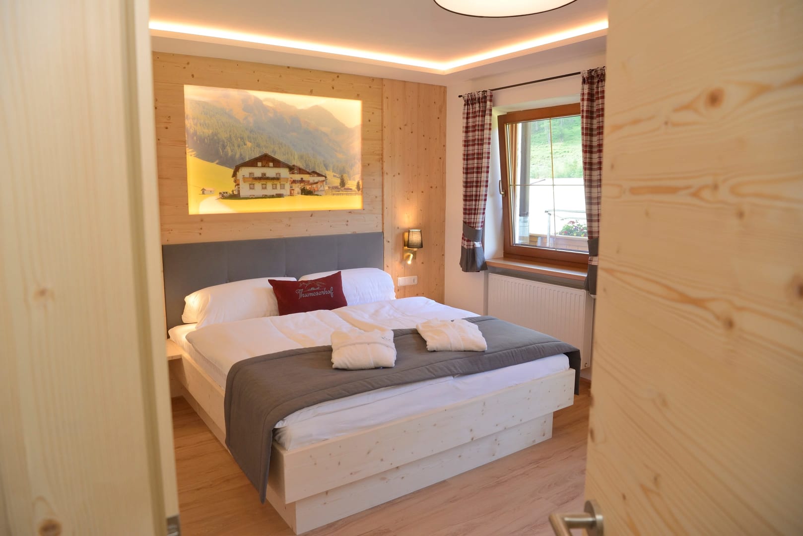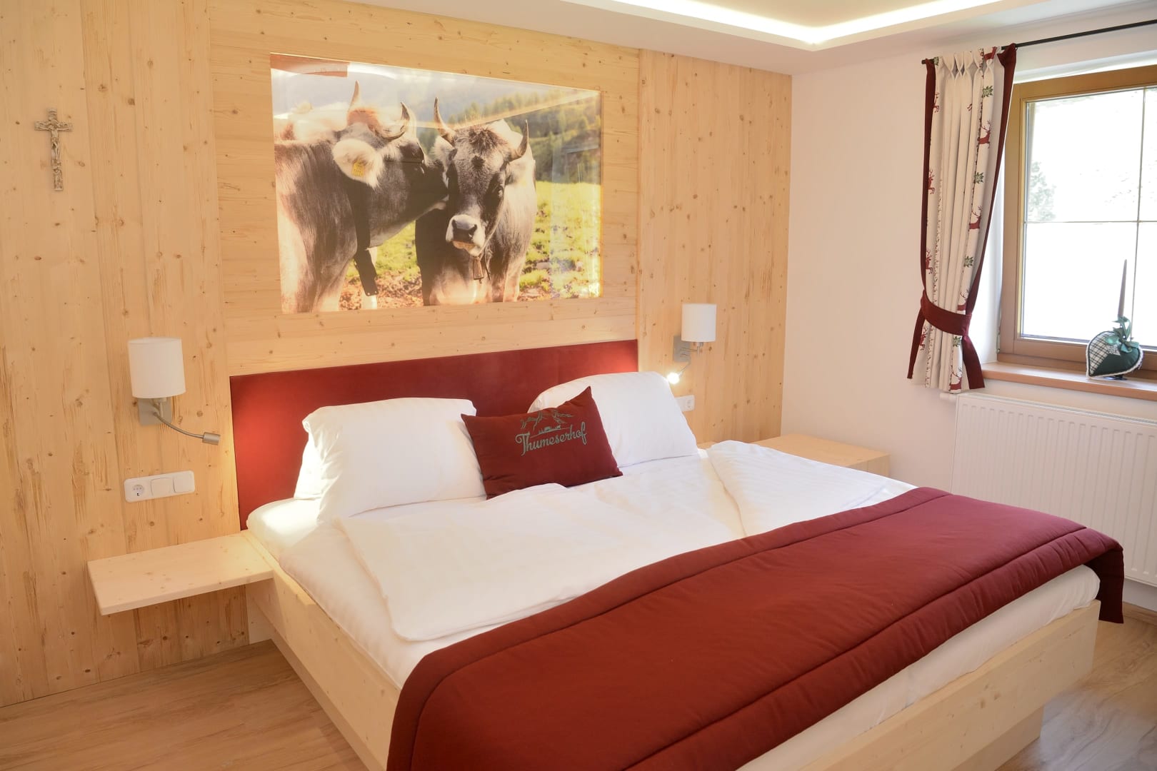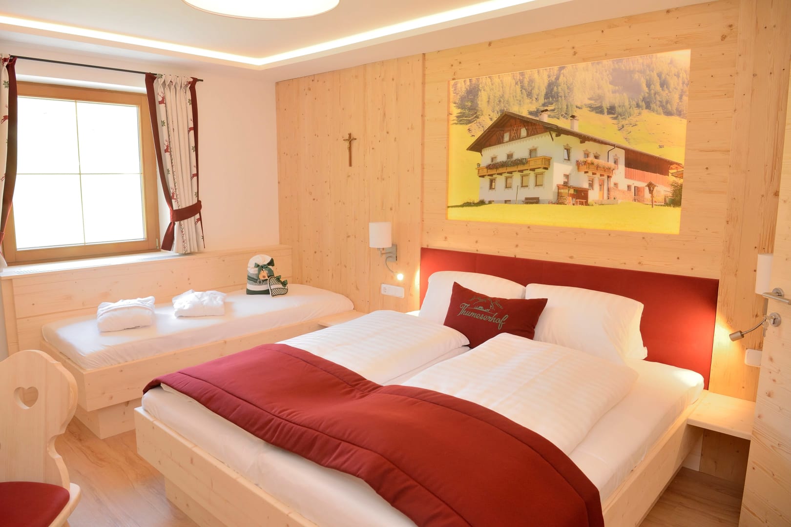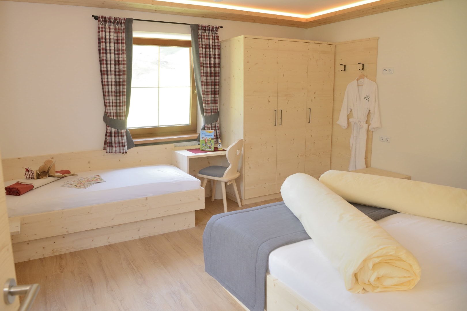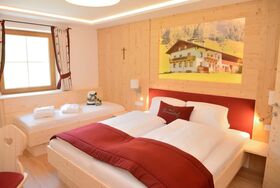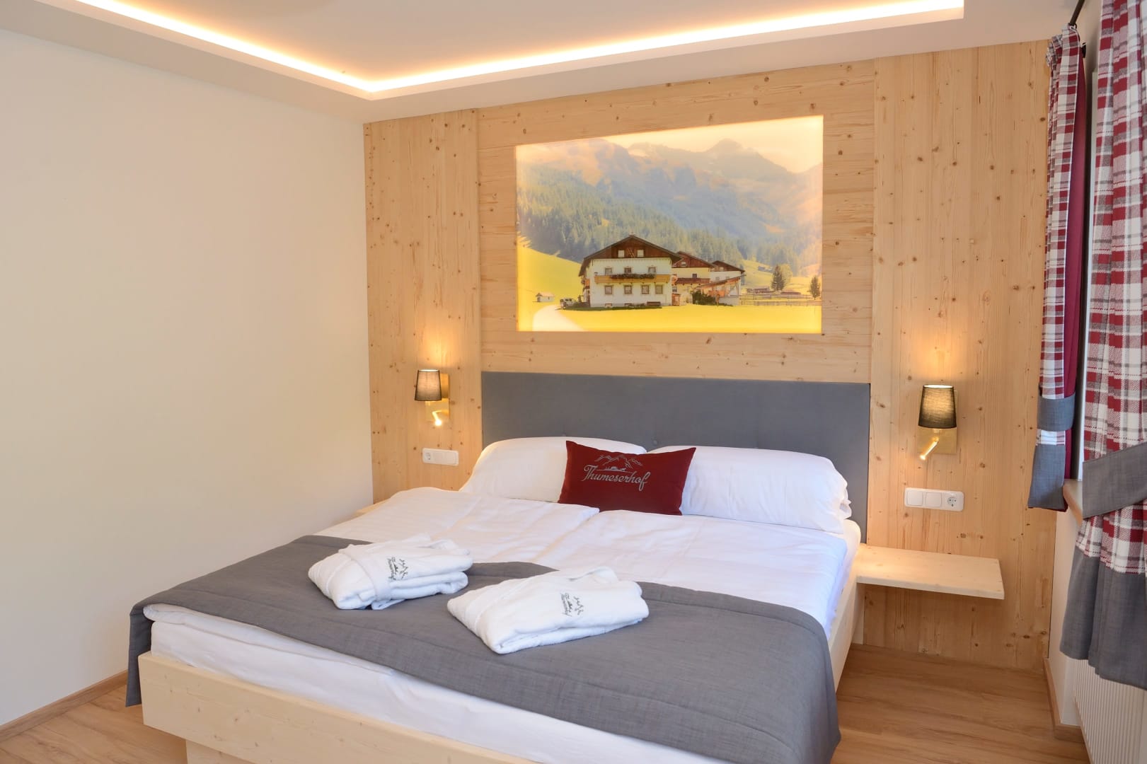 Das Zimmer Ramsgruben ist in Vollholz Fichte eingerichtet mit einem eigenen tollen Badezimmer. Durch die unterschiedliche Lichtgestaltung kann ich mir gemütliche oder helle Stimmung schaffen. Das Zimmer hat ein Zusatzbett für Kinder und einen Mini Kühlschrank.