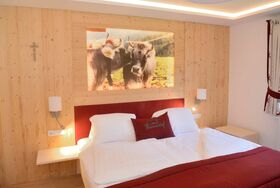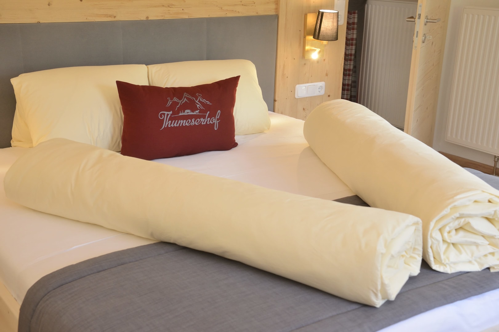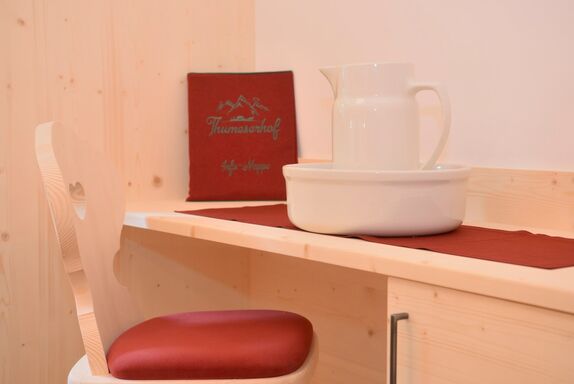 Das Zimmer Fußstoan ist in Vollholz Fichte eingerichtete mit einem tollen Badezimmer. Durch die unterschiedliche Lichtgestaltung und die Dekorathabe ich eine gemütliche Stimmung. Das Zimmer hat einen Mini-Kühlschrank