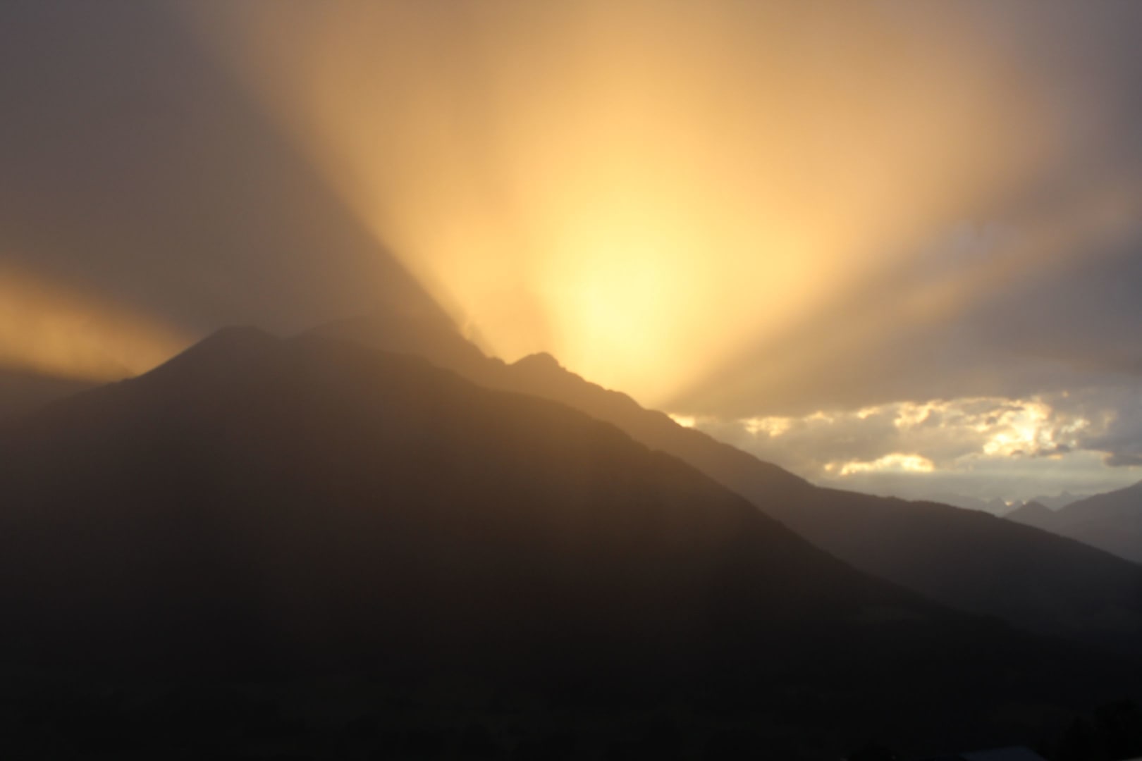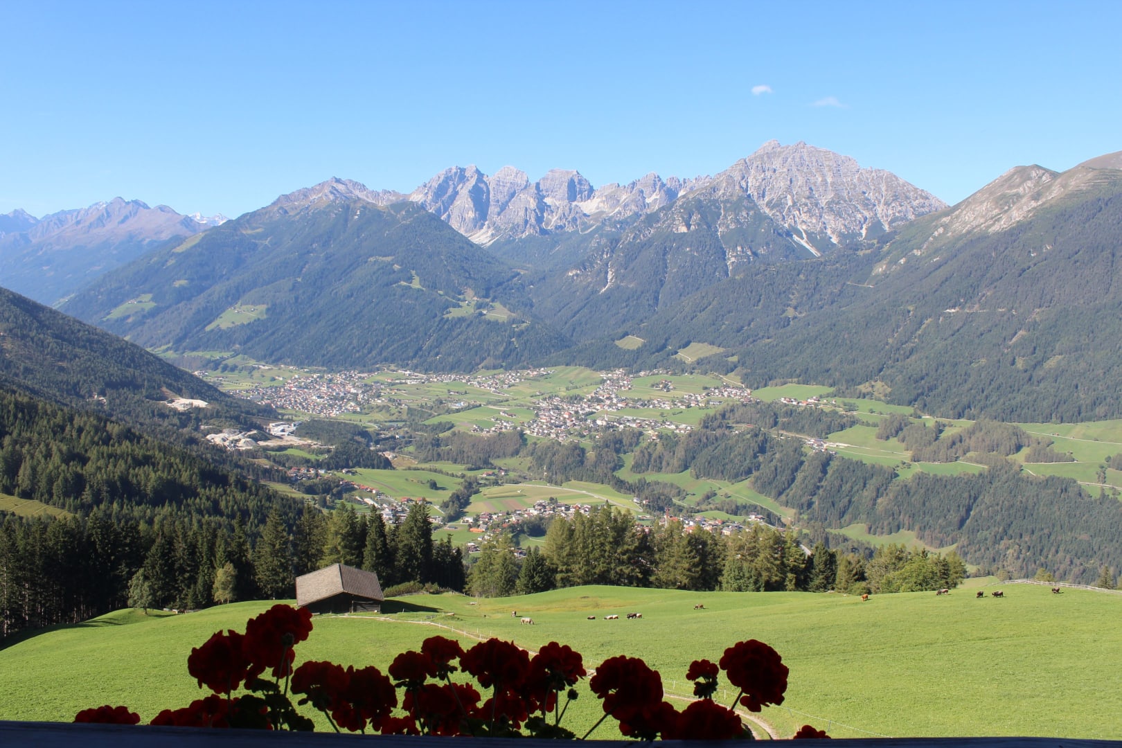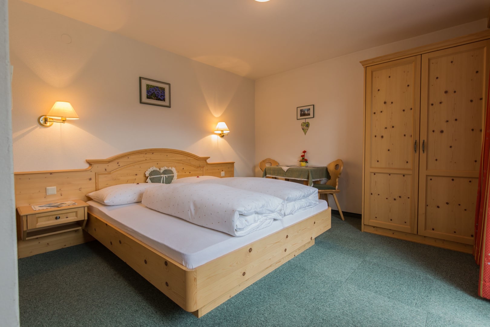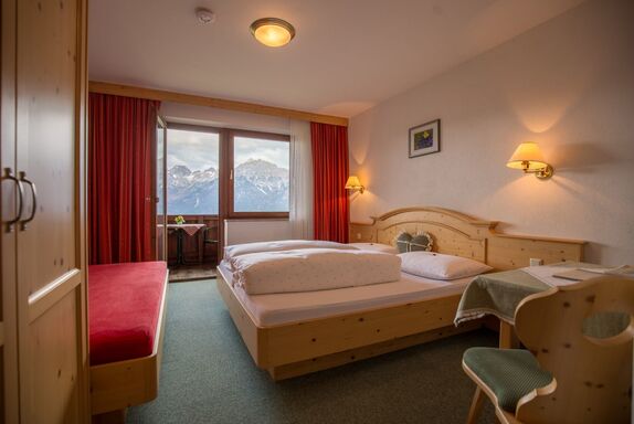 Den Sonnenuntergang erleben im gemütlich, liebevoll eingerichteten Doppelbettzimmer mit DU/WC und West-Balkon (mit Sitzgarnitur), mit Blick auf die Stubaier Bergwelt und ins Stubaital