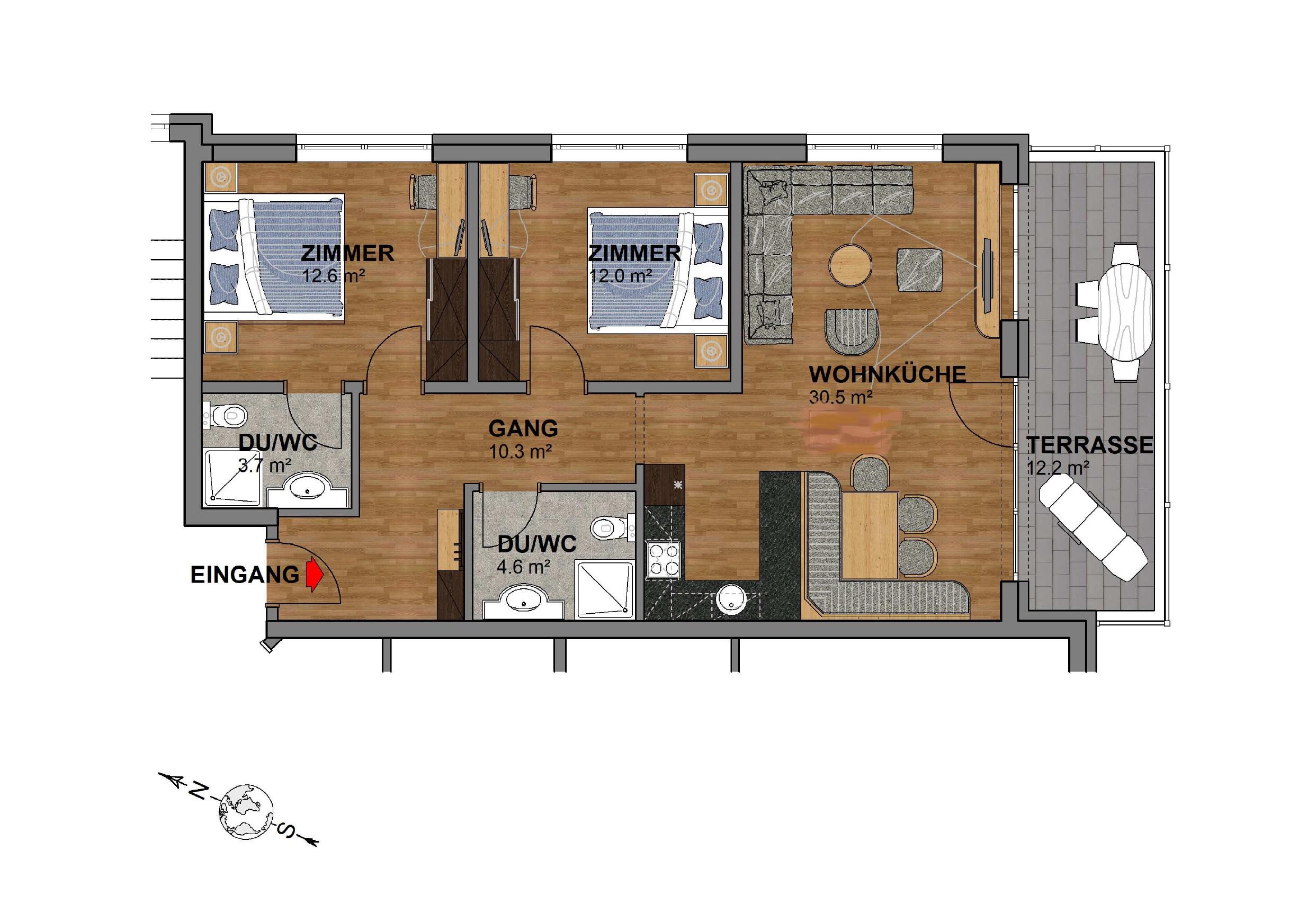 Top 10 mit ca. 73 m²: 1 voll ausgestattete Wohnküche mit Cerankochfeld, Backrohr, Mikrowelle, Geschirrspül- und Kaffeemaschine, gemütlicher Essecke, Kabel TV, großer Wohnbereich mit ausziehbarer Sofalandschaft; 2 Schlafzimmer mit Doppelbett und großen Kleiderschrank, 2 Badezimmer mit Dusche und WC. Balkon