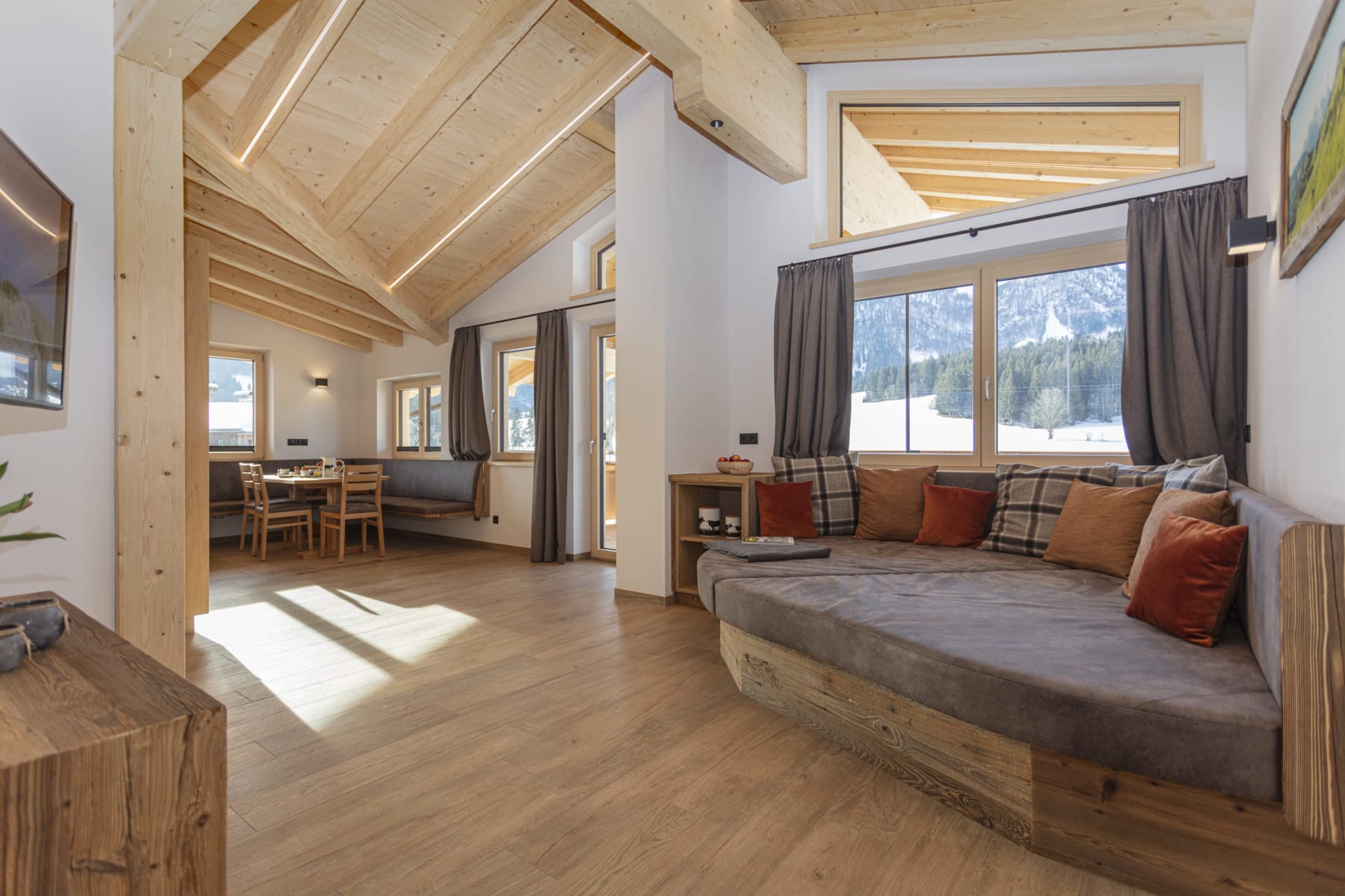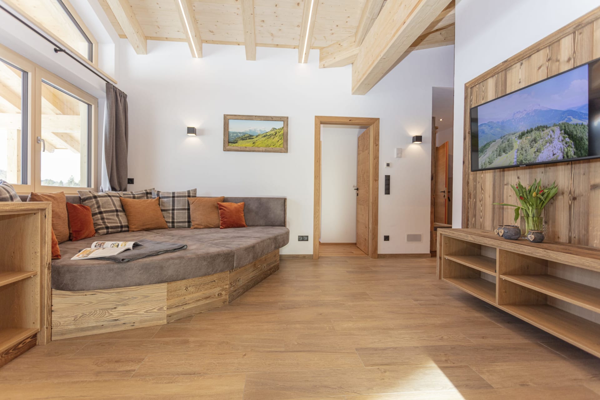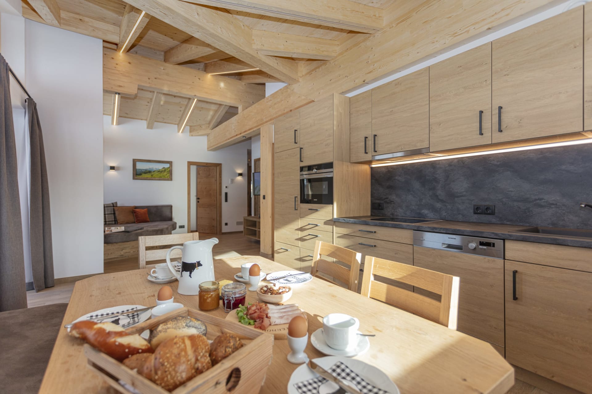 Die Wohnung Karstein ist das Spiegelbild zur Wohnung Buchenstein. Beim Einrichten wurde sehr viel Bedacht aufs Detail gelegt, und Naturmaterialien wie Holz, Stein und vieles mehr verarbeitet. Mit zwei Bäder, zwei ZIRBEN-Schlafzimmer mit TV und zwei Balkone lässt sich der ersehnte Urlaub so richtig genießen. Vollausgestattete Küche mit Geschirrspüler, Kaffeevollautomat, uvm.